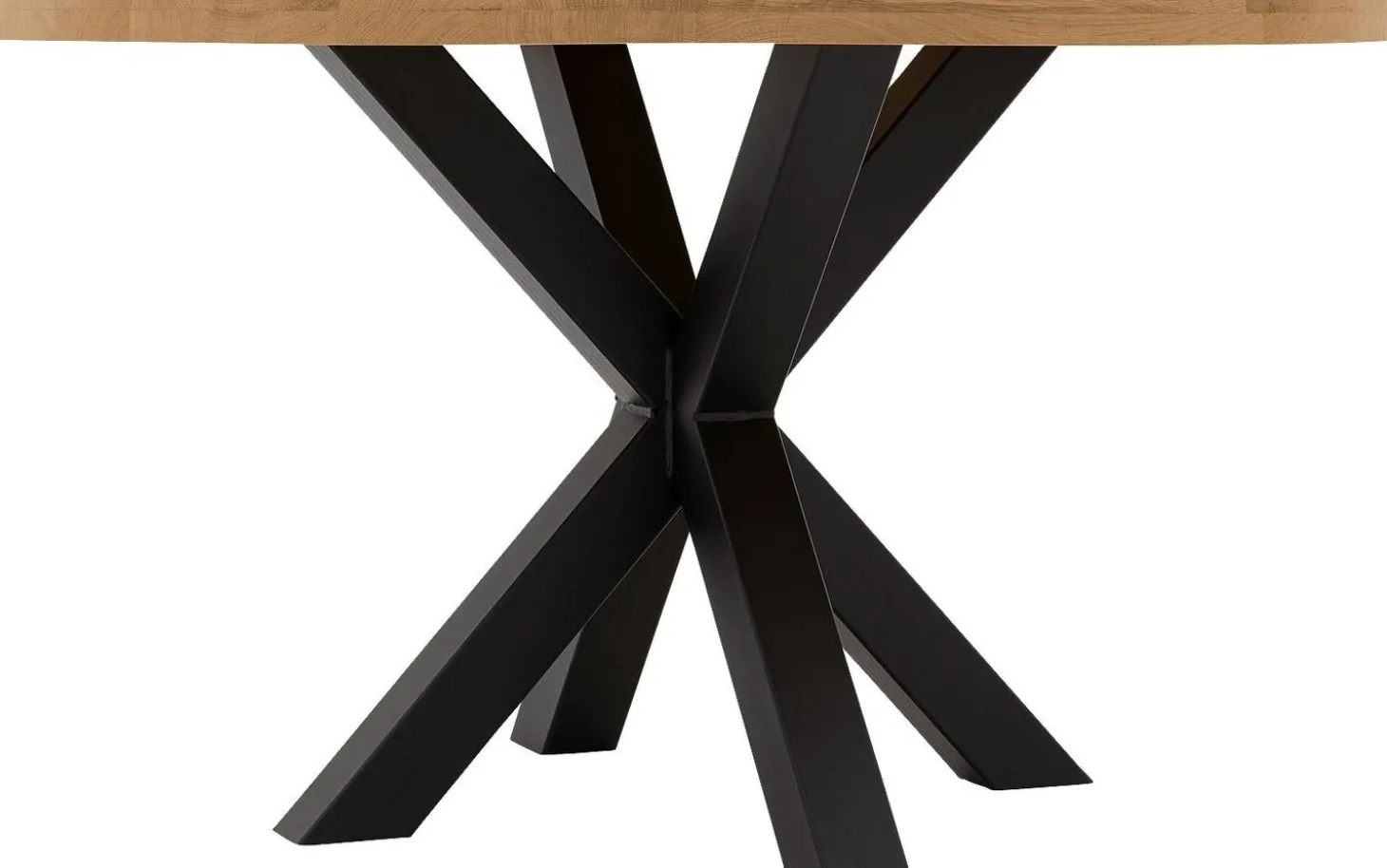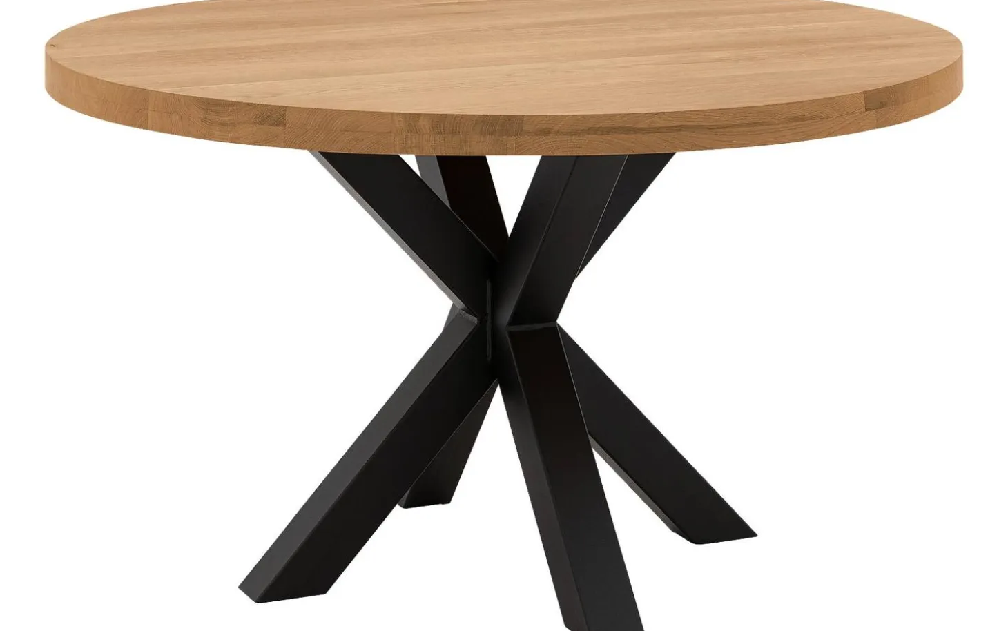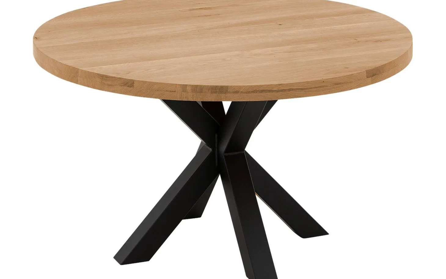 Esstisch Blade hat eine runde Form, die perfekt zu einem urban industriellen Stil passt. Das Kreuzfußgestell aus schwarzem Metall verleiht dem Tisch Charakter, während die helle Eichenholzplatte für Wärme sorgt. Ideal für gemütliches Tafeln mit der Familie.