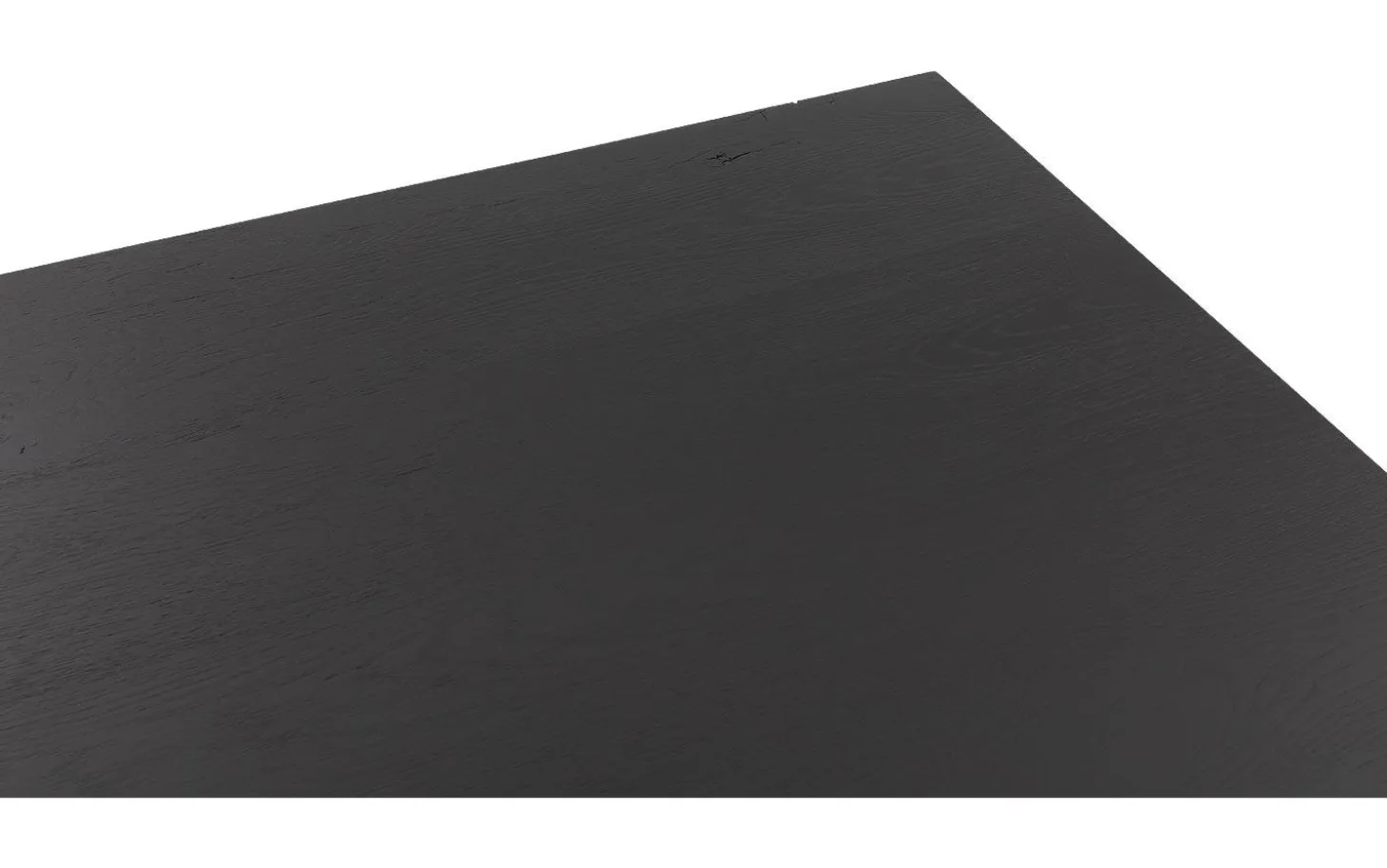 Die Tischplatte ist aus nachhaltigem Eichenholz mit einer geraden Kantenverarbeitung von 6 cm Dicke gefertigt. Der Soft-Touch-Lack bewahrt die natürliche matte Ausstrahlung und lässt die Holzmaserung schön sichtbar. Dank Verstärkungsprofilen an der Unterseite behält die Platte immer ihre Form.