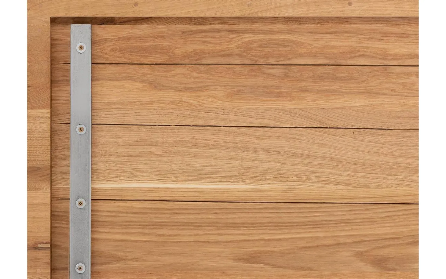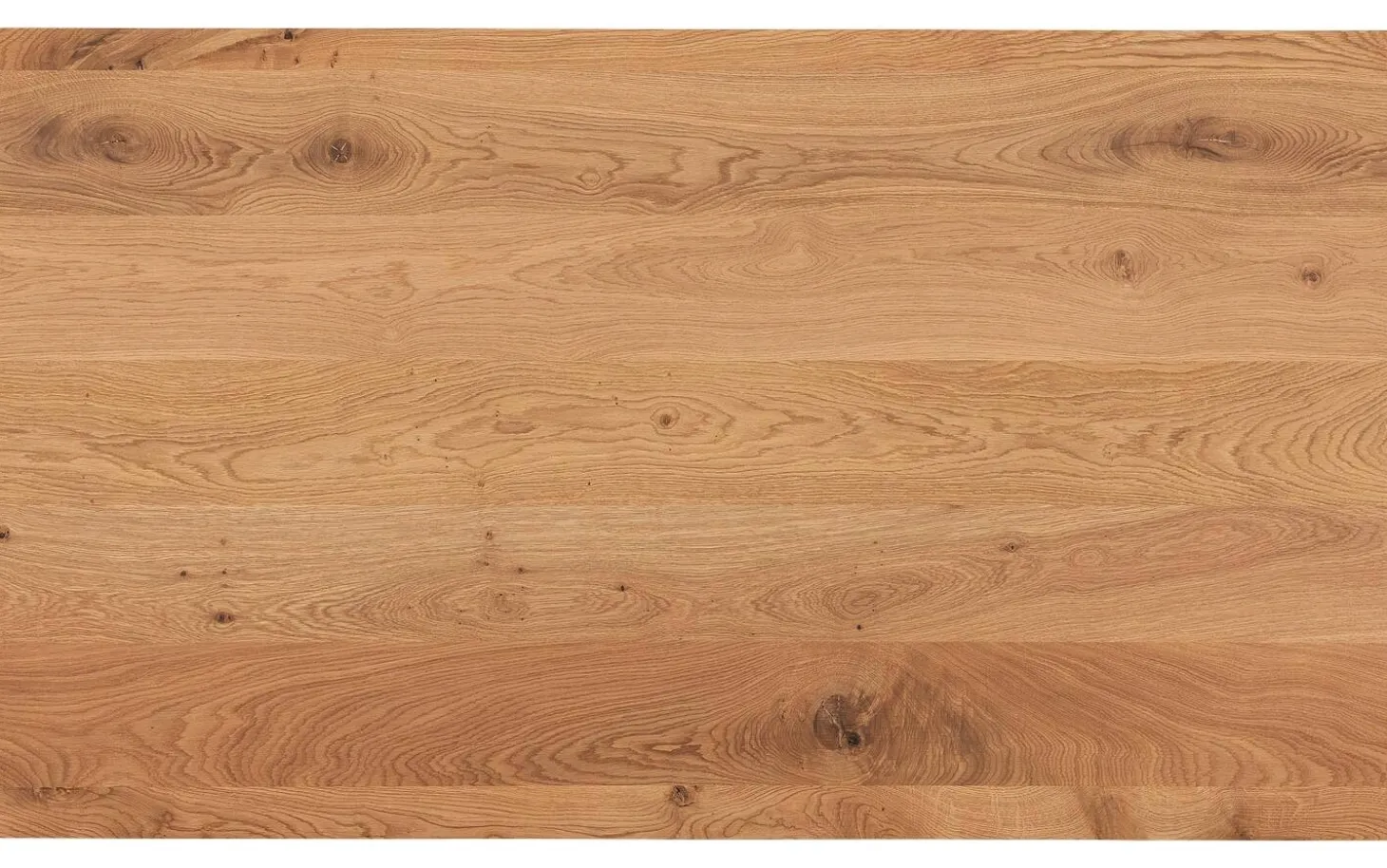 Die helle Eichenholz-Tischplatte ist mit Soft-Touch-Lack veredelt, wodurch die natürliche matte Ausstrahlung erhalten bleibt. Die Maserung bleibt sichtbar und fühlbar, während der Lack vor Kratzern und Ringen schützt. Das gerade Tischblatt hat eine Dicke von 6 cm und eine klare Kantenverarbeitung.