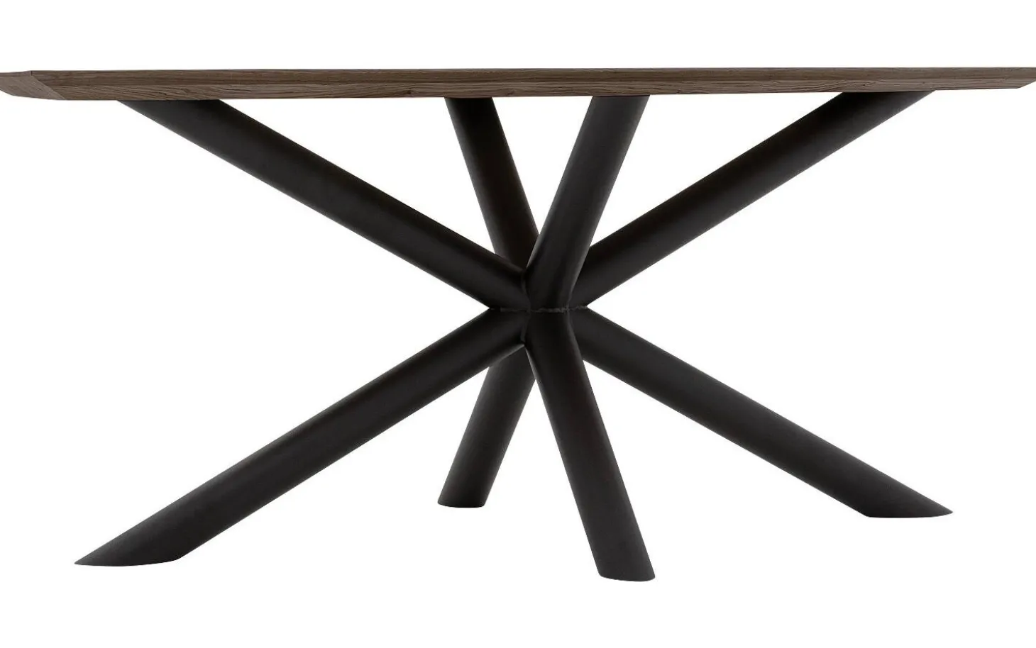 Das schwarze Kreuzfuß-Untergestell aus runden Rohren sorgt für Stabilität und eine robuste Ausstrahlung. Durch die Verjüngung der Platte entsteht ein eleganter und zeitloser Look, der sich leicht mit verschiedenen Einrichtungsstilen kombinieren lässt.