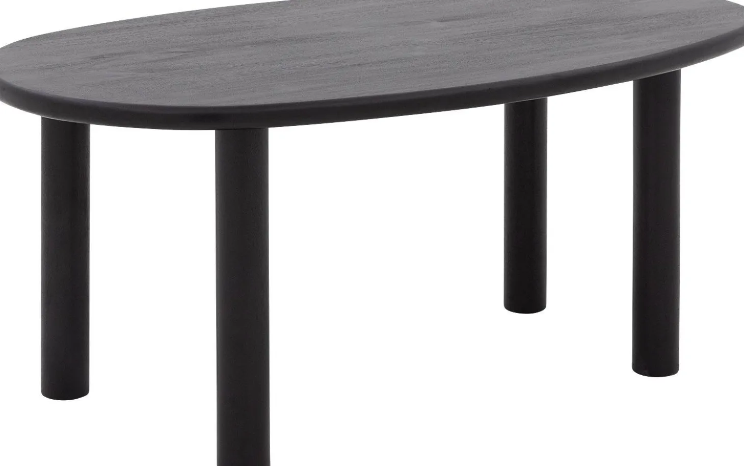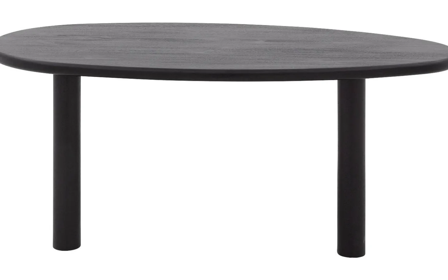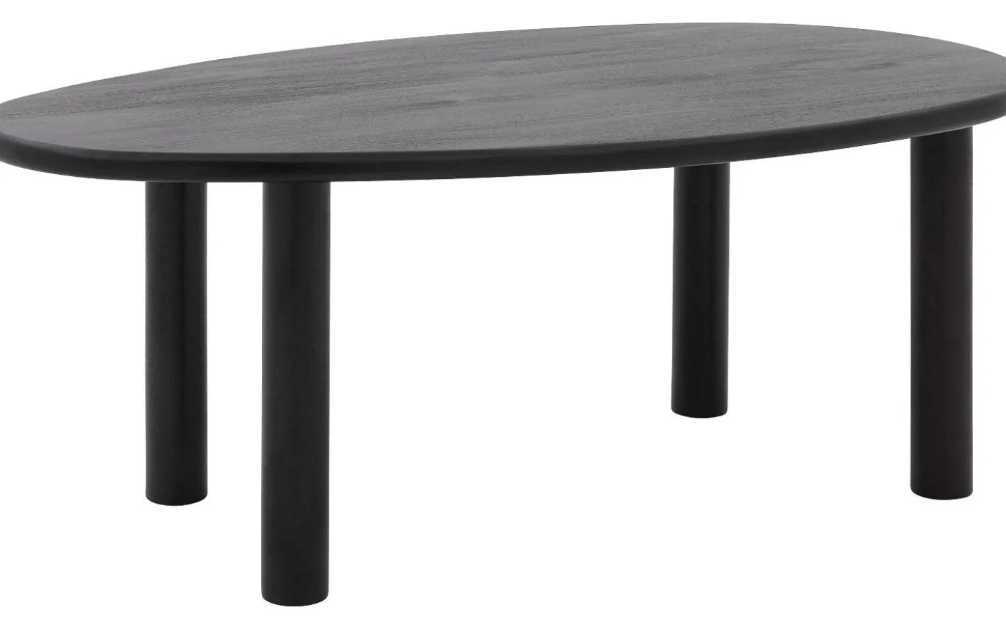 Die Tischplatte ist aus robustem Mangoholz mit einer schwarz lackierten Oberfläche gefertigt. Diese Lackschicht schützt vor Flecken und Ringen und hält das Holz schön. Die organische Form verleiht jeder Ecke der Platte eine natürliche, weiche Ausstrahlung.