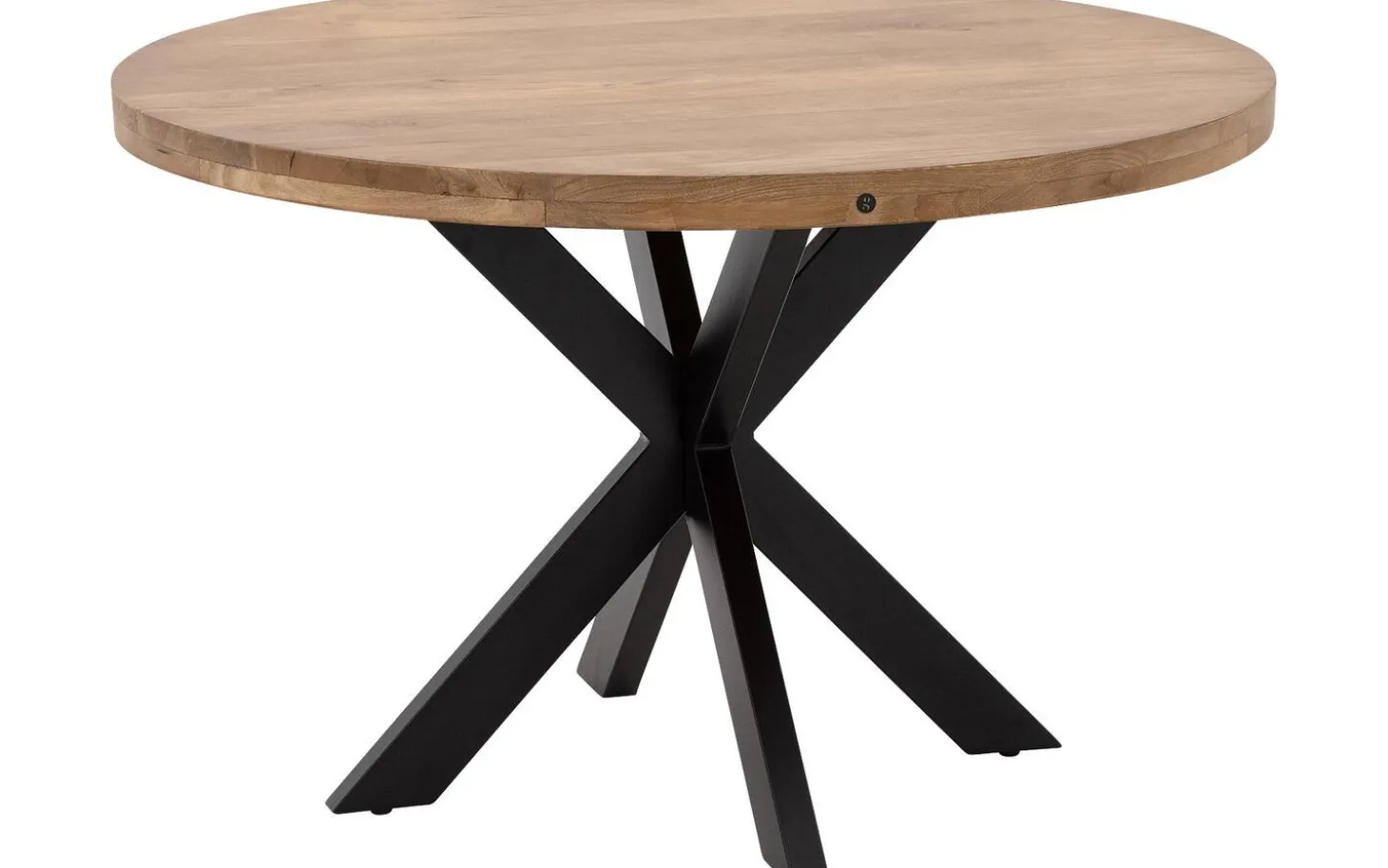 Eettafel Lecce heeft een ronde vorm die uitnodigt tot contact en verbinding. Met een diameter van 120 cm biedt de tafel ruimte voor 4 personen. De kruispoot van zwart gepoedercoat metaal vormt een krachtige basis. Het mangohouten blad in natuurlijke houtkleur met gelakte afwerking geeft het geheel warmte en karakter.
