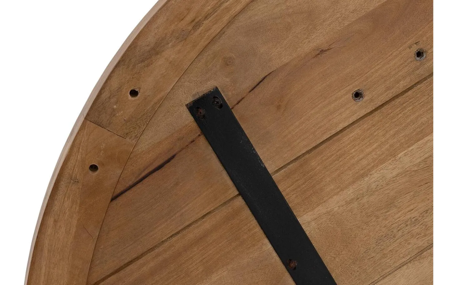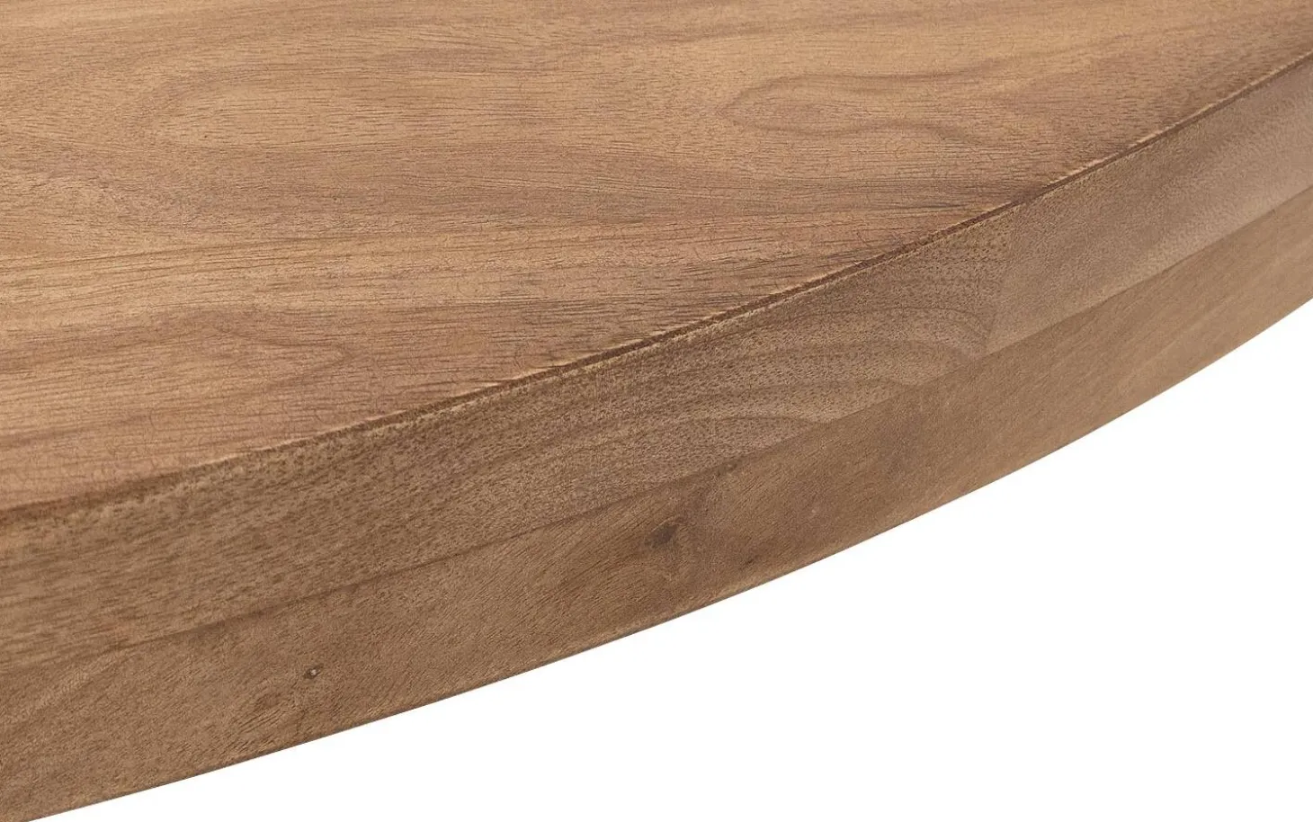 Het tafelblad van mangohout is afgewerkt met een transparante laklaag die de natuurlijke houtkleur en nerven mooi behoudt. De gelakte afwerking beschermt het hout en maakt onderhoud eenvoudig. De ronde vorm met zachte ronding maakt de tafel uitnodigend en comfortabel.