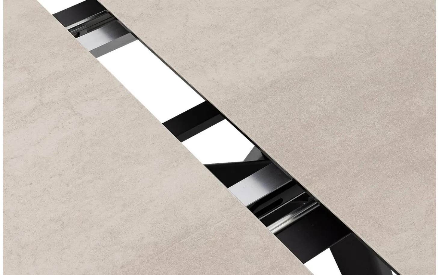 Das Kreuzgestell aus schwarzem Metall sorgt nicht nur für Stabilität, sondern verleiht auch dem Ganzen Charakter. Das Ausziehsystem funktioniert reibungslos und vergrößert den Tisch um 50 Zentimeter – so haben Sie immer genug Platz am Tisch.