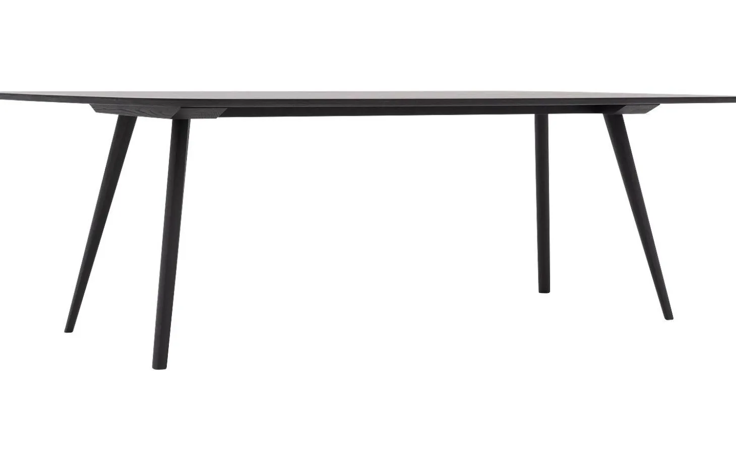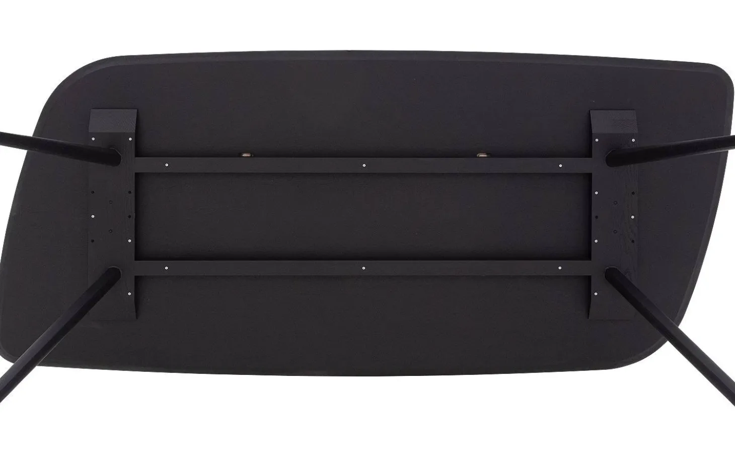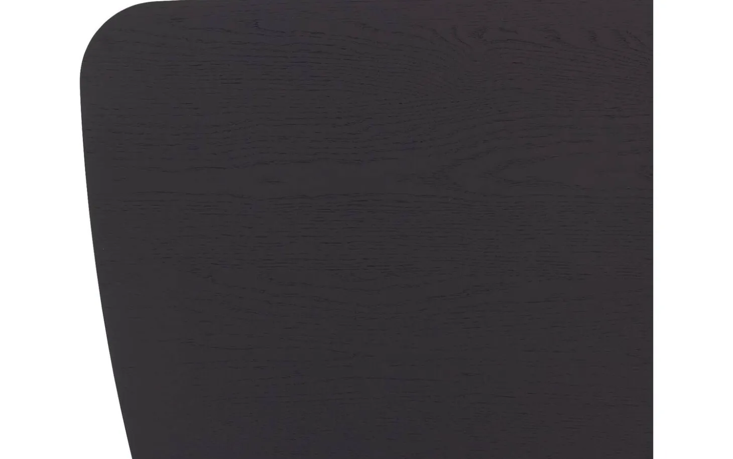 Die Eichenholzplatte ist mit Soft-Touch-Lack in Schwarz RAL 9005 veredelt. Diese Lackschicht schützt das Holz vor Ringen und Kratzern, während die natürliche Struktur fühlbar bleibt. Die dunkle Farbe verleiht Ihrem Esszimmer Wärme und Charakter.