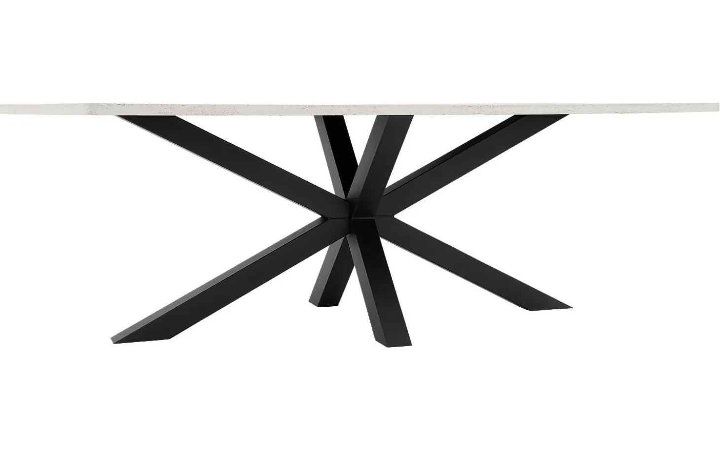Das Kreuzgestell aus schwarzem Stahl verleiht Stabilität und ein kraftvolles Statement. Durch die clevere Konstruktion haben Sie reichlich Beinfreiheit. Die gerade Kantenverarbeitung hält das Design klar und zeitlos.