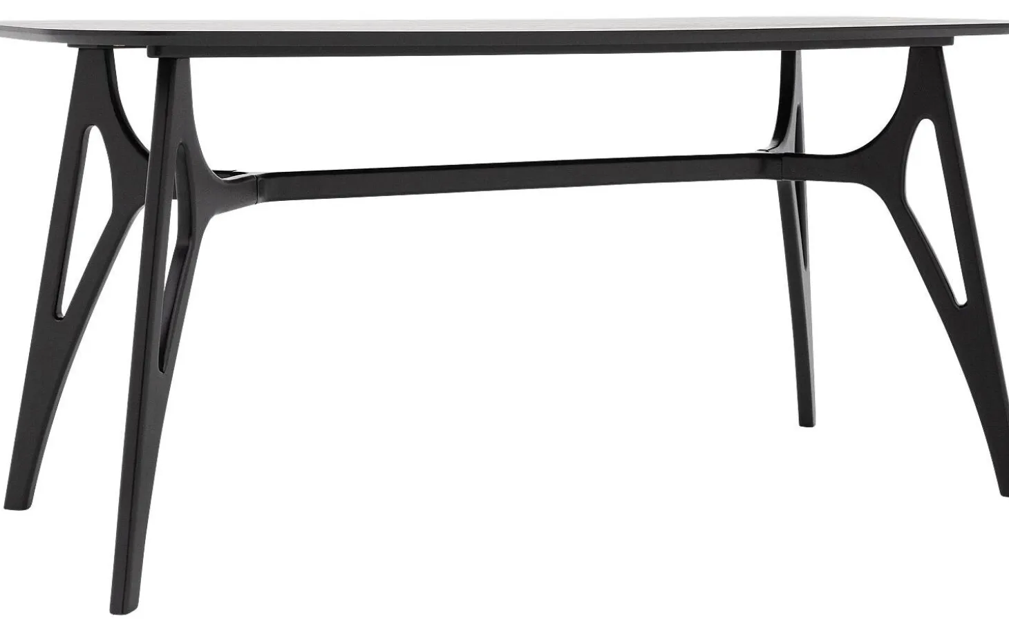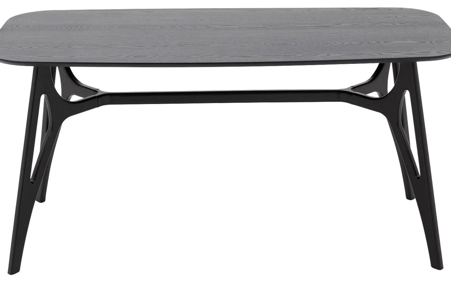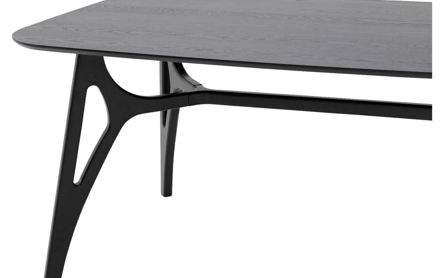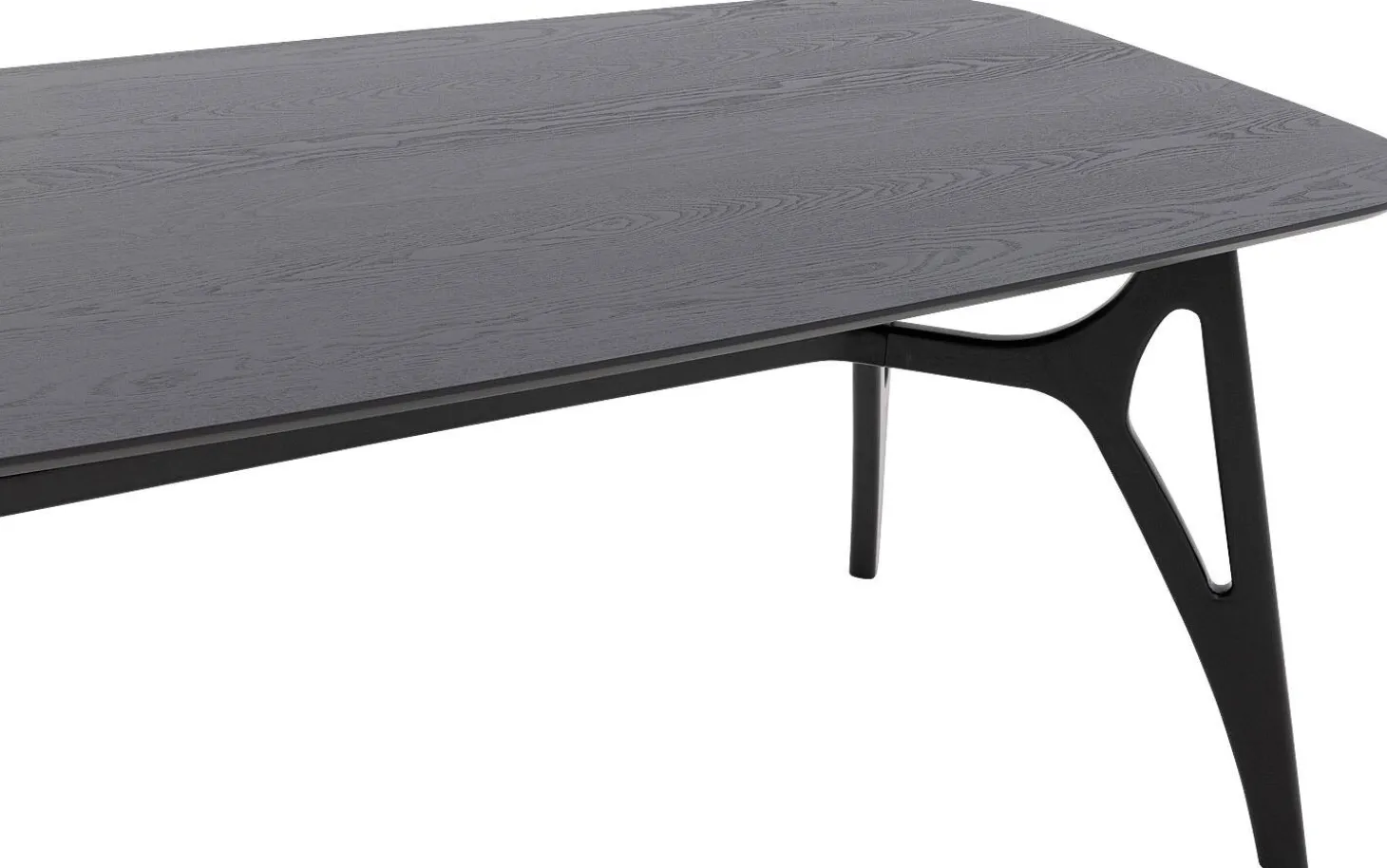 Die Tischplatte aus Eschenholz ist mit einer schwarzen Lackschicht veredelt, die Schutz vor Flecken und Ringen bietet. Der natürliche Holzcharakter bleibt unter der lackierten Oberfläche schön sichtbar. Die rechteckige Form mit geraden Kanten sorgt für eine moderne, zeitlose Ausstrahlung.