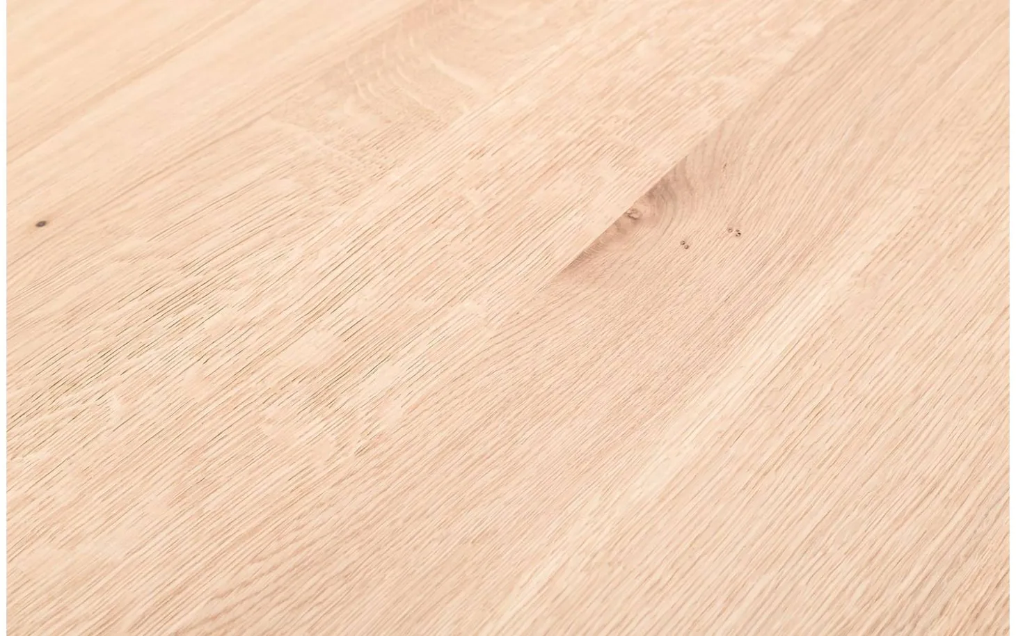 Die helle Eichenholz-Platte hat eine gerade Tischkante und ist mit Soft-Touch-Lack veredelt. Diese Schutzschicht hält die natürliche matte Ausstrahlung intakt und sorgt für weniger Gefahr von Ringen und Kratzern. Die Maserung bleibt schön sichtbar und fühlbar.