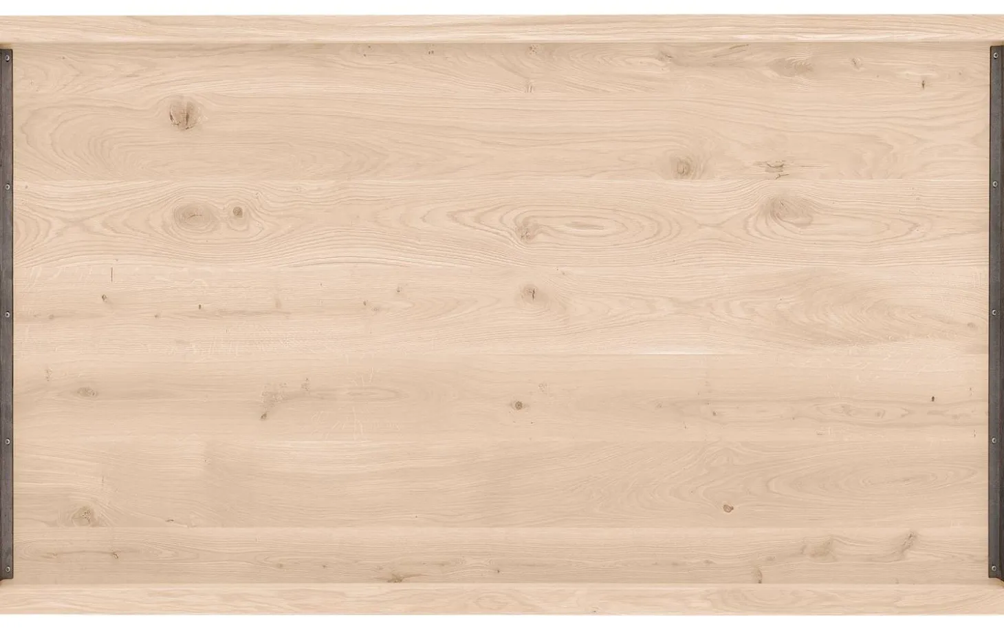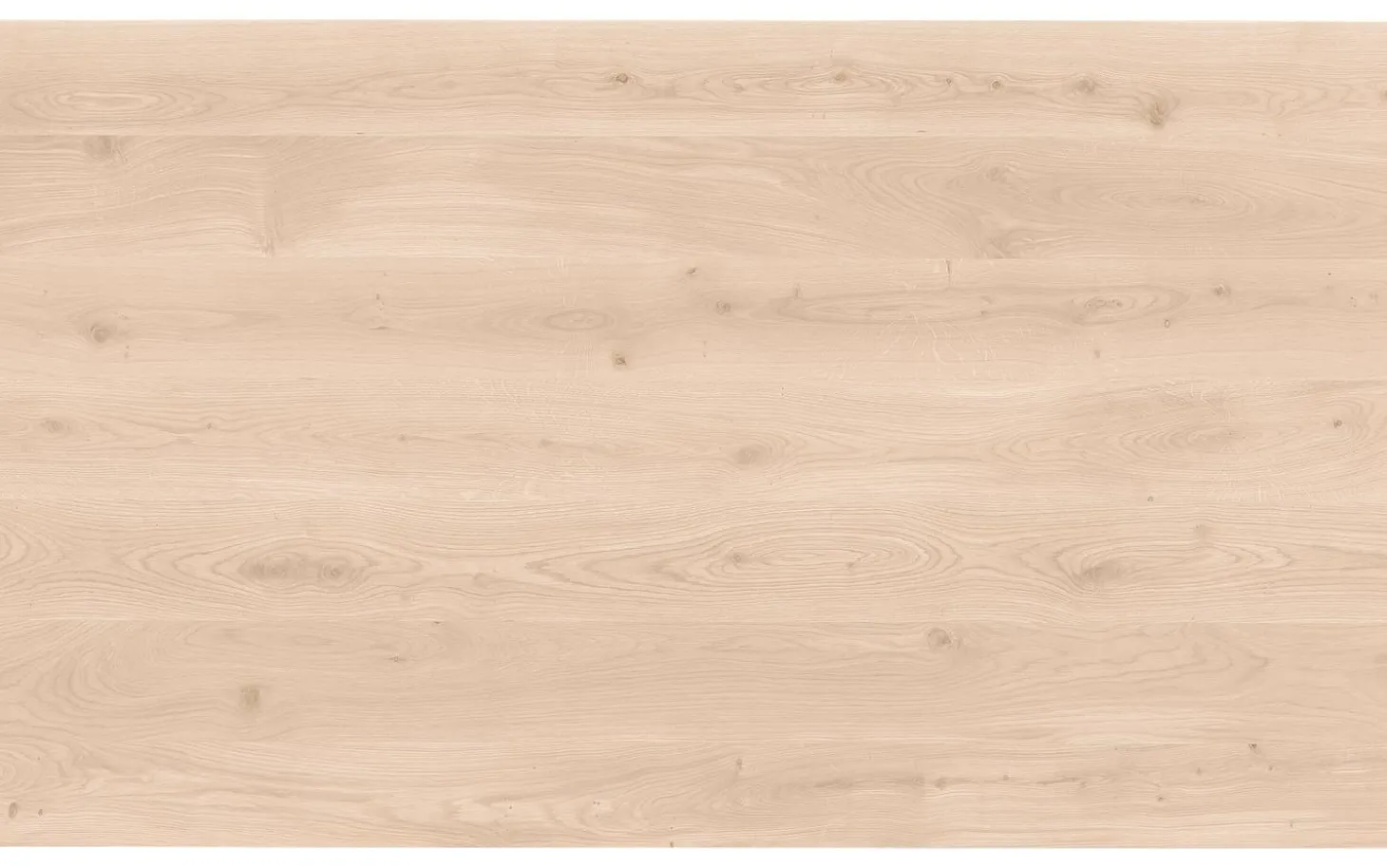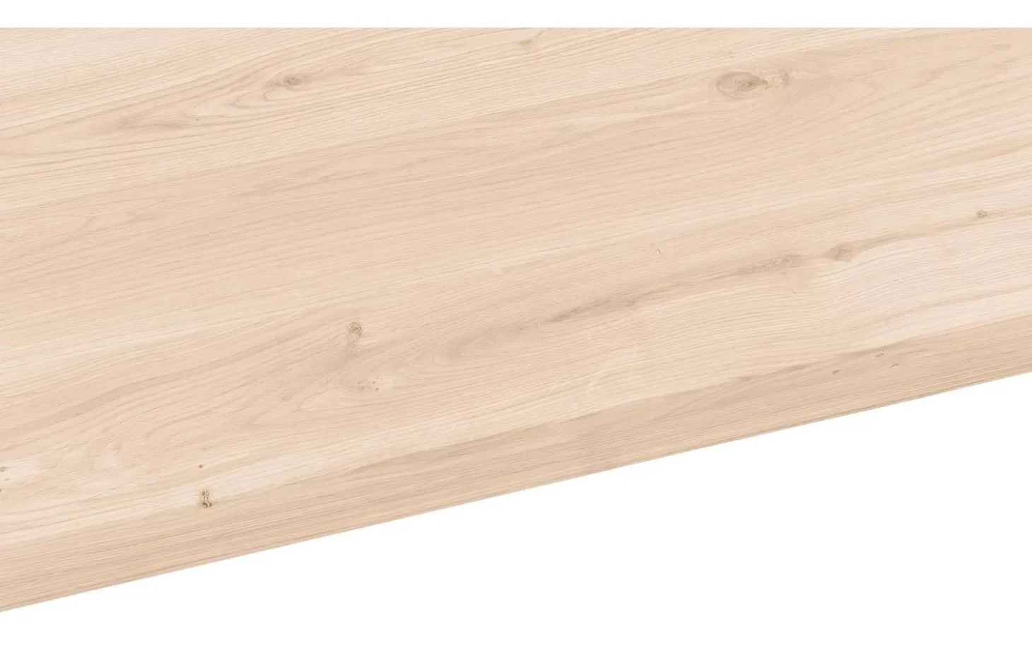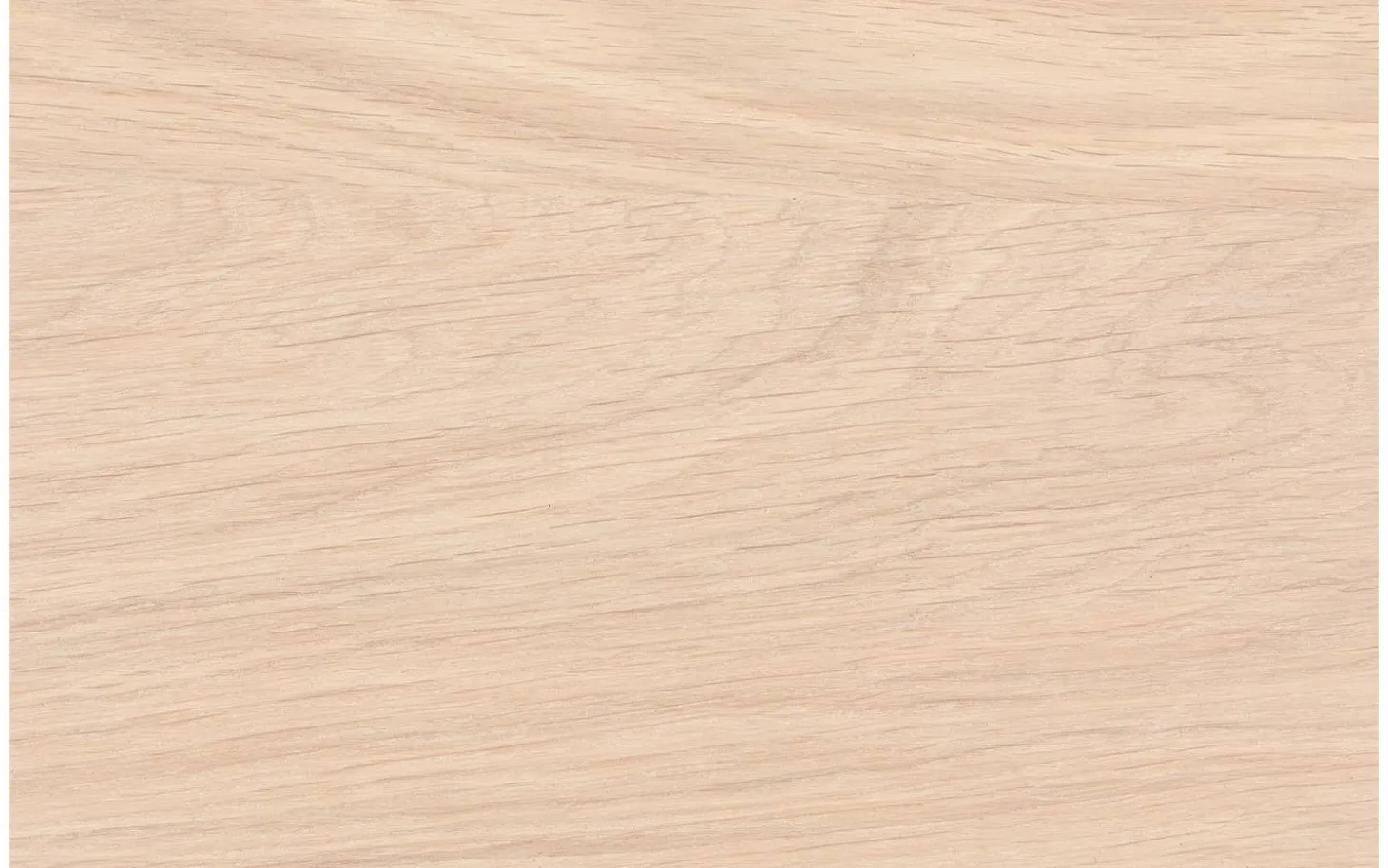 Die weiße Eichenplatte hat eine Dicke von 6 cm mit geraden Tischkanten für einen klaren Look. Die lackierte Oberfläche hält die natürlichen Maserungen sichtbar und fühlbar, während das Holz vor täglichem Gebrauch geschützt wird.