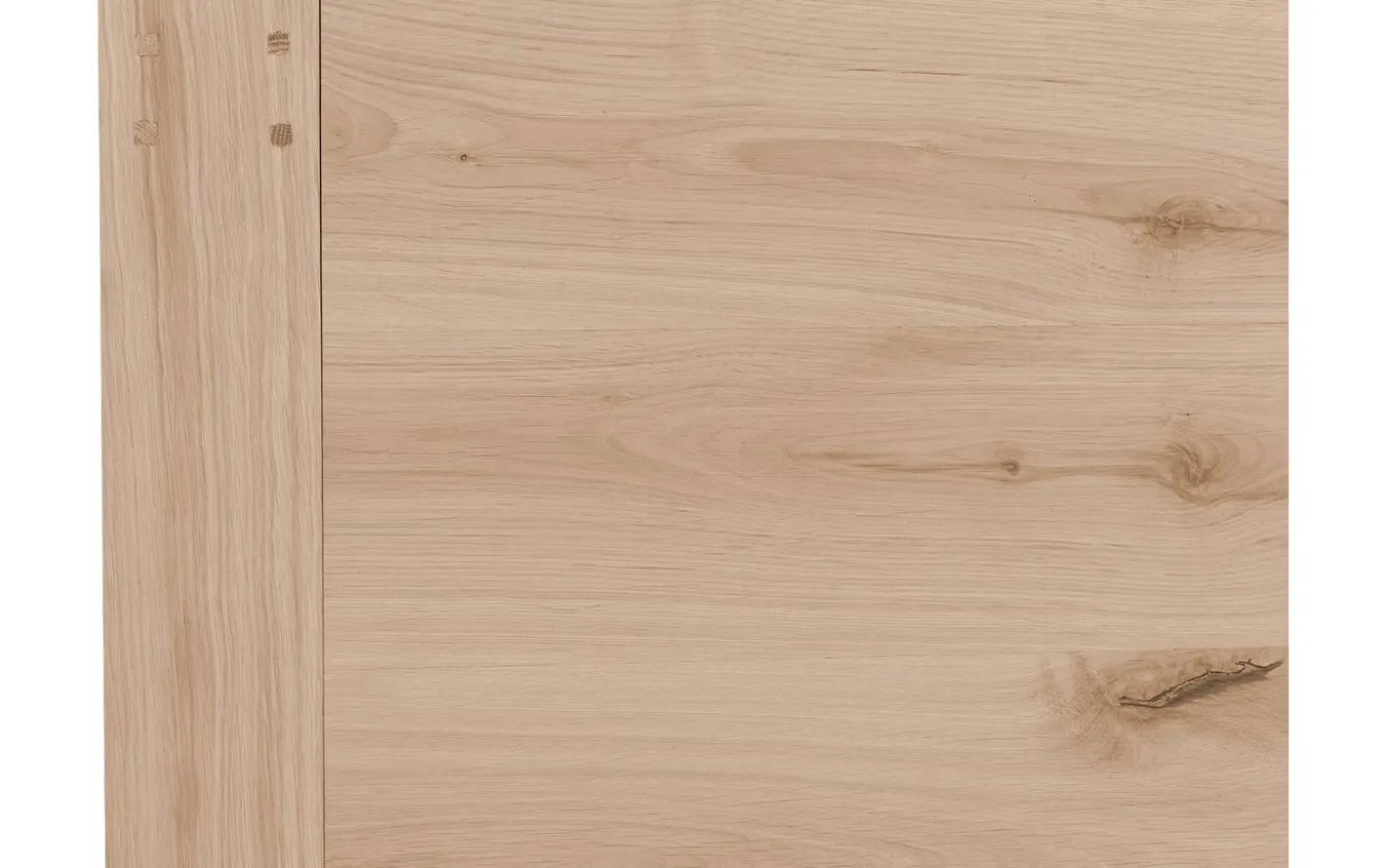 Die Tischplatte ist aus stabilem Eichenholz mit einer Soft-Touch-Lack-Oberfläche gefertigt. Diese schützende Lackschicht hält die matte Ausstrahlung intakt, während die Holzmaserung sichtbar und fühlbar bleibt. Die hellen Äste im Holz sorgen für einen authentischen Charakter.