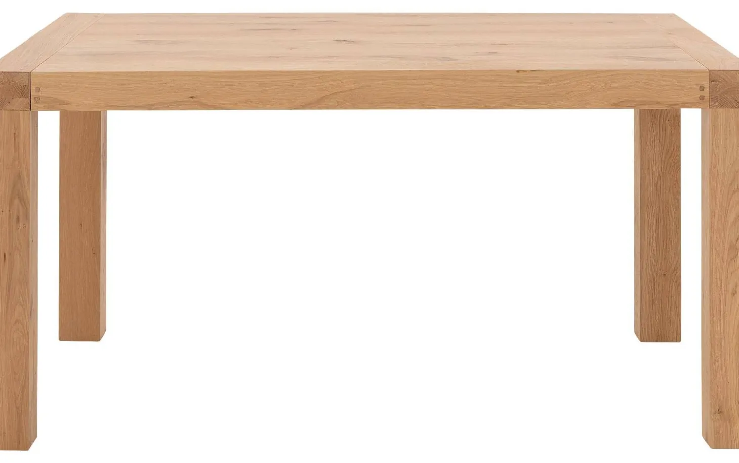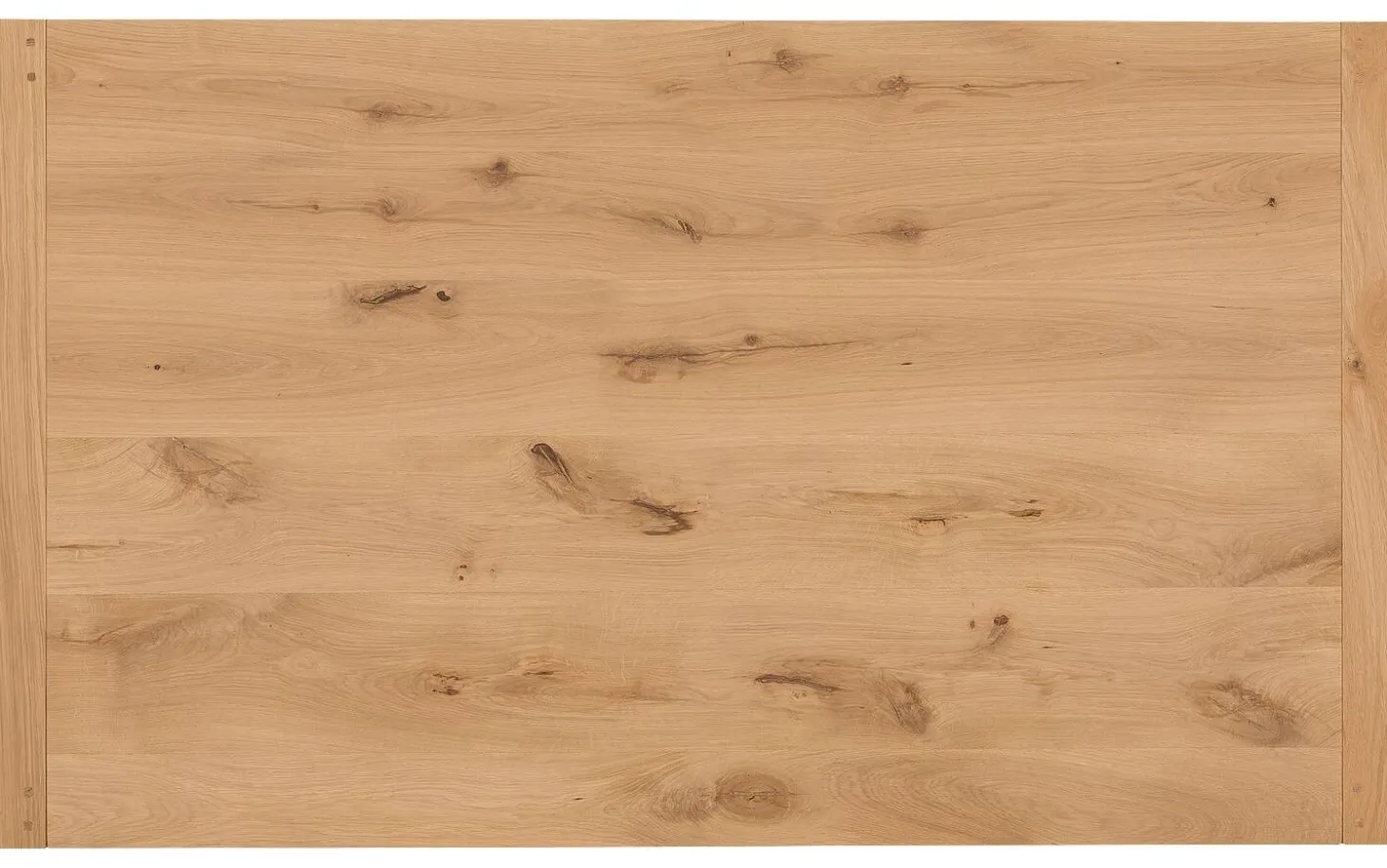 Die Tischplatte aus massivem Eichenholz ist mit Soft-Touch-Lack behandelt, wodurch die natürliche Maserung sichtbar und fühlbar bleibt. Diese Veredelung schützt vor Flecken und Kratzern, während das Holz seinen authentischen Charakter behält.