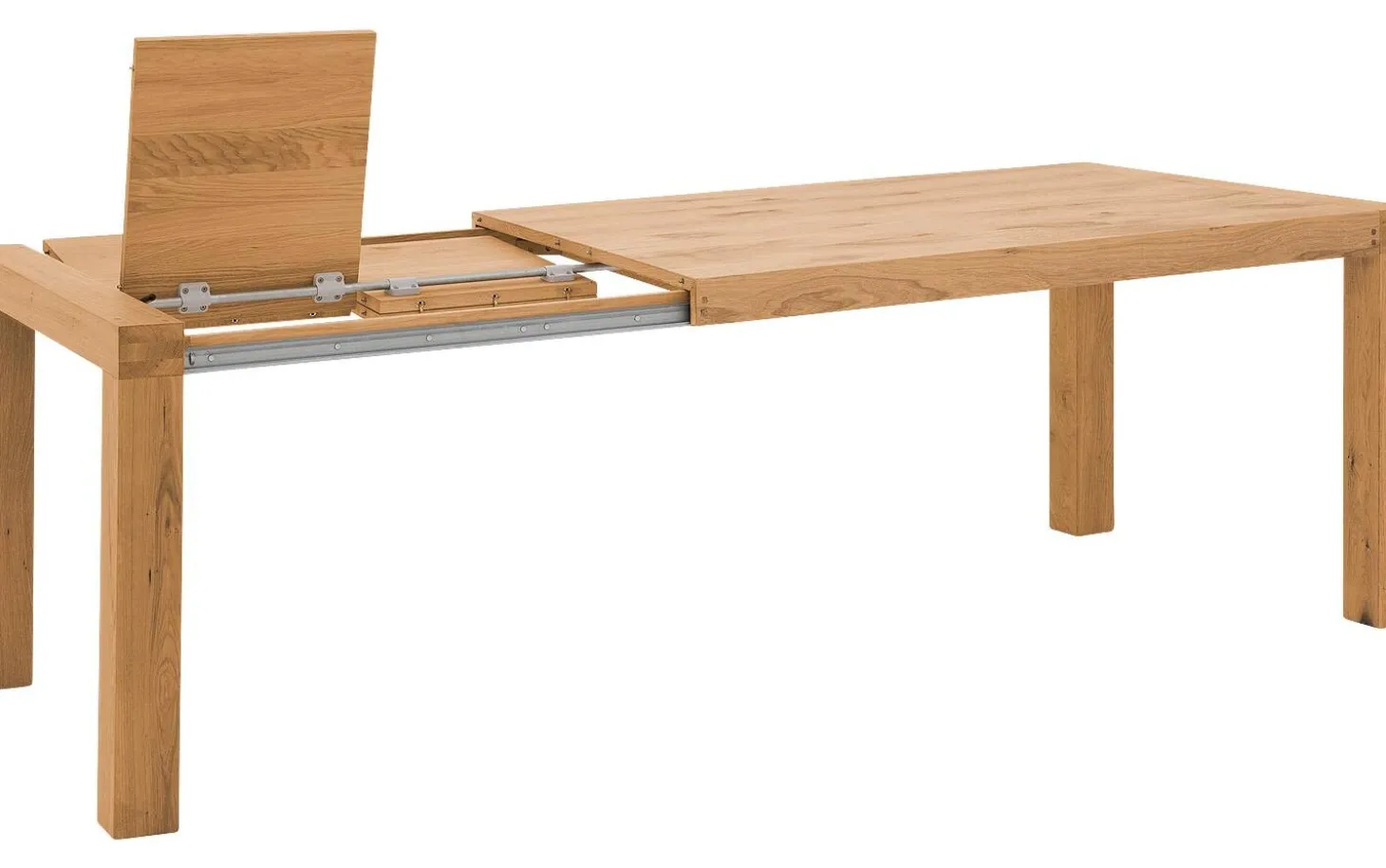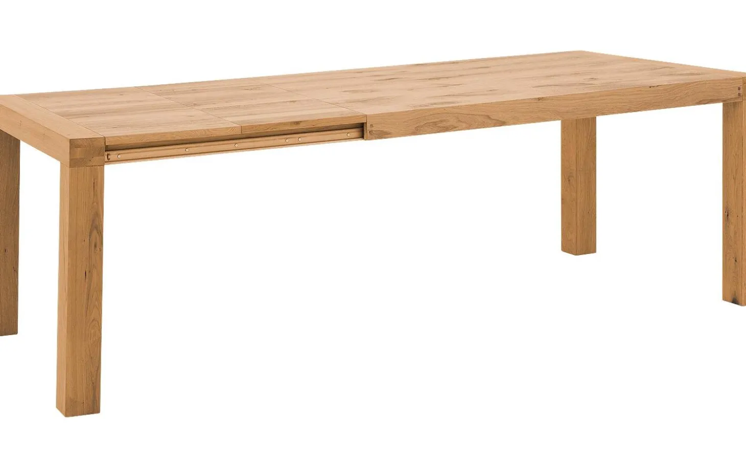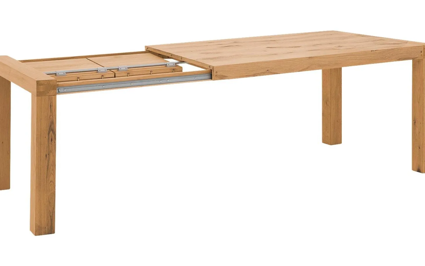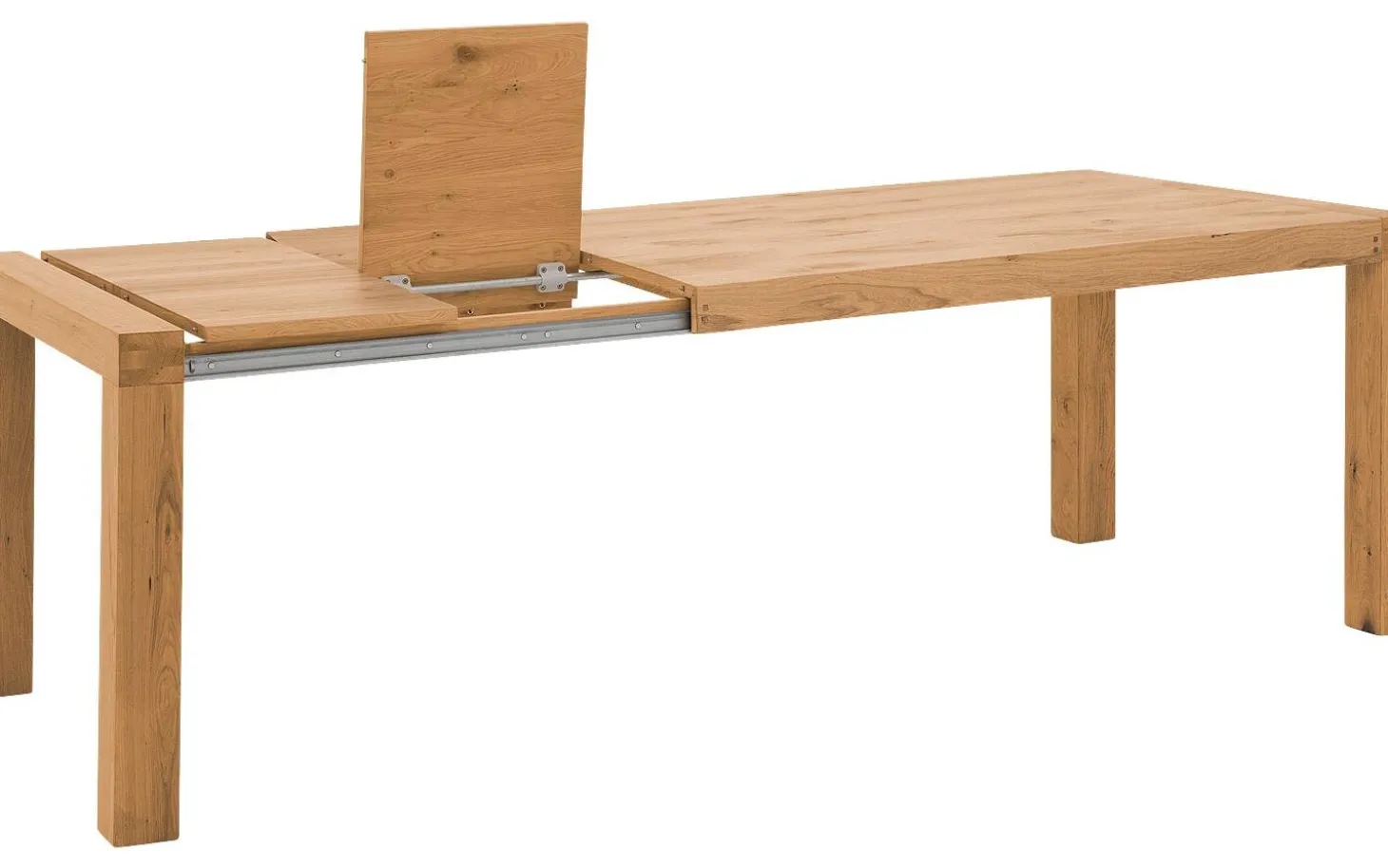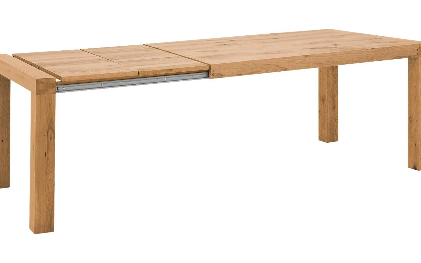 Das Ausziehsystem besteht aus zwei Teilen von 40 cm, die unter der Platte verstaut werden. Dank integrierter Rollen in den Beinen ziehen Sie den Tisch mühelos aus. Die quadratischen Beine laufen durch die Platte hindurch und geben zusätzliche Stabilität.