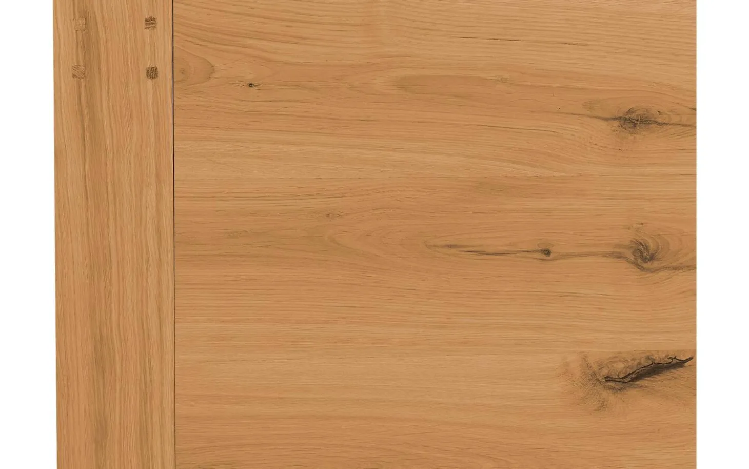 Die Eichenholzplatte hat eine helle Farbe mit sichtbarer Maserung und leichten Ästen für einen authentischen natürlichen Look. Der Soft-Touch-Lack sorgt dafür, dass das Holz fühlbar und sichtbar bleibt, während Sie vor alltäglichen Gebrauchsspuren geschützt sind.