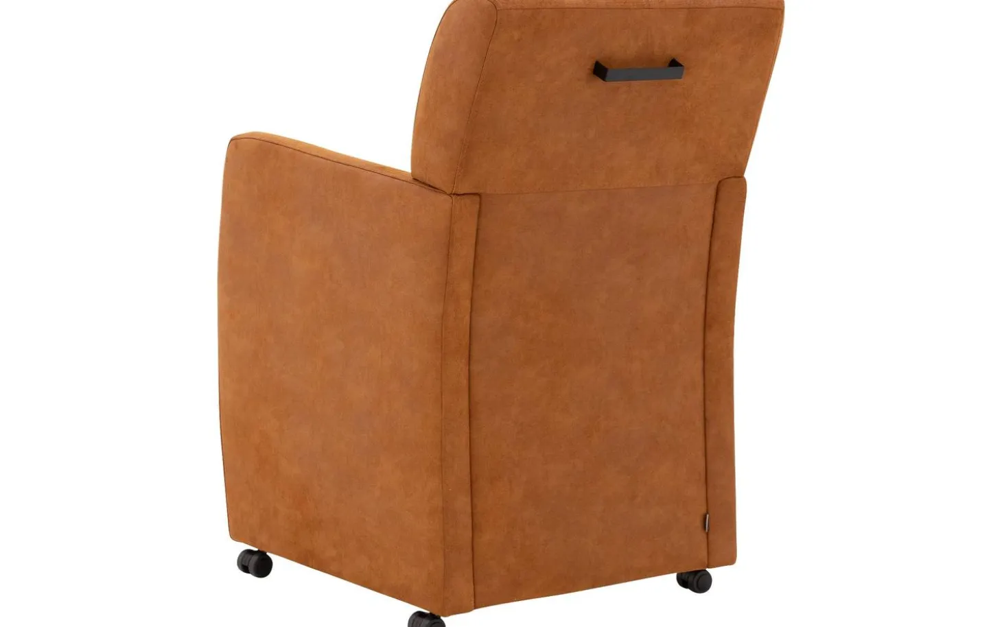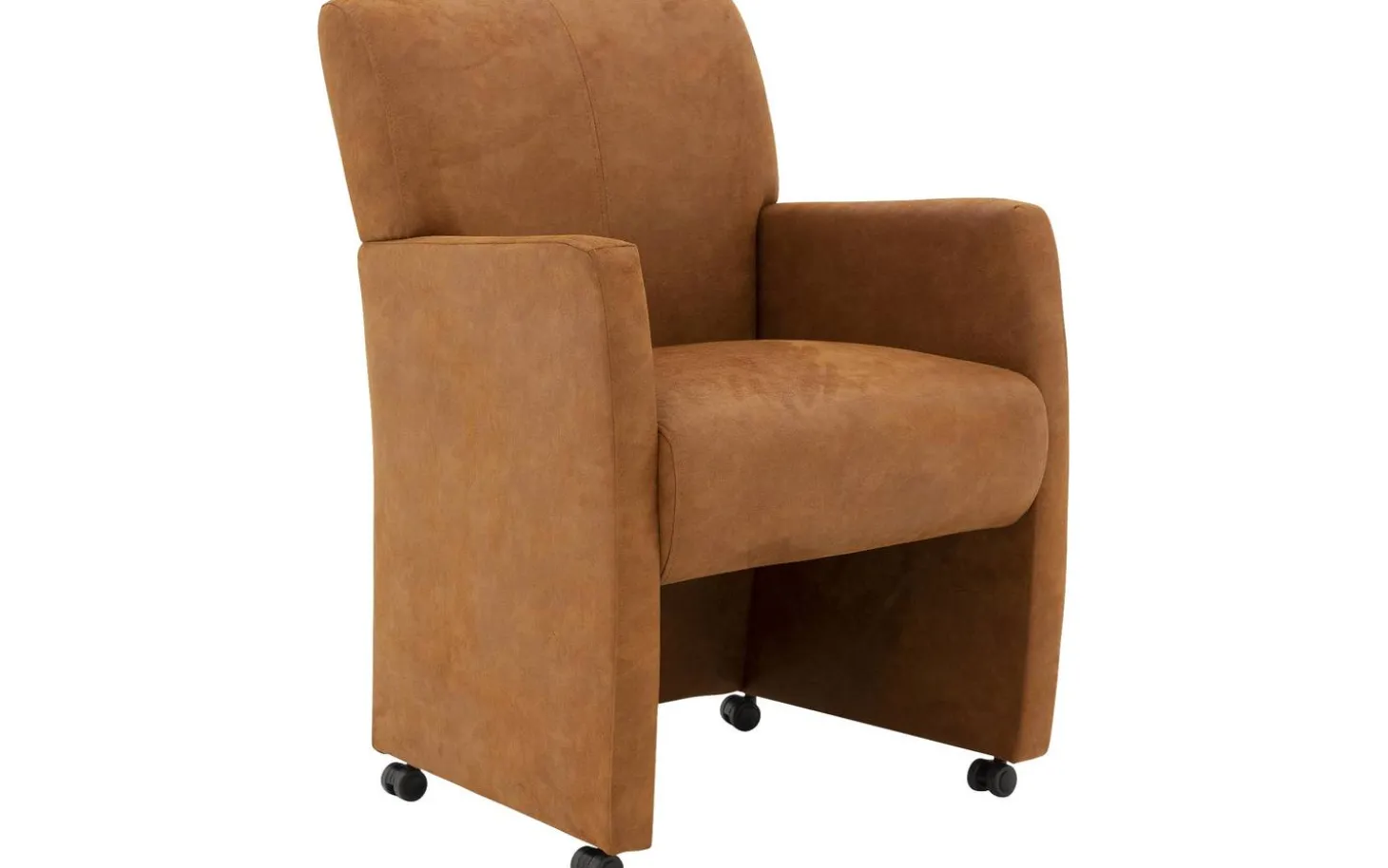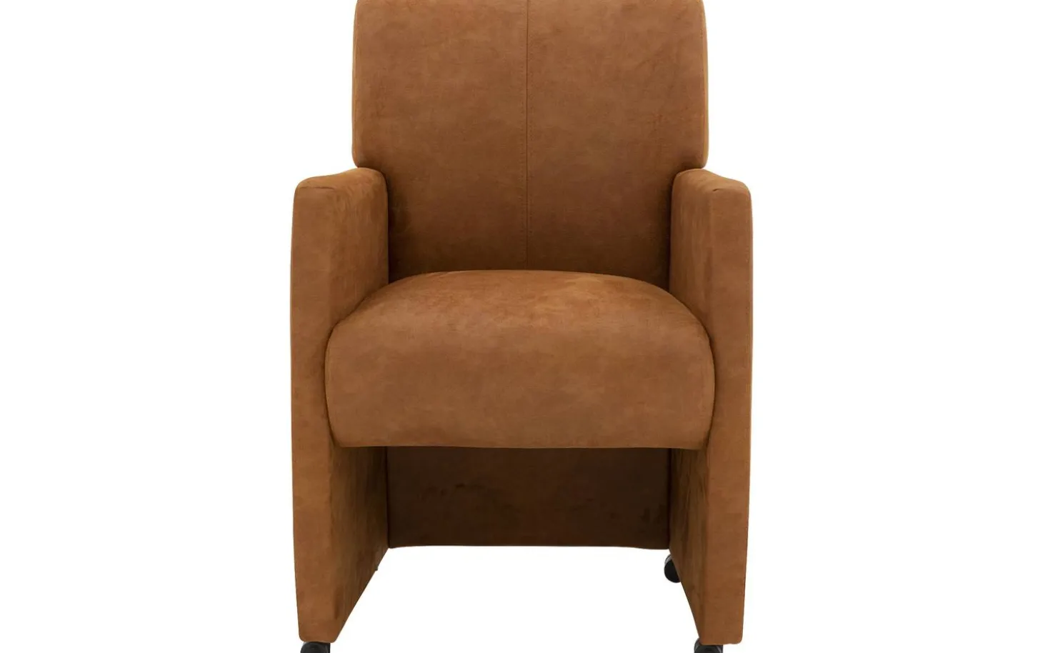 Cognac Esszimmerstuhl Alex mit Armlehne in Mikroleder kombiniert zeitloses Design mit praktischem Komfort. Dieser stilvolle Esszimmerstuhl in warmem Cognacton bringt sofort Atmosphäre in Ihr Esszimmer. Dank der komfortablen Schaumstoffpolsterung, der robusten Nosag-Federung und der praktischen schwarzen Rollen rücken Sie mühelos an den Tisch. Der Griff an der Rückenlehne macht das Verschieben dieses Stuhls besonders praktisch.