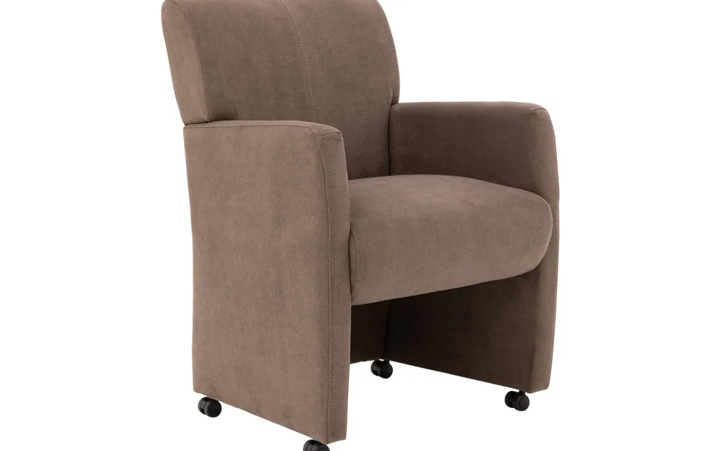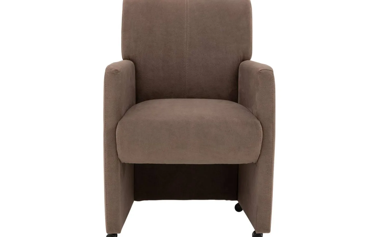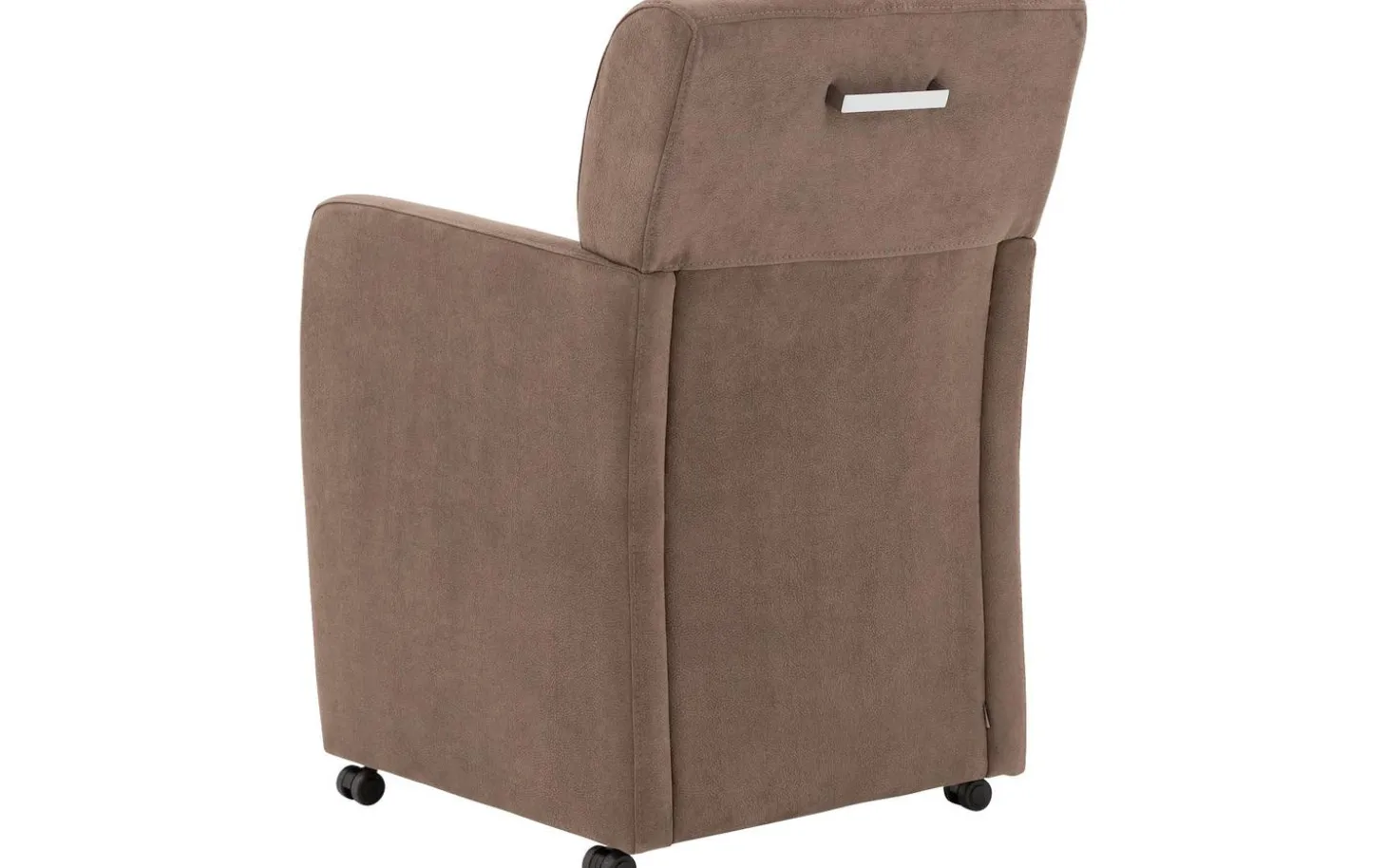 Grauer Esszimmerstuhl Alex mit Armlehne bietet Komfort und Stil während langer Abendessen. Dieser zeitlose Esszimmerstuhl ist mit fein gewebtem mittelgrauem Stoff bezogen, was für eine warme und gemütliche Ausstrahlung in Ihrem Esszimmer sorgt. Dank der praktischen Rollen rücken Sie leicht an den Tisch und stehen wieder geschmeidig auf. Der praktische silberne Griff an der Rückenlehne macht das Verschieben dieses Stuhls zum Kinderspiel.