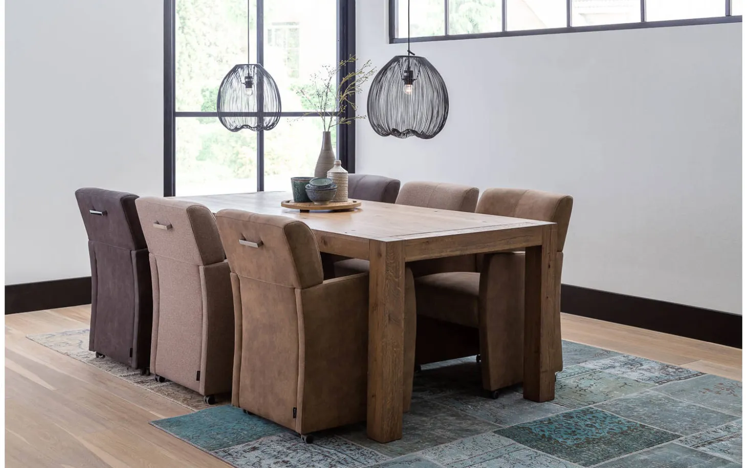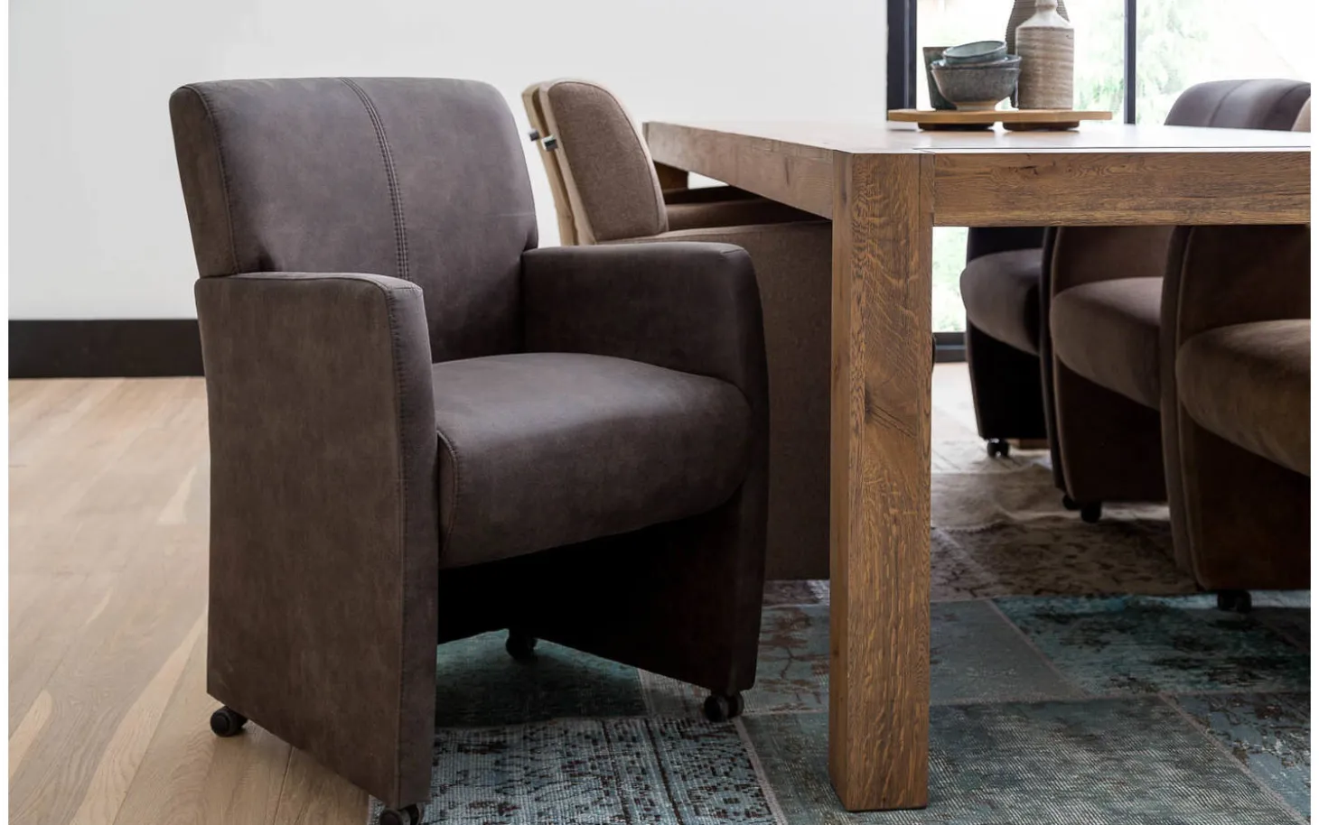 Der Stuhl ist fest gepolstert, was für einen klaren und modernen Look sorgt. Mit den schwarzen Rollen und dem soliden Rahmen ist Esszimmerstuhl Alex nicht nur stilvoll, sondern auch funktional und langlebig. Gemütliches Sitzen bei langen Tischgesprächen oder beim Aperitif wird so deutlich angenehmer.