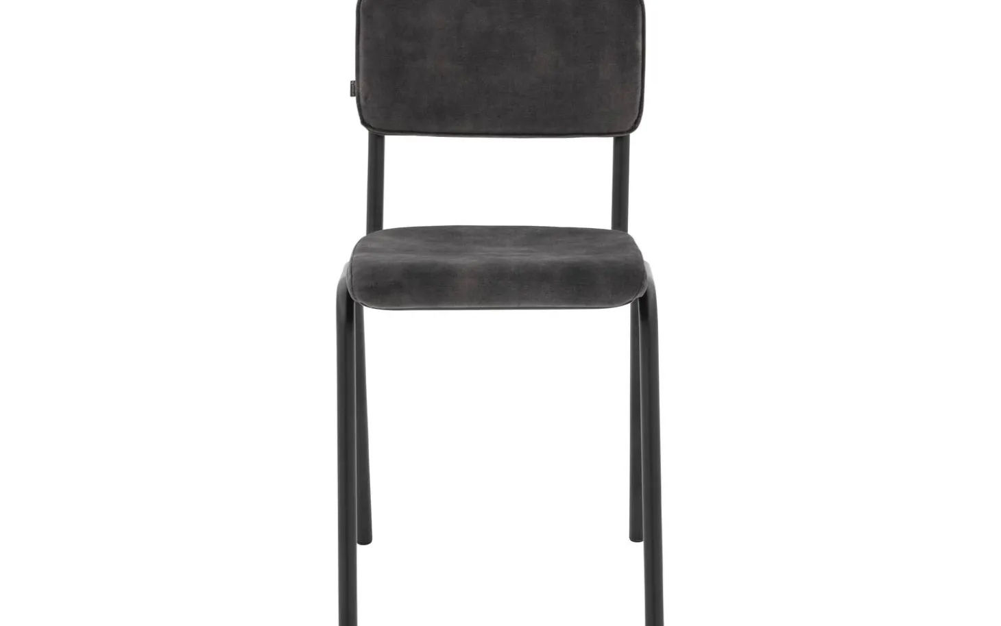 Das schwarze matte Gestell bildet einen schönen Kontrast zur grauen Polsterung und verleiht dem Stuhl einen robusten, industriellen Touch. Ohne Armlehnen nimmt dieser Esszimmerstuhl wenig Platz ein, ideal für kleinere Essbereiche oder wenn Sie mehr Stühle um Ihren Esstisch stellen möchten.