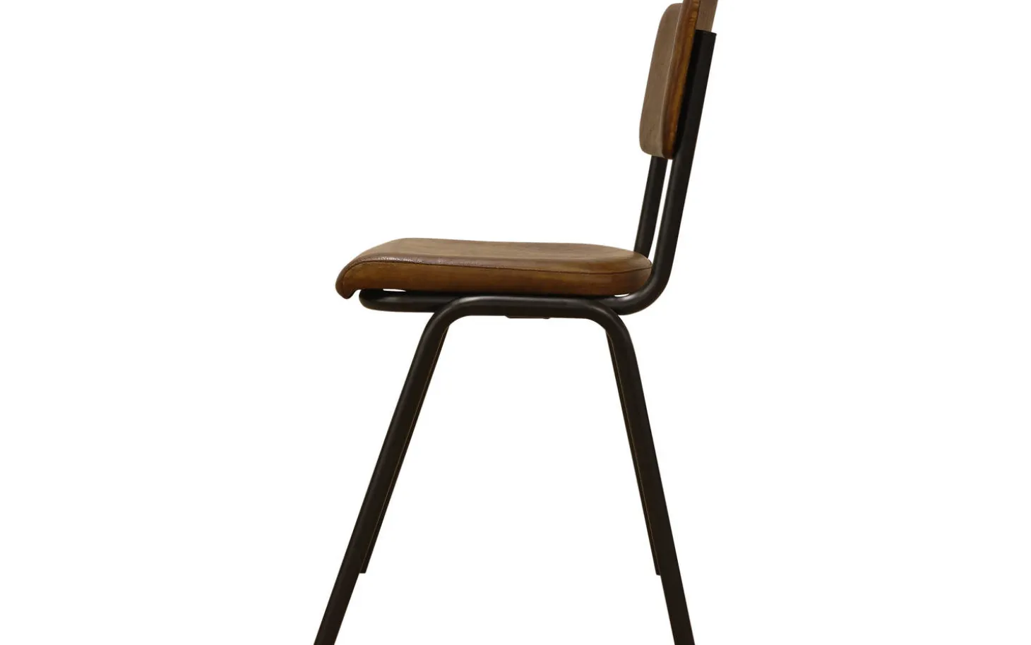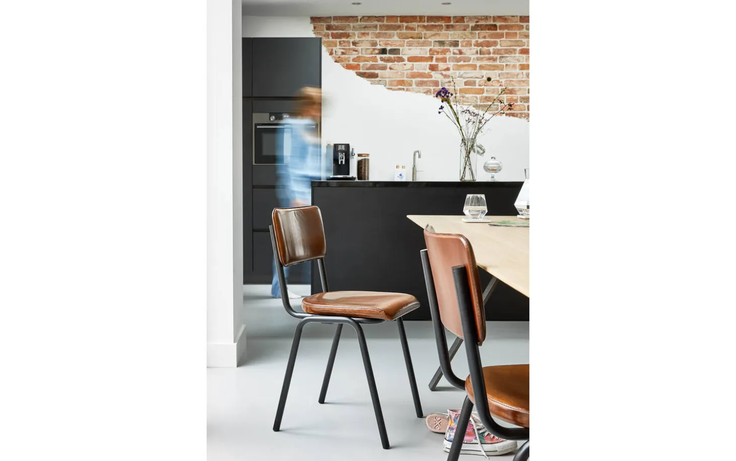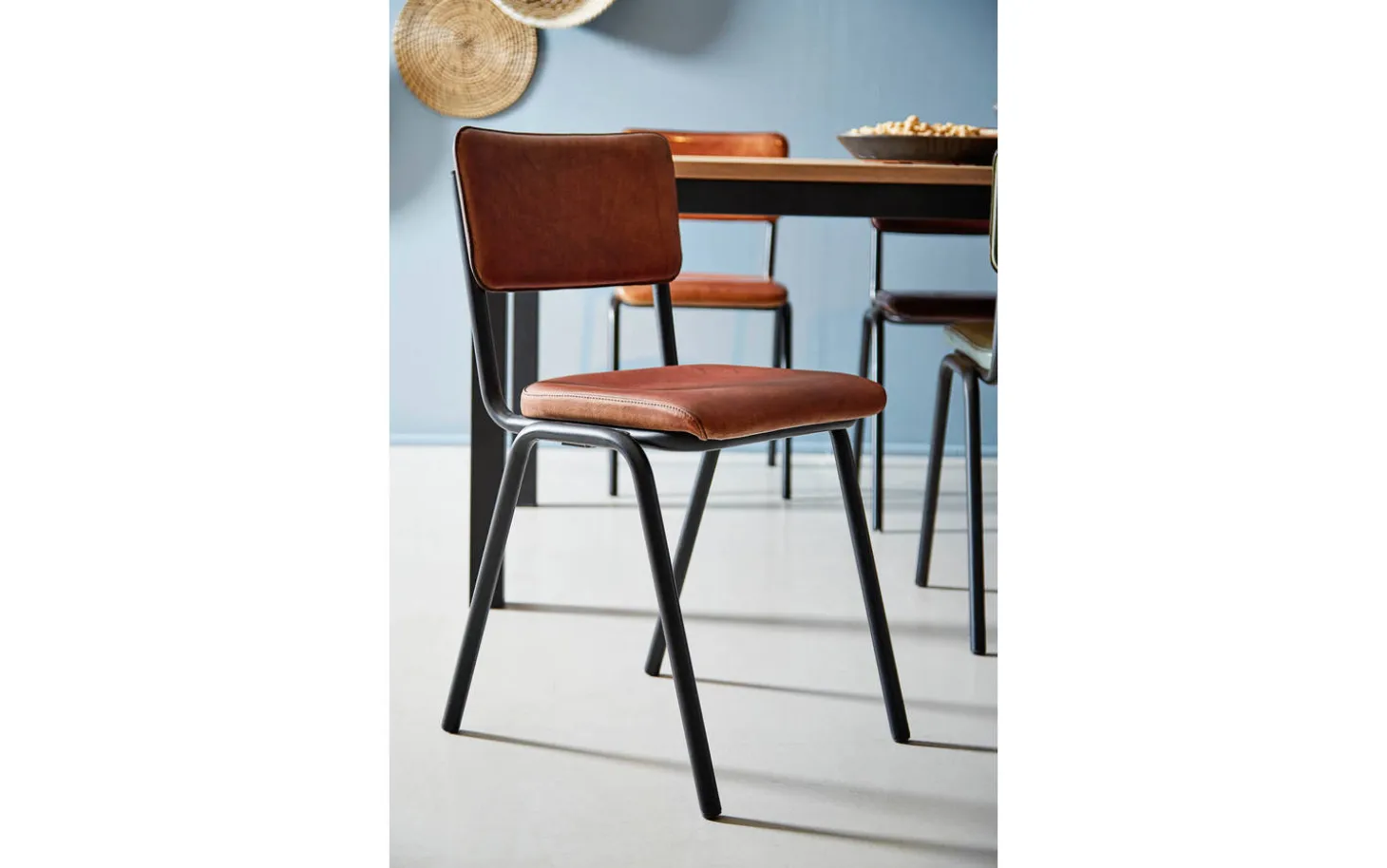 Die schwarzen matten Beine bilden einen schönen Kontrast zum warmen cognacfarbenen Leder. Diese Kombination passt perfekt in ein urbanes industrielles Interieur. Dank der festen Polsterung behält der Stuhl sein schlichtes, modernes Design.