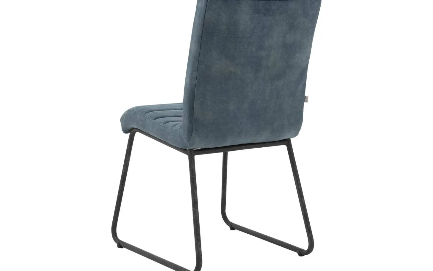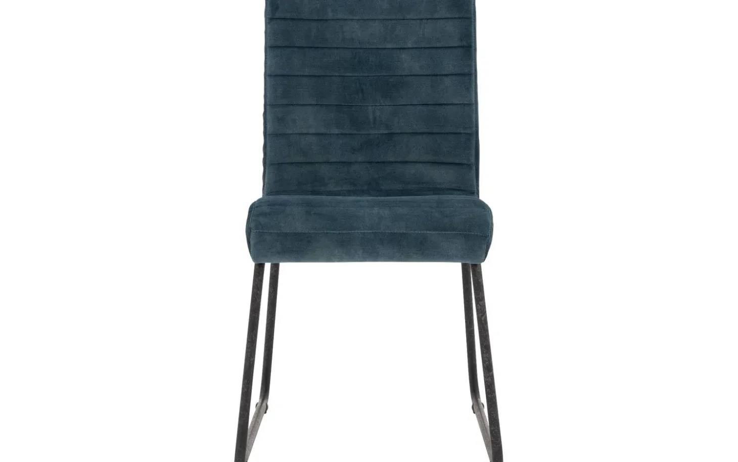 Bekijk eetkamerstoel Dax in een mooie blauwe velours bekleding. Deze blauwe eetkamerstoel zonder armleuning combineert een strakke vormgeving met fijn zitcomfort. De zachte velours stof geeft de stoel een warme en eigentijdse uitstraling, terwijl het zwarte metalen onderstel zorgt voor een stoer accent. Een fijne toevoeging aan je eetkamer!