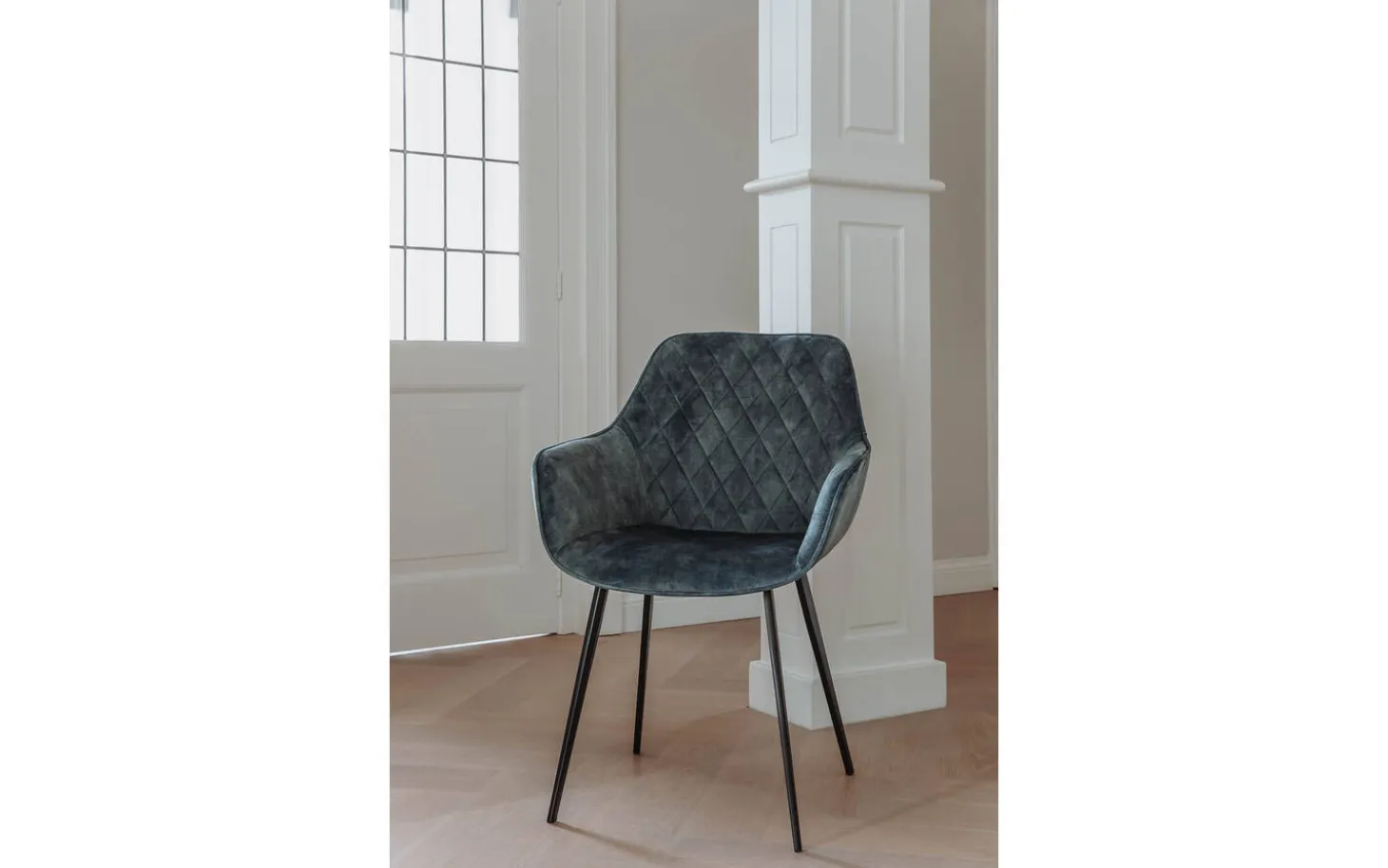 Der blaue Samtbezug verleiht diesem Stuhl eine reichhaltige Textur, die Wärme und Tiefe zu Ihrem Esszimmer hinzufügt. Der Stoff ist nicht nur schön, sondern auch sehr gut für den täglichen intensiven Gebrauch geeignet. Die eleganten Rautensteppungen auf der Sitzfläche geben Ebi eine besonders elegante Note.