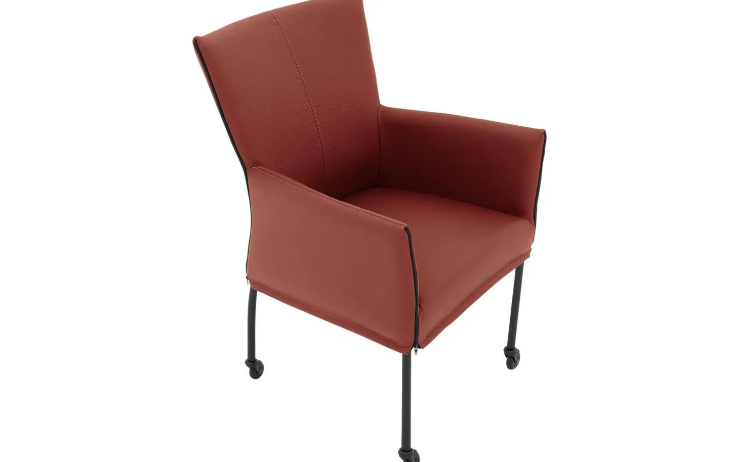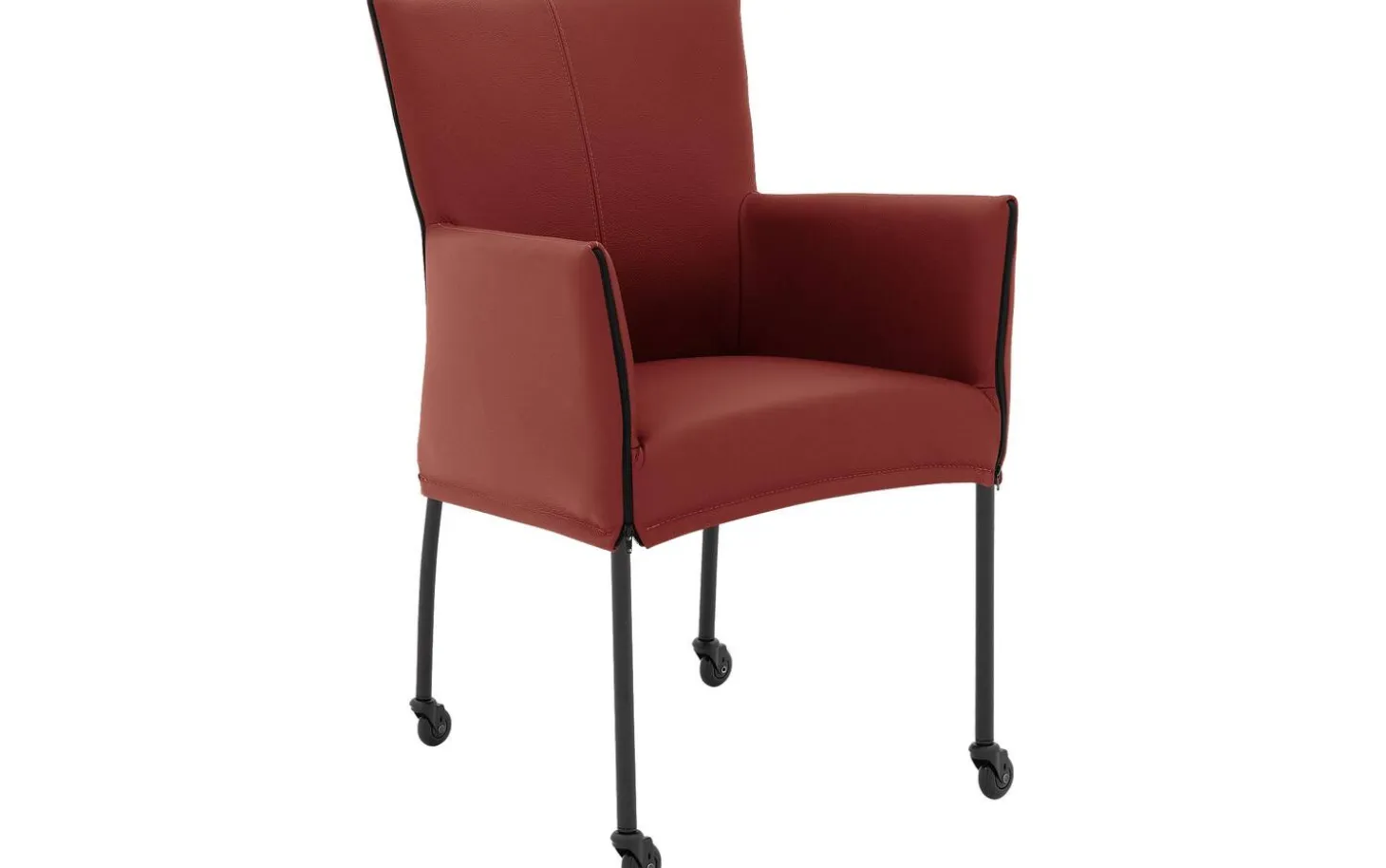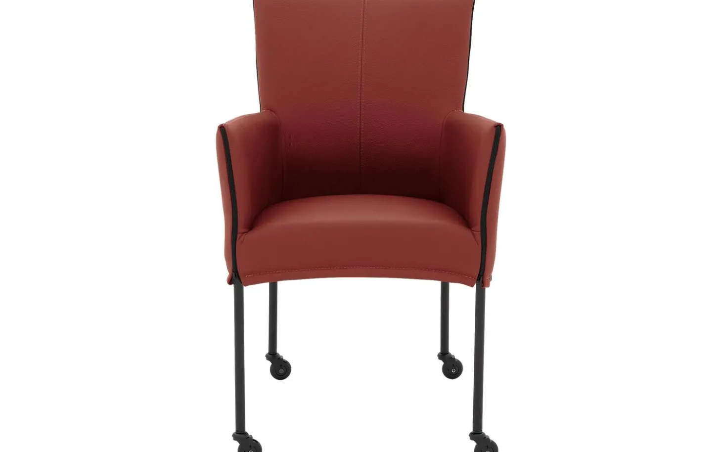 Mit seinen klaren Linien und dem langlebigen Masterleder hat dieser Stuhl eine moderne Ausstrahlung. Das Leder ist durchgefärbt in einem warmen Steinrot und hat eine Schutzschicht, die es vor Sonnenlicht, Feuchtigkeit und Essensresten schützt. Das schwarze Gestell mit Pulverbeschichtung bietet ein solides und stilvolles Fundament, komplett mit praktischen Rollen.