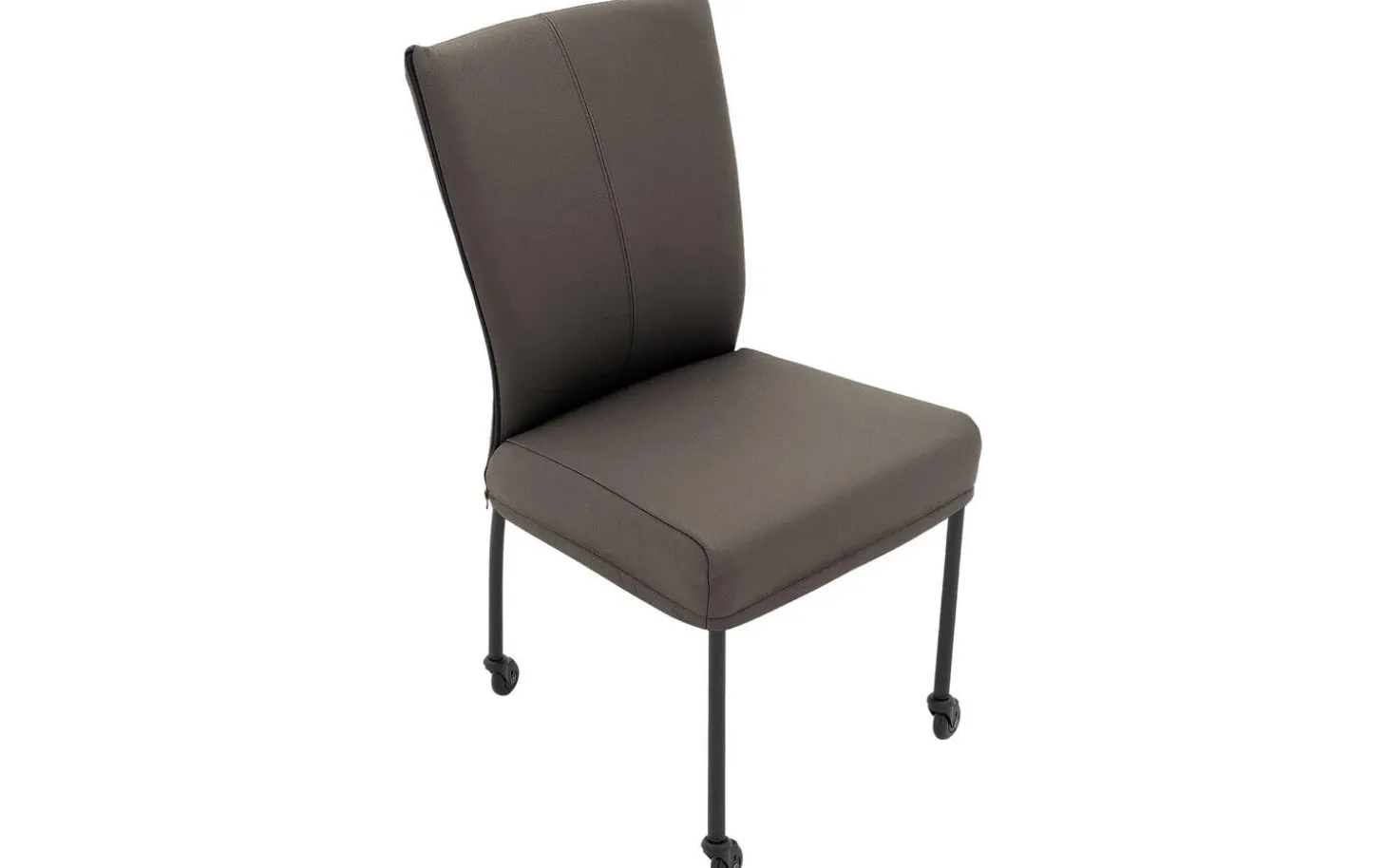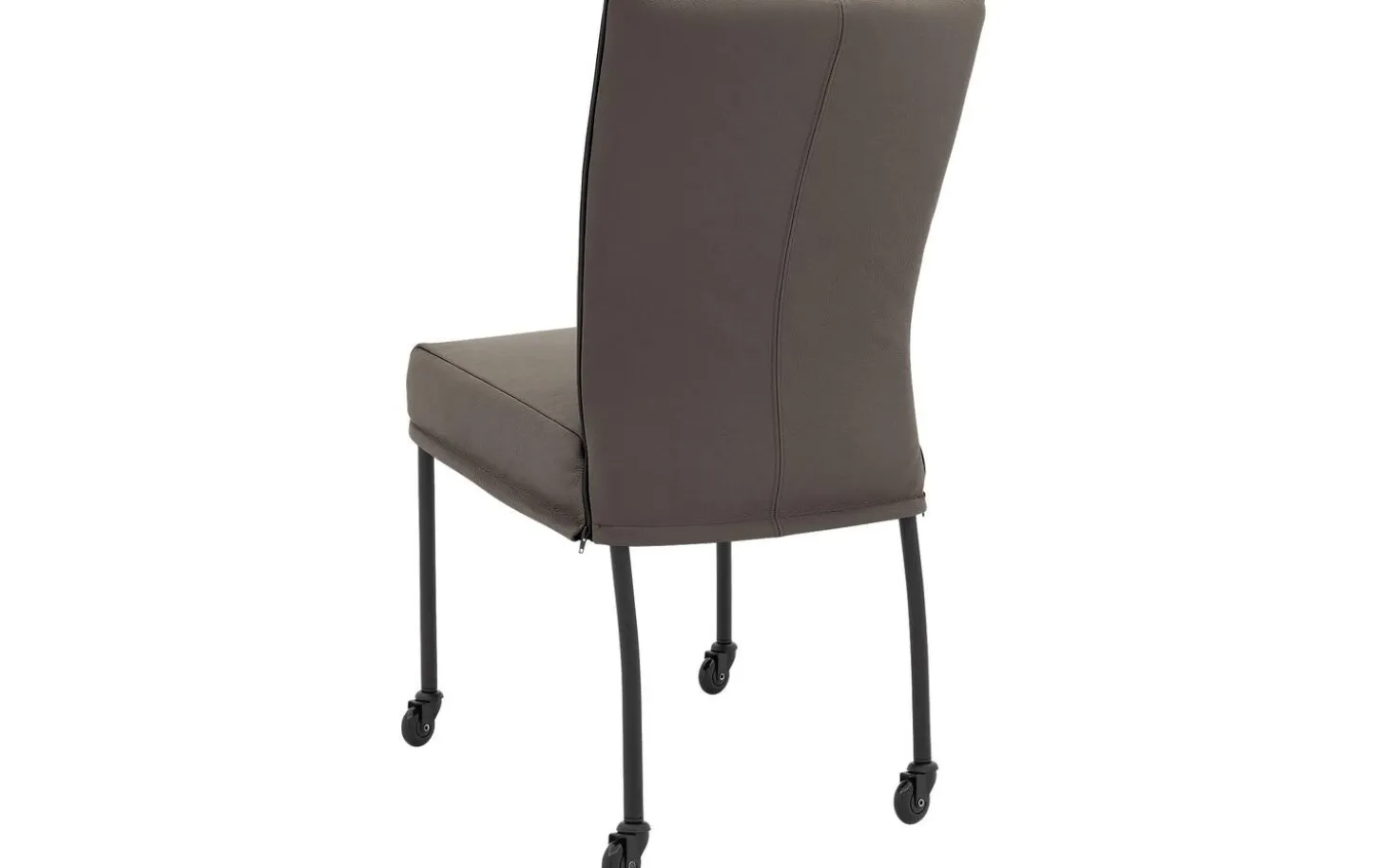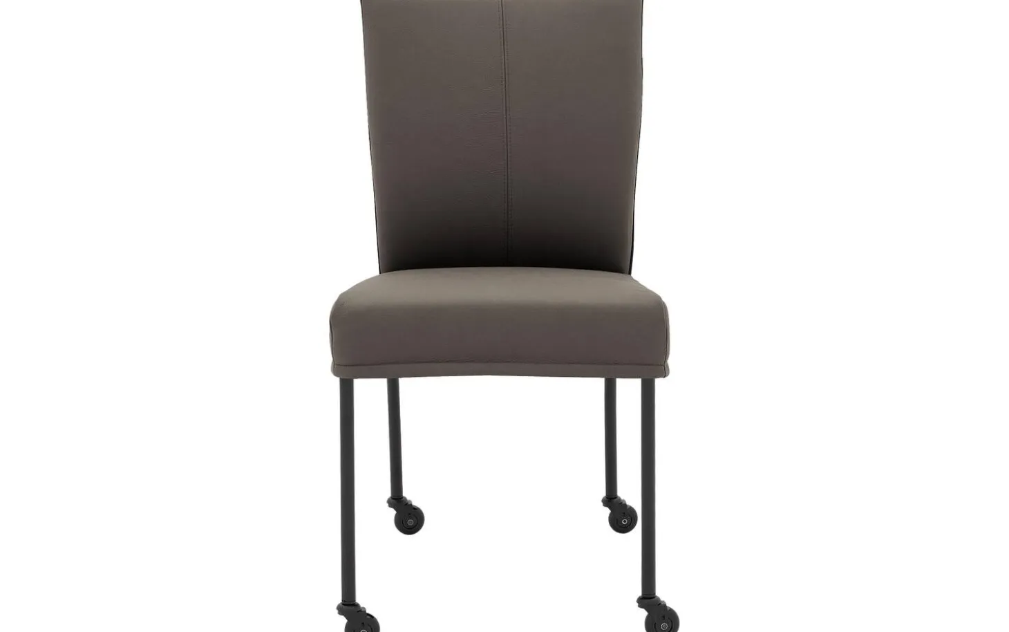 Mit seinen klaren Linien und dem langlebigen Masterleder hat dieser Stuhl eine moderne Ausstrahlung. Das mausgraue Leder ist durchgefärbt und verfügt über eine schützende Lackschicht, die es vor Sonnenlicht, Feuchtigkeit und Essensresten schützt. Das schwarze Gestell mit Pulverbeschichtung bietet ein solides und stilvolles Fundament, komplett mit praktischen Rollen.
