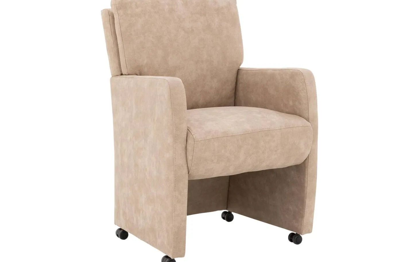 Der beige Esszimmerstuhl Leen mit Armlehne bringt sofort Wärme und Komfort in Ihren Essbereich. Dieser Mikrofaser-Stuhl kombiniert ein zeitloses Design mit praktischer Benutzerfreundlichkeit. Dank der angenehmen Armlehnen und der robusten Nosag-Federung genießen Sie optimale Unterstützung während langer Essen. Mit den luxuriösen Rollen nehmen Sie mühelos am Tisch Platz und stehen in einer fließenden Bewegung wieder auf – ideal für gemütliche Abende mit Familie und Freunden.