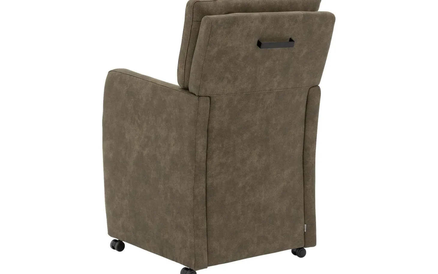 Der matt schwarze Griff oben an der Rückenlehne bildet einen schönen Kontrast zur grünen Polsterung und hat zudem eine praktische Funktion. Die Rollen machen diesen Stuhl besonders funktional, sodass Sie sich geschmeidig an den Tisch und vom Tisch wegschieben können.