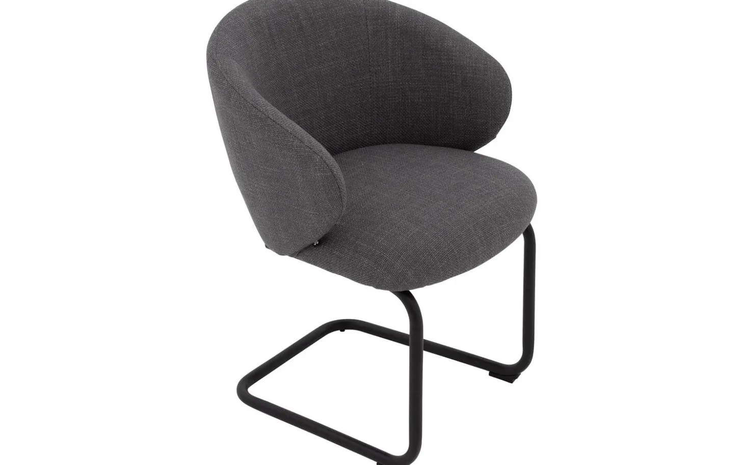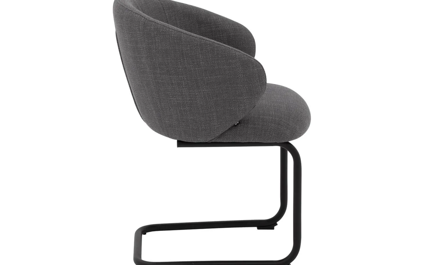 Grauer Esszimmerstuhl Noomi mit Armlehne bietet die perfekte Kombination aus Stil und Komfort für Ihren Essbereich. Die charakteristische runde Rückenlehne umschließt Ihren Körper während gemütlicher Mahlzeiten, während der grob gewebte dunkelgraue Stoff für eine zeitgemäße Ausstrahlung sorgt. Dieser Esszimmerstuhl mit schwarzem Freischwinggestell ist eine ideale Ergänzung für sowohl moderne als auch klassische Einrichtungen.