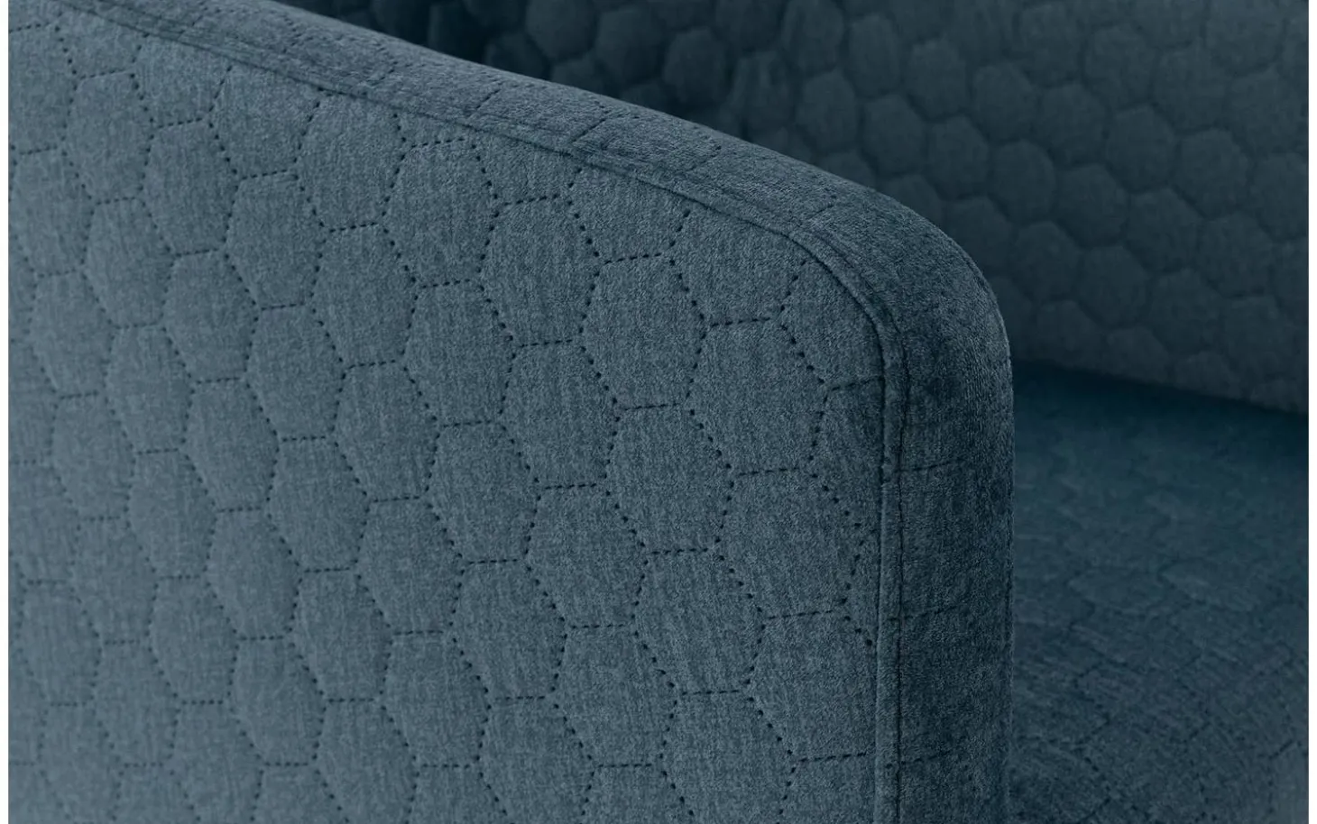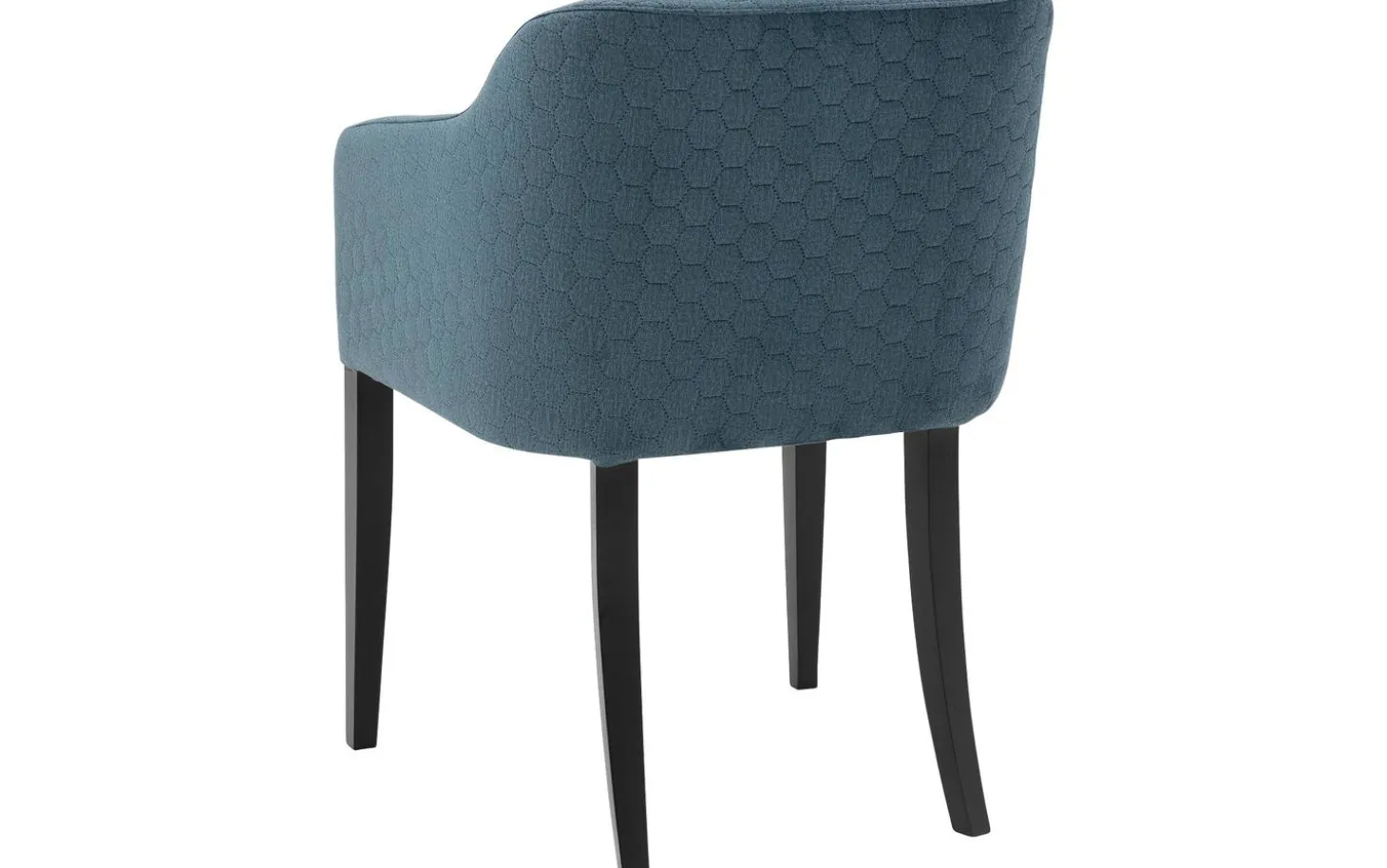 Der Esszimmerstuhl Peda fällt durch seine elegante Ausstrahlung mit der reichen blauen Velourspolsterung auf. Das dekorative Wabensteppmuster auf der Rückenlehne verleiht dem Stuhl eine einzigartige Note. Die schlanken, sich verjüngenden schwarzen Beine bilden einen schönen Kontrast zum weichen blauen Stoff.