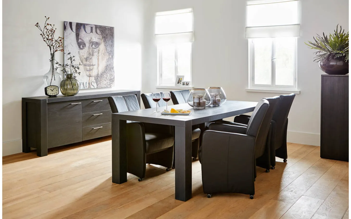 Die feste Polsterung des Esszimmerstuhls Riva sorgt für einen klaren, modernen Look. Das Masterleder ist durchgefärbt und mit einer schützenden Lackschicht versehen, die zusätzlichen Schutz vor Sonnenlicht, Schmutz, Feuchtigkeit und Essensresten bietet. Dadurch bleibt der Stuhl jahrelang schön.