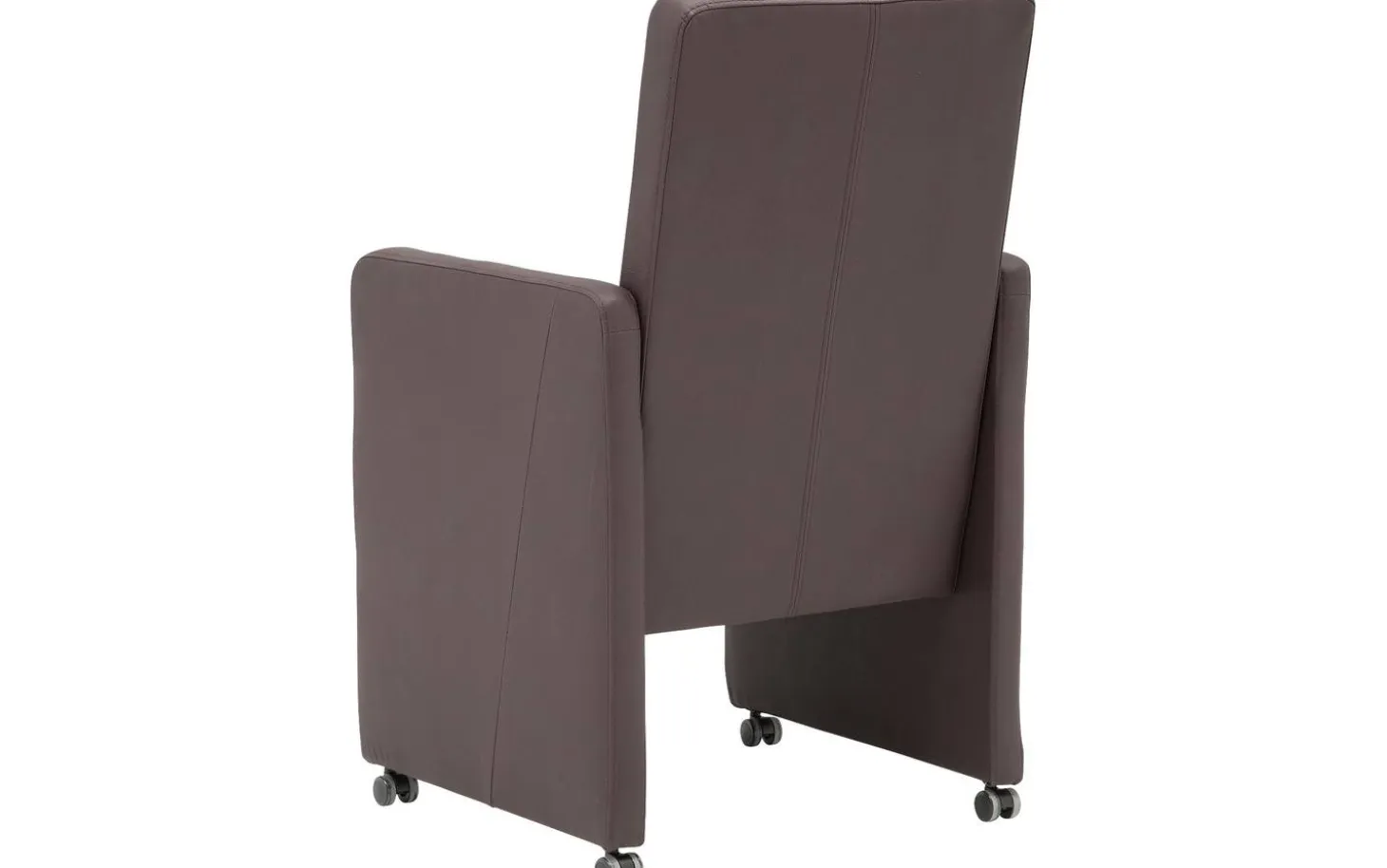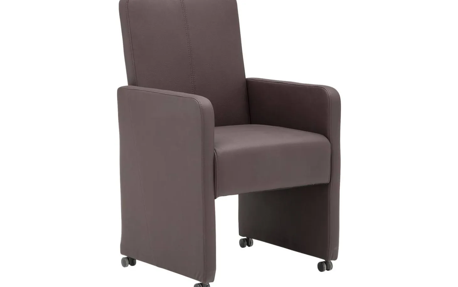 Brauner Esszimmerstuhl Rivas mit Armlehne ist ein Stuhl mit zeitgemäßem Design für gemütliche Essen. Die gepolsterte Armlehne, die bis zum Boden reicht, und der luxuriöse Kunstlederbezug verleihen diesem Esszimmerstuhl eine moderne Ausstrahlung. Die praktischen Rollen machen es einfach, an den Tisch zu rollen, damit Sie sofort Ihr Dinner oder einen gemütlichen Aperitif genießen können.