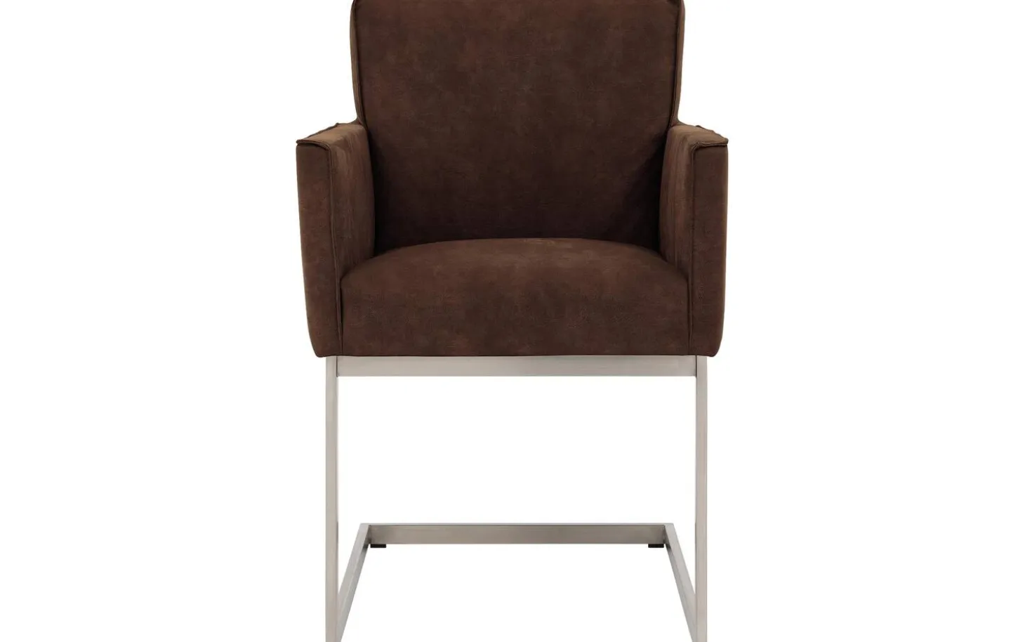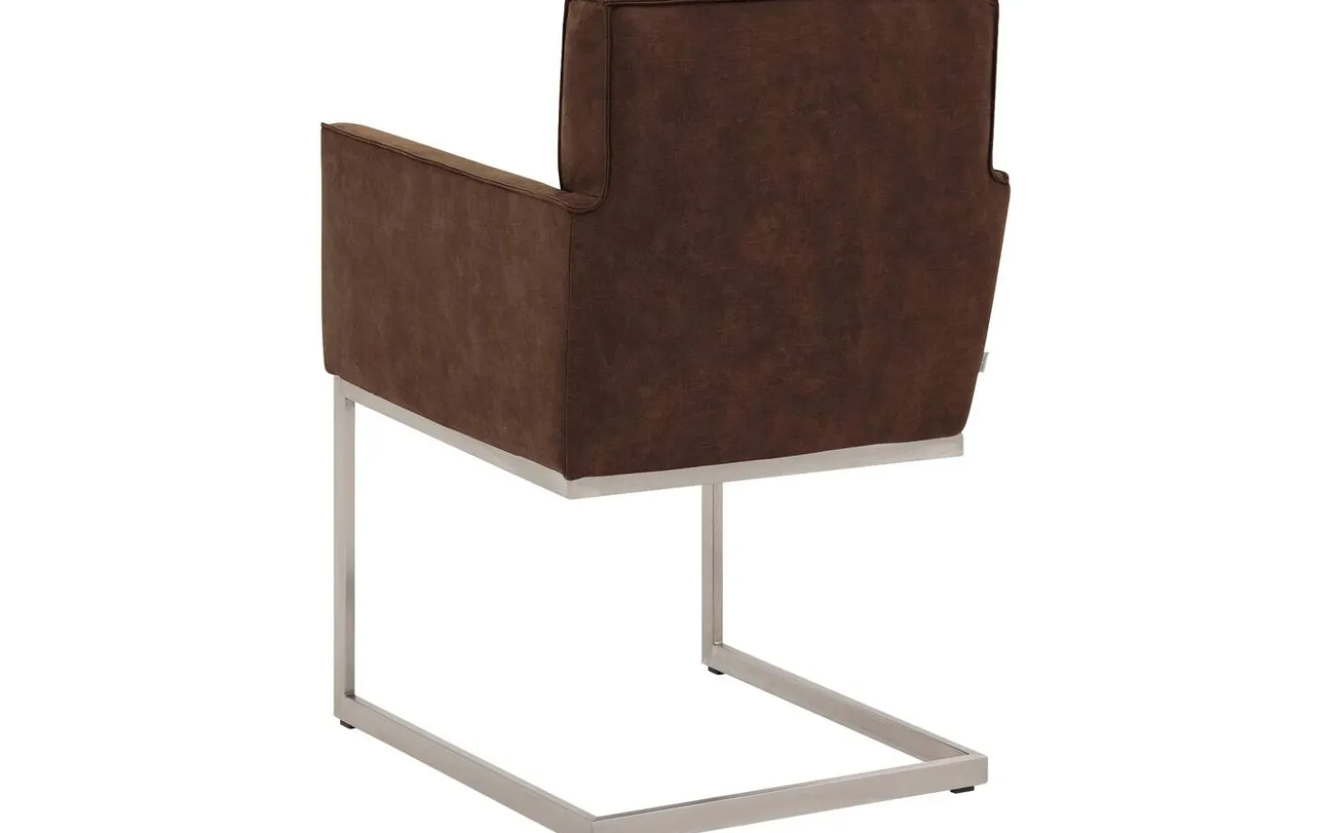 Der braune Esszimmerstuhl Tom mit Armlehne passt perfekt in ein industrielles Interieur. Dieser robuste Stuhl mit Mikroleder-Bezug kombiniert eine zeitlose Ausstrahlung mit zeitgemäßem Komfort. Die weiche Mikroleder-Oberfläche in der warmen Tobacco-Tönung ist mit einer eleganten Kappnaht abgeschlossen. Dank des besonderen Freischwinggestells federt dieser Esszimmerstuhl subtil mit Ihren Bewegungen mit, was besonders bei langen Dinner-Abenden für zusätzlichen Sitzkomfort sorgt.