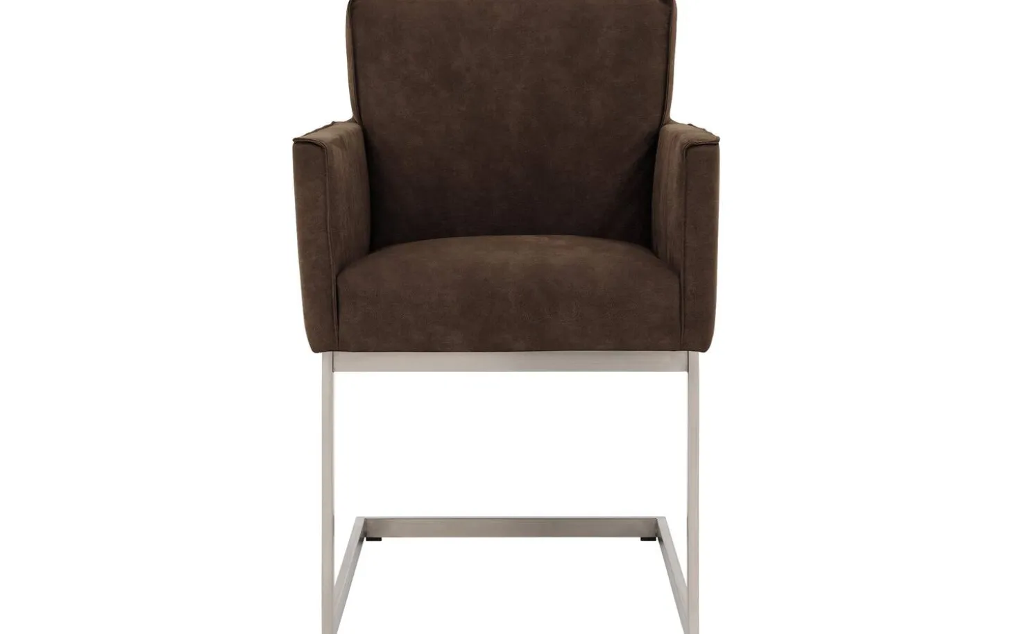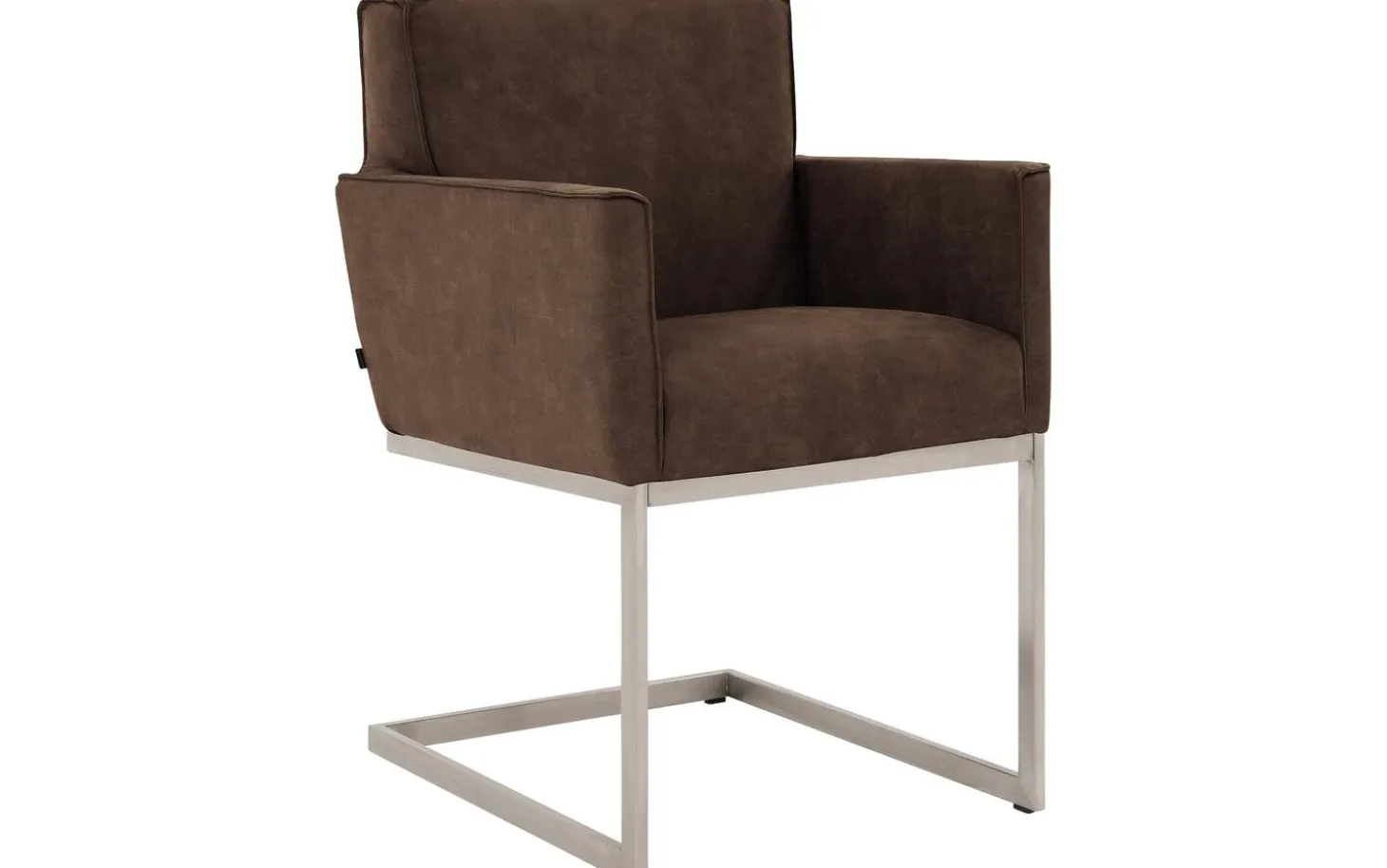 Der braune Esszimmerstuhl Tom mit Armlehne kombiniert robustes Design mit praktischem Komfort. Dieser Stuhl aus Mikroleder fühlt sich wunderbar weich an und ist mit einer eleganten Kappnaht versehen. Das Besondere an diesem Stuhl ist das Edelstahl-Freischwinggestell, das während des Essens leicht mitfedert – perfekt für lange Abende in einem industriellen Interieur. Kombinieren Sie den Esszimmerstuhl Tom mit der passenden Essbank für eine komplette Essecke mit robuster Ausstrahlung.