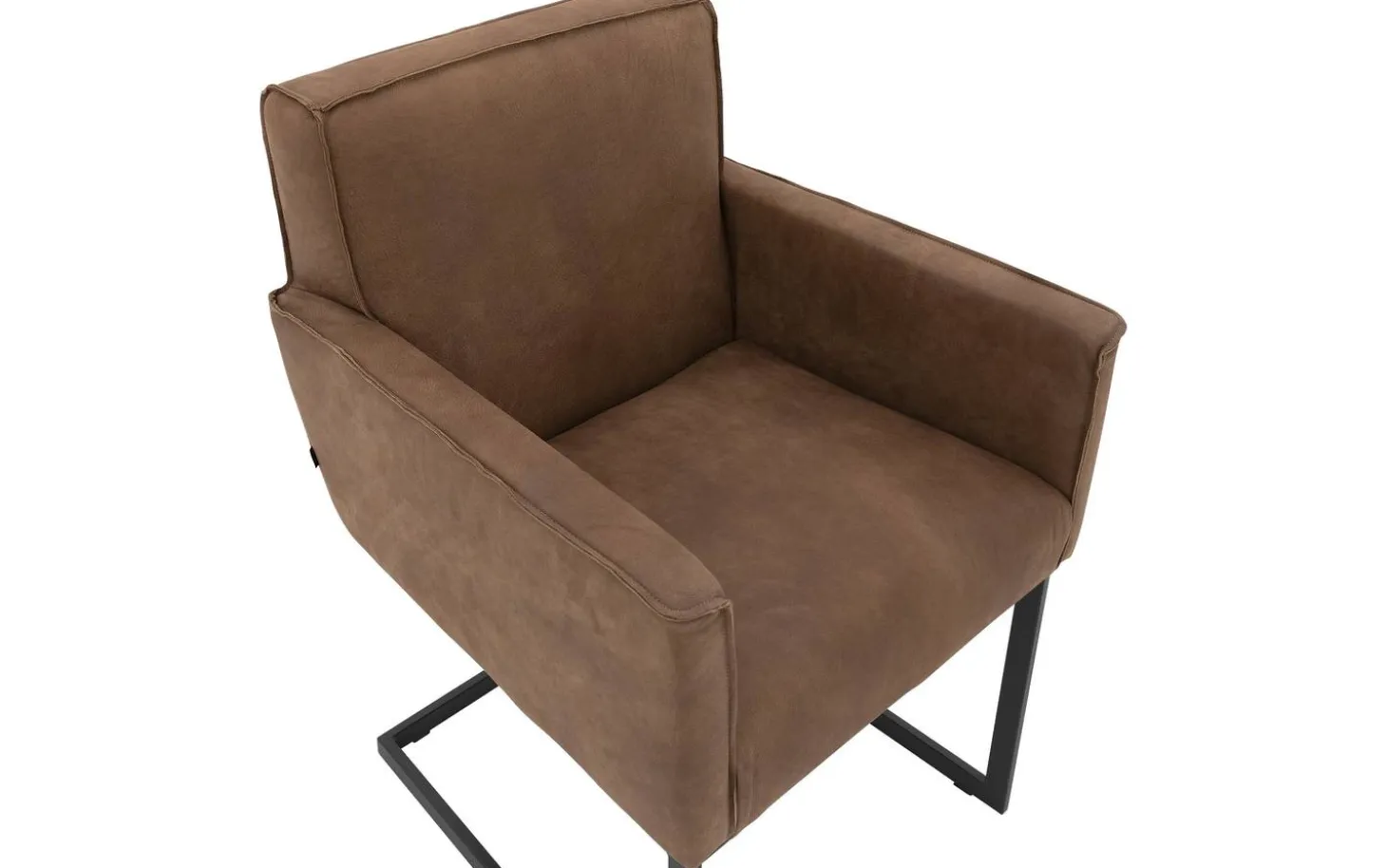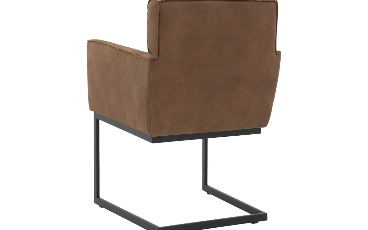 Brauner Esszimmerstuhl Tom aus Leder mit Armlehne bringt industrielle Robustheit in Ihren Essbereich. Dieser Stuhl aus der Goossens Wohnen Excellent Kollektion zeichnet sich durch das weiche Büffelleder mit wildlederähnlicher Ausstrahlung und eleganter Ziernaht aus. Das schwarze Freischwinggestell sorgt dafür, dass der Stuhl beim Essen leicht mitschwingt – ideal für lange Mahlzeiten und gemütliche Abende mit Freunden und Familie. Kombinieren Sie diesen Esszimmerstuhl perfekt mit der passenden Esszimmerbank Tom für einen kompletten Essbereich mit robustem Charakter.