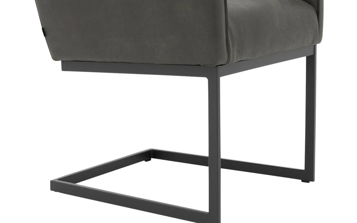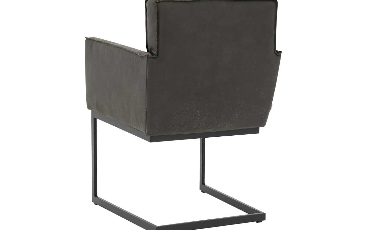 Der grüne Esszimmerstuhl Tom mit Armlehne ist ein robuster Stuhl aus Leder, der perfekt in ein industrielles Interieur passt. Das dunkelgrüne Büffelleder ist fachmännisch mit einer eleganten Kappnaht versehen, die für eine robuste Ausstrahlung sorgt. Der Stuhl hat ein räumliches Erscheinungsbild dank des anthrazitfarbenen Metallrahmens mit Freischwinggestell, wodurch Sie beim Nachsitzen leicht mitfedern – ideal für lange Abende am Esstisch.