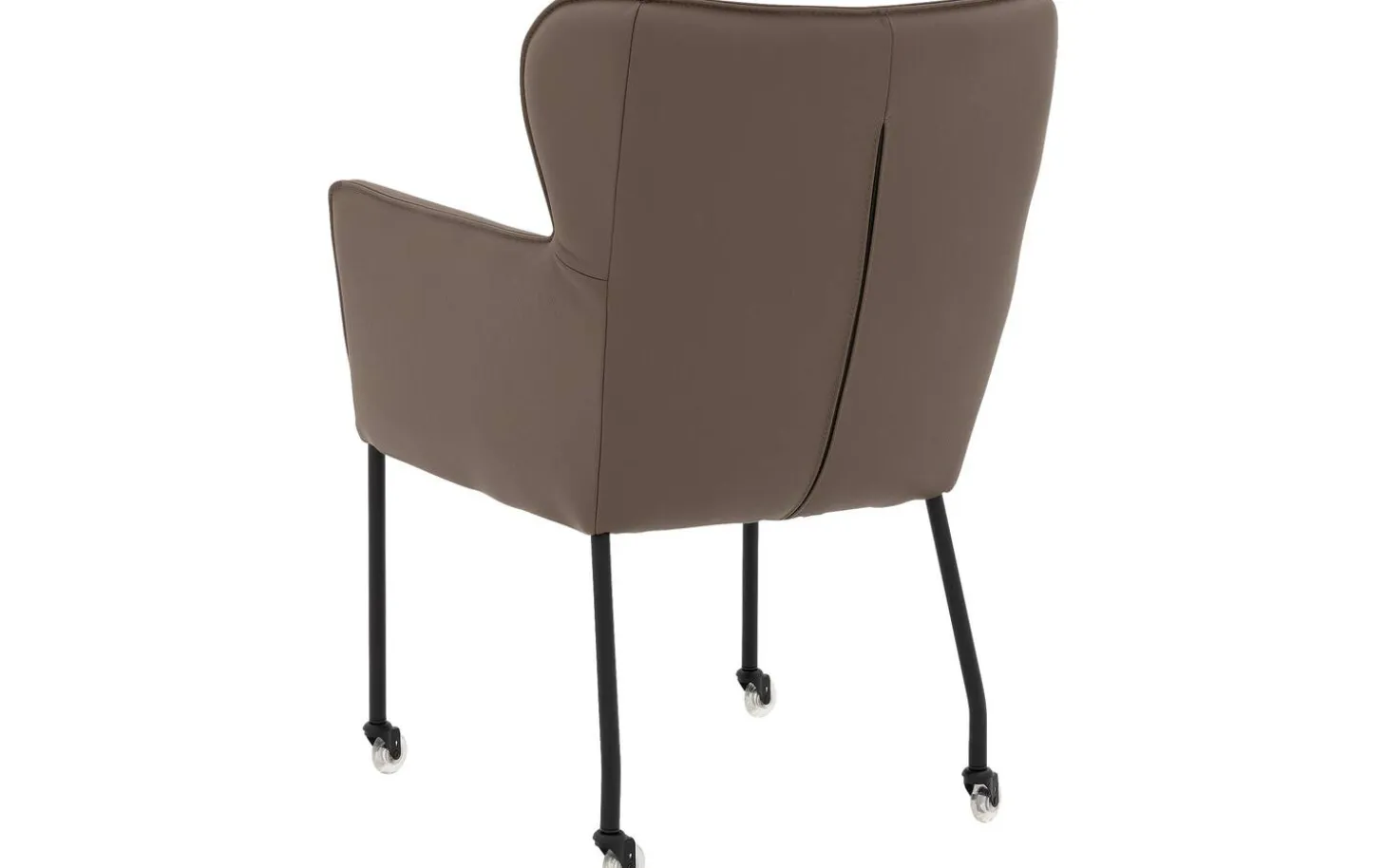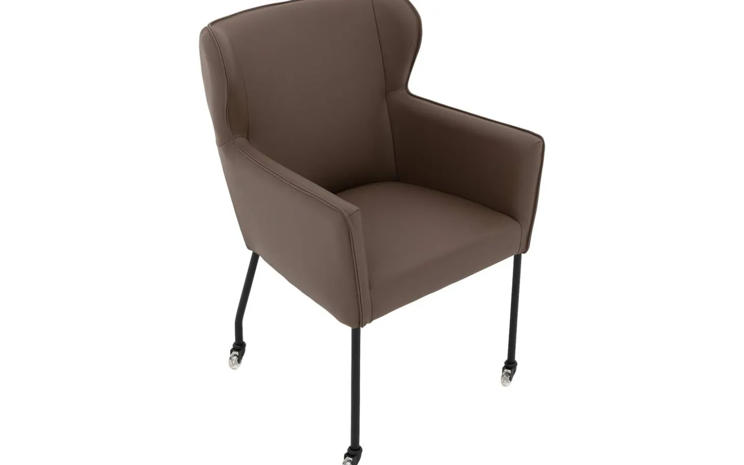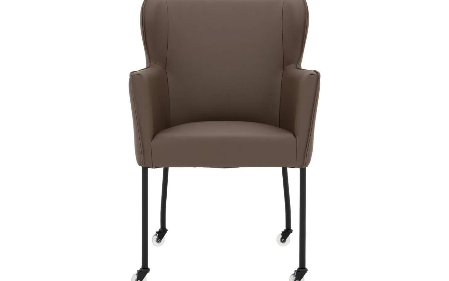 Brauner Esszimmerstuhl Leogang aus Leder mit Armlehne bringt Eleganz an Ihren Esstisch. Dieser schlanke Stuhl erinnert an einen klassischen Ohrensessel, jedoch in einer modernen Interpretation als Esszimmerstuhl. Der luxuriöse Lederbezug in einem warmen Braunton verleiht Leogang eine zeitlose Ausstrahlung, während das schlanke schwarze Gestell für einen luftigen Look sorgt. Dank der praktischen Rollen können Sie mühelos an den Tisch heran- und wieder wegfahren.