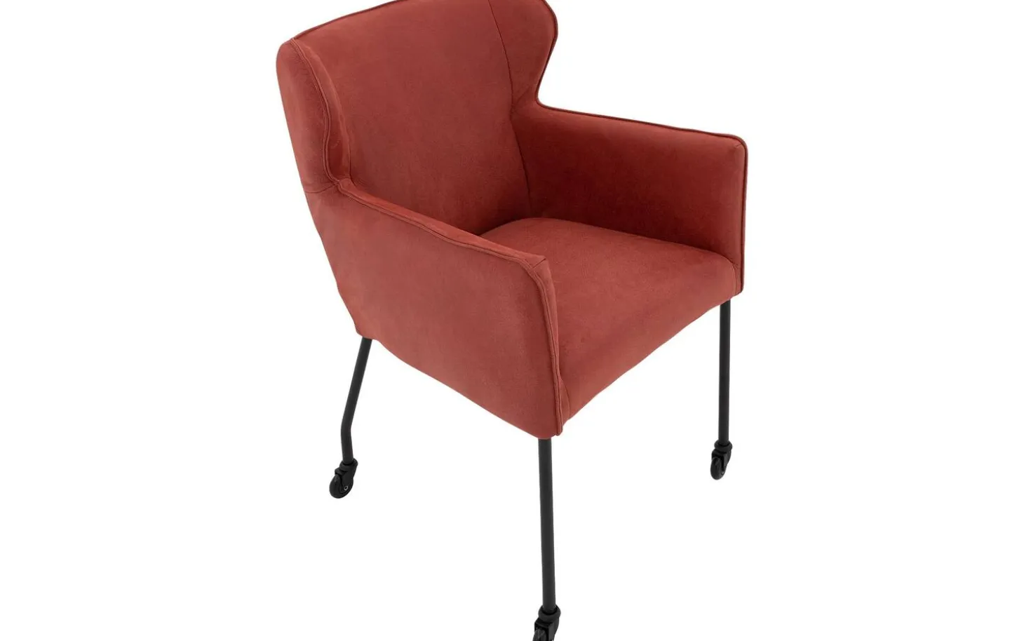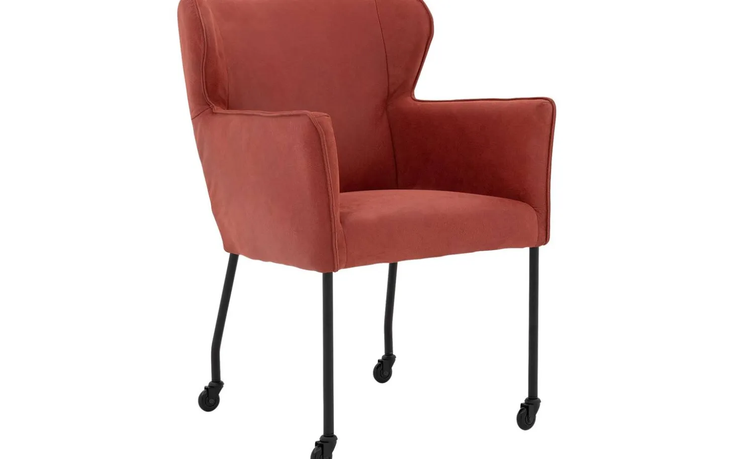 Esszimmerstuhl Leogang mit Armlehne in rotem Leder bringt einen eleganten Akzent an Ihren Esstisch. Dieser schlanke Stuhl erinnert an einen klassischen Ohrensessel, jedoch in einer modernen Version für den Esstisch. Das rote Buffalo-Leder verleiht eine luxuriöse, wildlederähnliche Ausstrahlung, während das schlanke Untergestell für einen luftigen Look sorgt. Mit den praktischen schwarzen Rollen können Sie leicht an den Tisch heran- und wieder wegfahren.