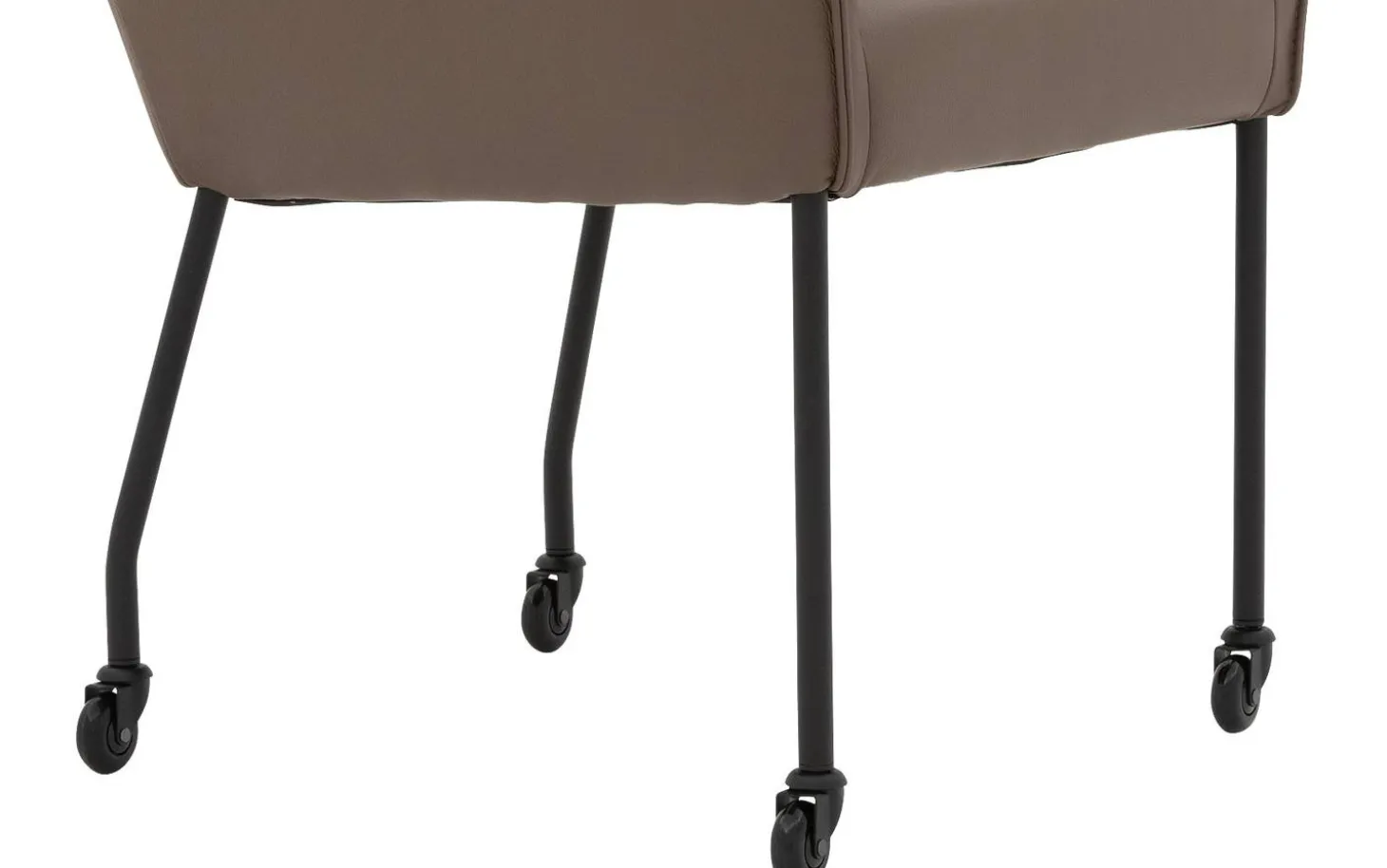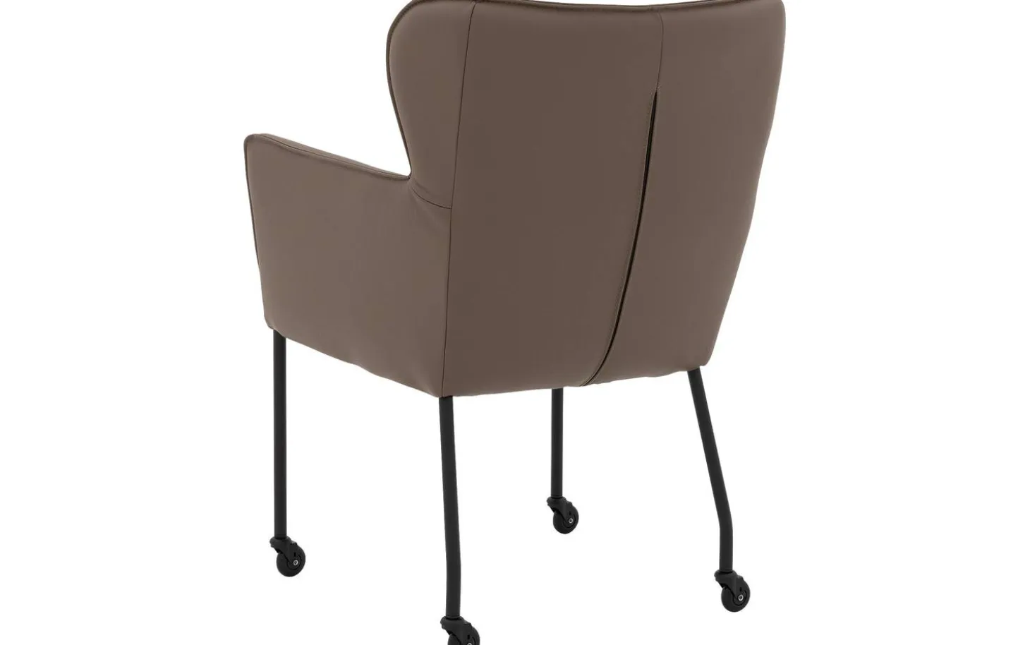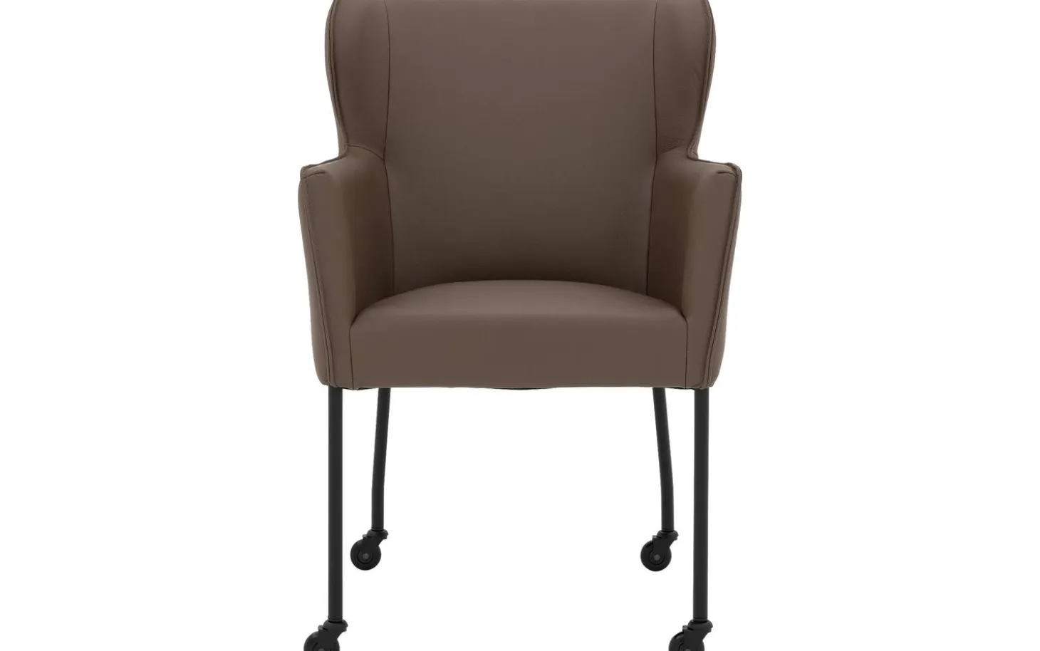 Der braune Esszimmerstuhl Leogang mit Armlehne bringt stilvolle Eleganz an Ihren Esstisch. Dieser schlanke Stuhl erinnert an einen klassischen Ohrensessel, jedoch in einem zeitgemäßen Design. Die wundervolle Polsterung aus dickem Masterleder in dunklem Braun verleiht Leogang eine luxuriöse Ausstrahlung, während das schlanke schwarze Gestell für einen luftigen Look sorgt. Dank der praktischen Rollen können Sie während geselliger Mahlzeiten leicht an den Tisch heran- und wieder wegfahren.