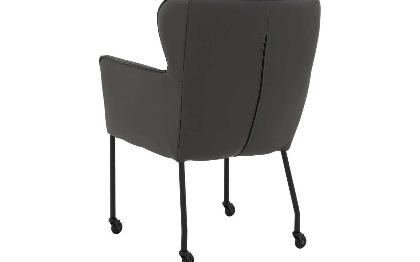 Grauer Esszimmerstuhl Leogang mit Armlehne kombiniert stilvolles Design mit praktischer Funktionalität. Dieser schlanke Stuhl erinnert an einen klassischen Ohrensessel, jedoch übersetzt in einen modernen Esszimmerstuhl. Das dunkelgraue dicke Master-Leder verleiht Leogang eine luxuriöse Ausstrahlung, während das schlanke schwarze Gestell mit Rollen für einen luftigen Look sorgt. Setzen Sie sich leicht an den Tisch und genießen Sie lange Essen an Ihrem Esstisch.