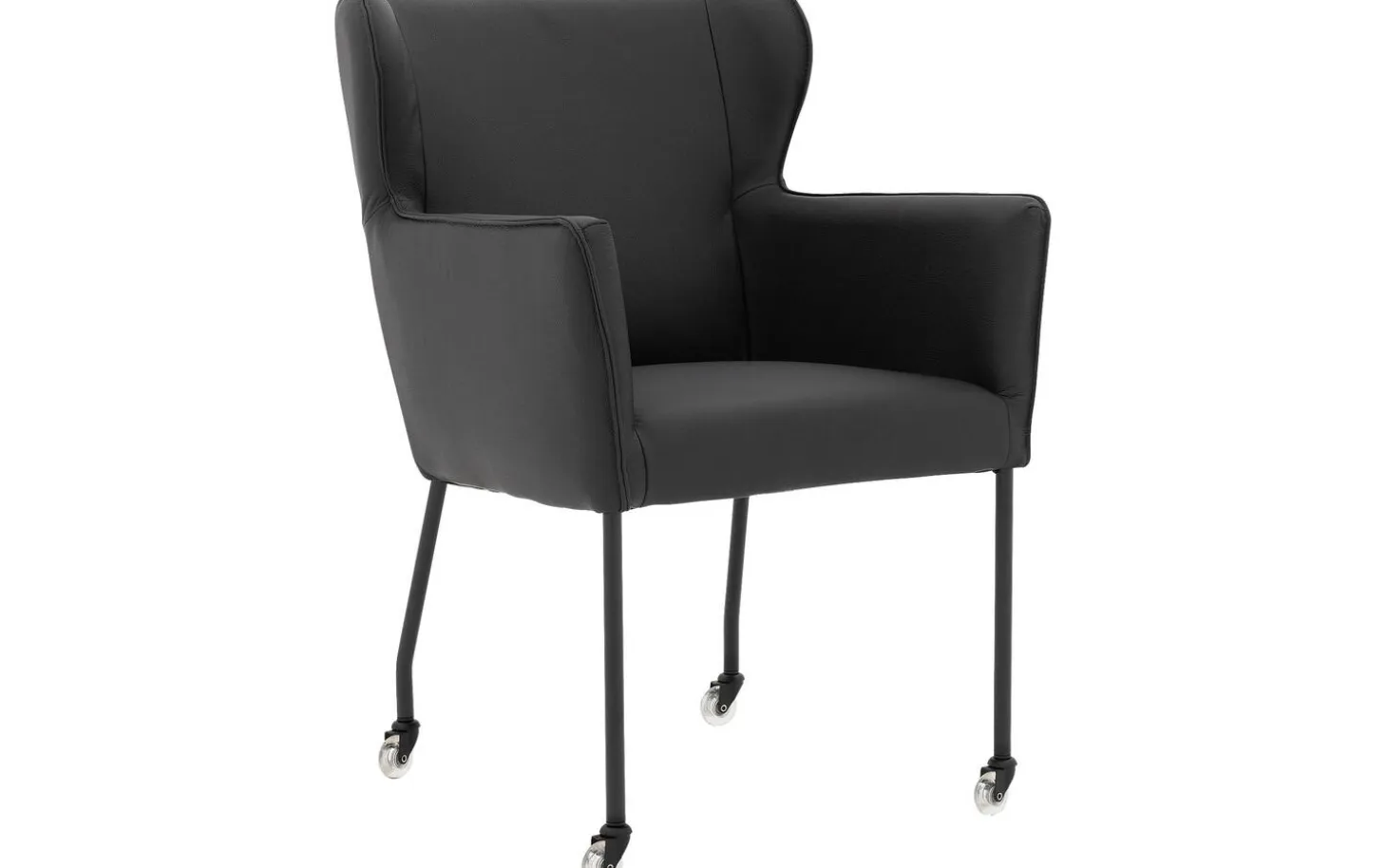 Der schwarze Rahmen mit Pulverbeschichtung passt perfekt zur schwarzen Lederpolsterung. Die feste Polsterung verleiht diesem Stuhl ein klares, modernes Erscheinungsbild. Die Sitzbreite von 45 cm und eine Sitztiefe von 45 cm sorgen für eine komfortable Sitzposition, während die praktischen Rollen das Heranrücken an den Tisch erleichtern.