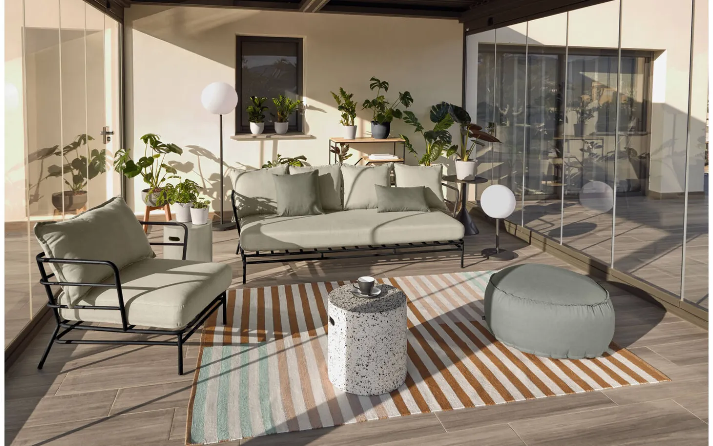 Was die Loungebank Mareluz besonders macht, ist das schlichte Stahlgestell, das für eine luftige Ausstrahlung sorgt. Das feingewebte graue Stoffmaterial fügt Wärme hinzu und sorgt für ein angenehmes Sitzerlebnis. Der neutrale Grauton passt mühelos zu verschiedenen Gartenstilen und lässt sich leicht mit anderen Gartenmöbeln kombinieren.