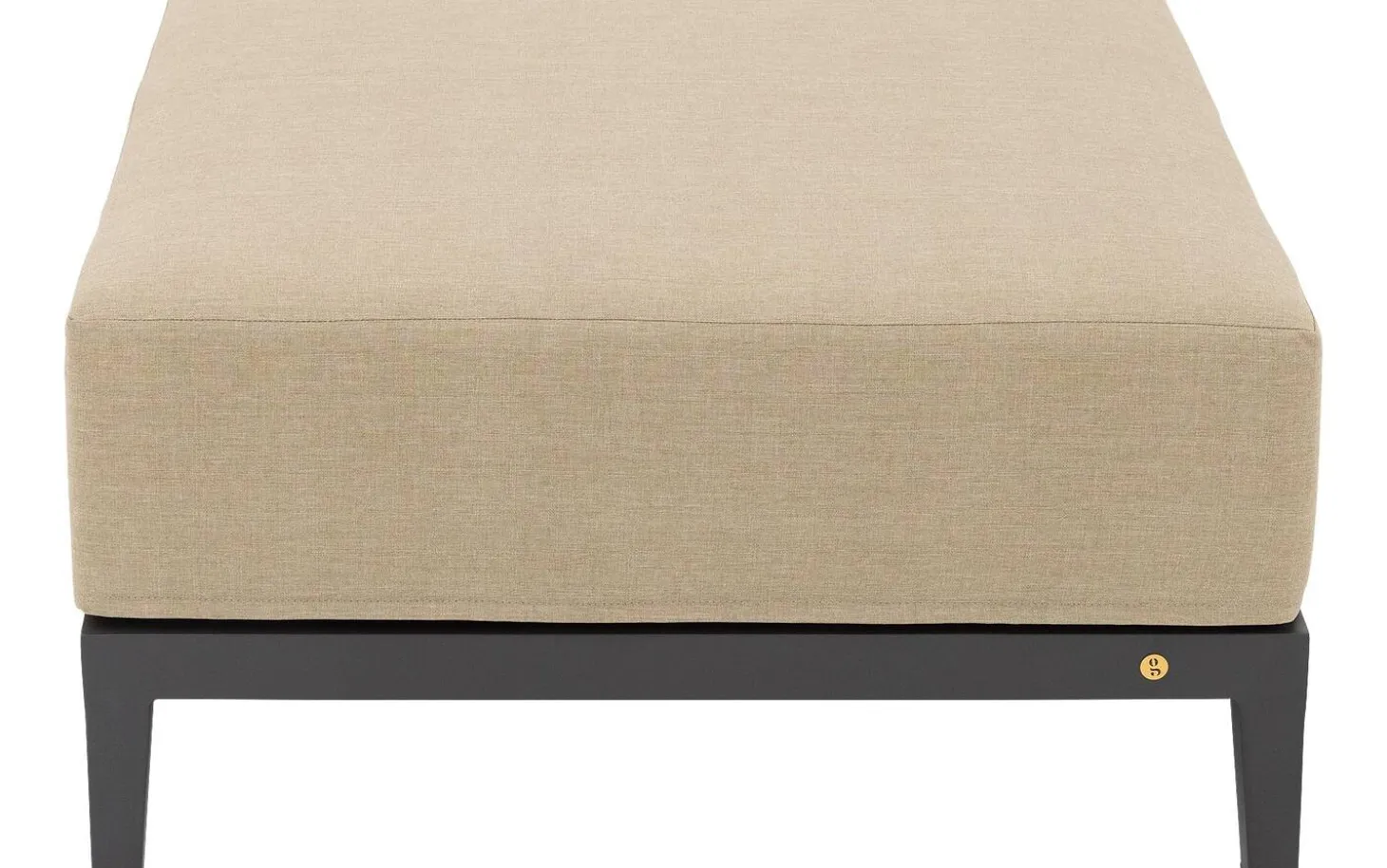 Hocker Yngvar fällt durch das Zusammenspiel verschiedener Materialien auf. Der anthrazitfarbene Aluminiumrahmen mit abgerundeten Ecken verleiht eine weiche Ausstrahlung. Die spielerische Verarbeitung mit dunklem Seil an den Seiten bildet einen schönen Kontrast zur Polsterung im Naturton.