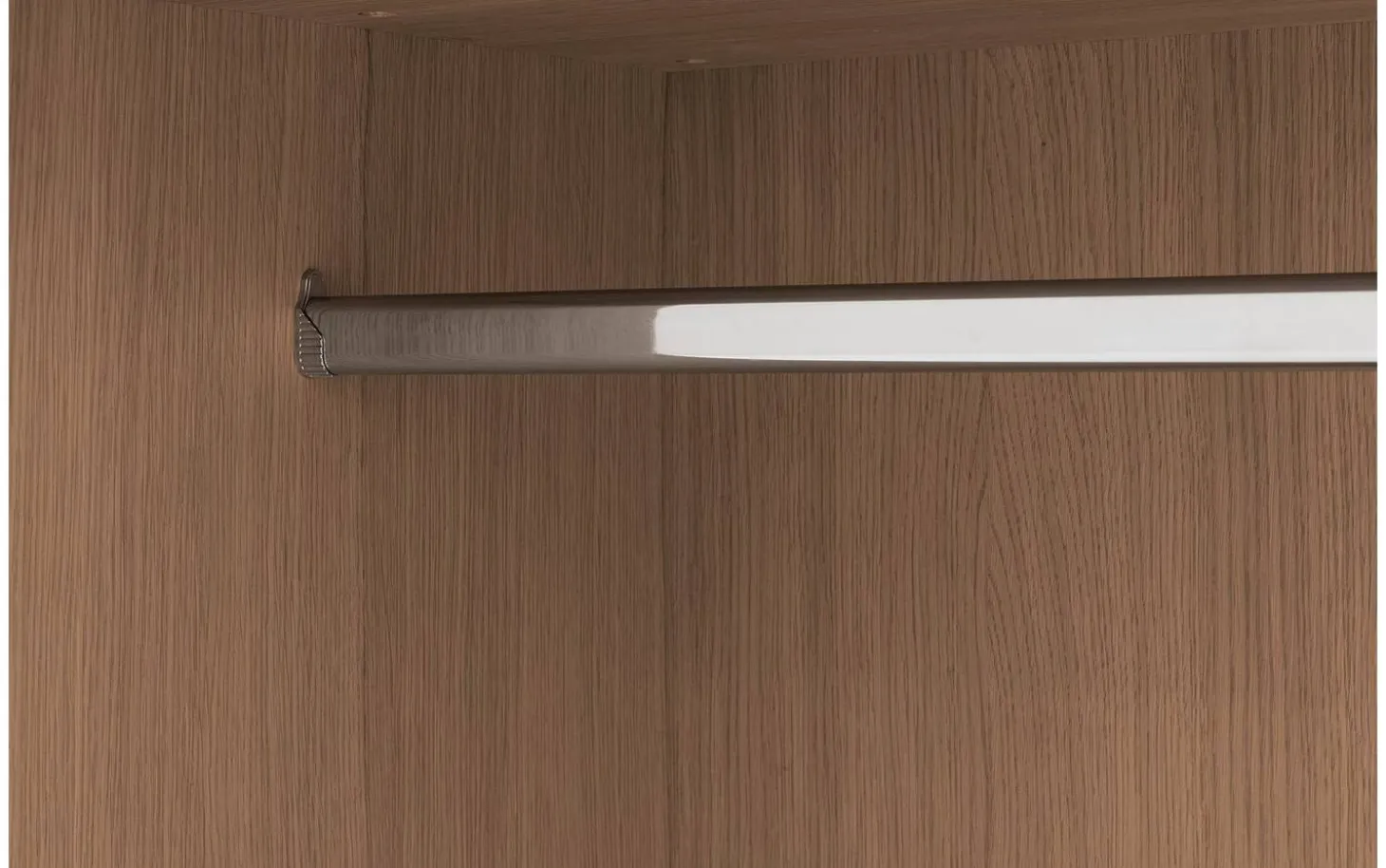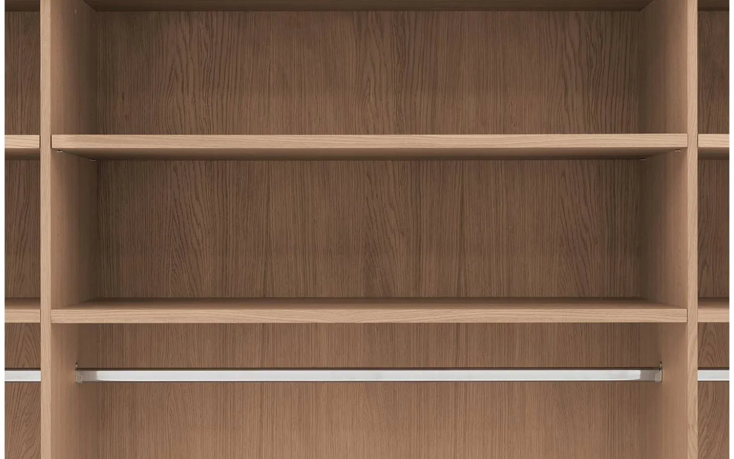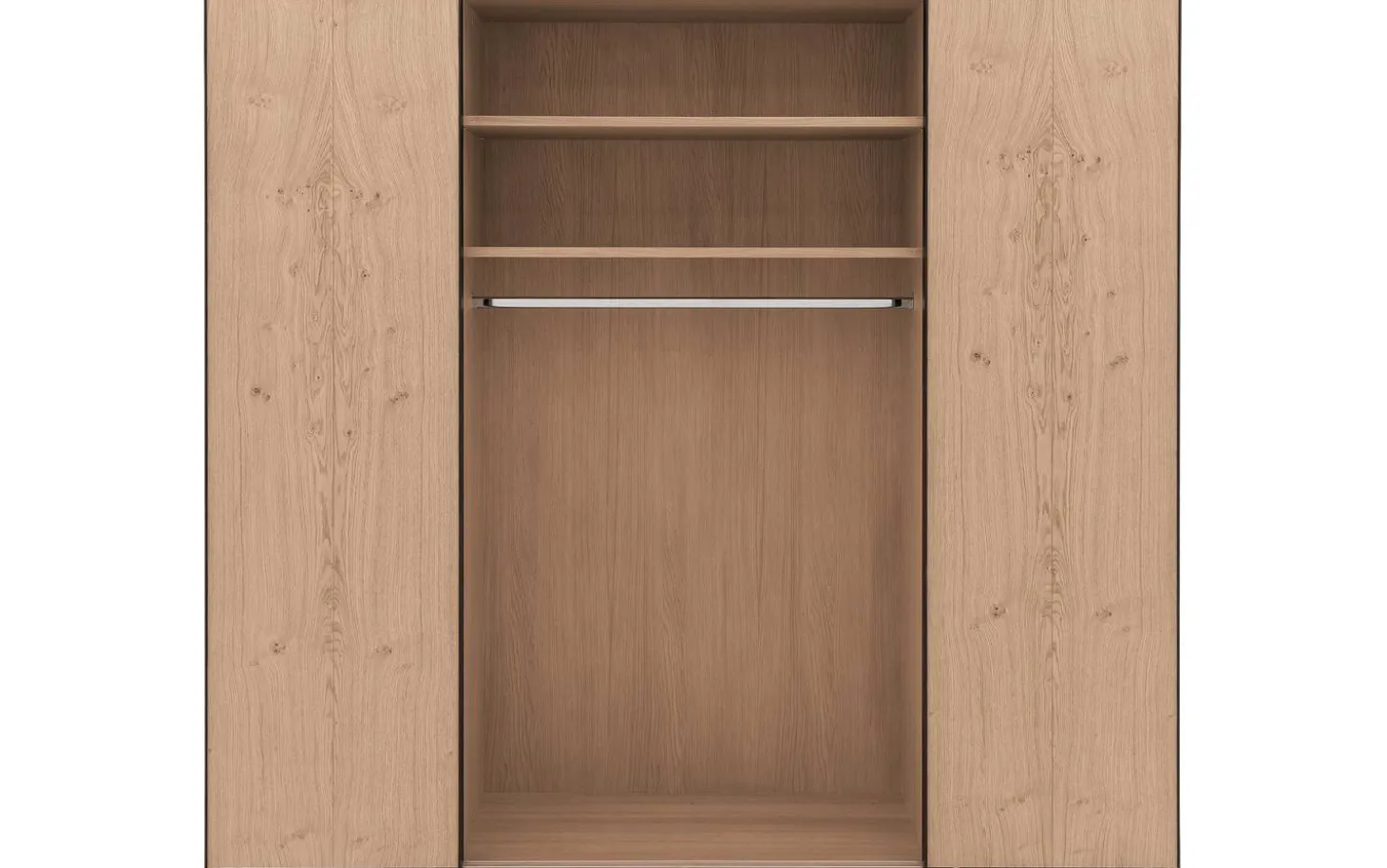 De ombouw van kledingkast Wood is van massief eiken panelen. De deuren zijn voorzien van eiken fineer.