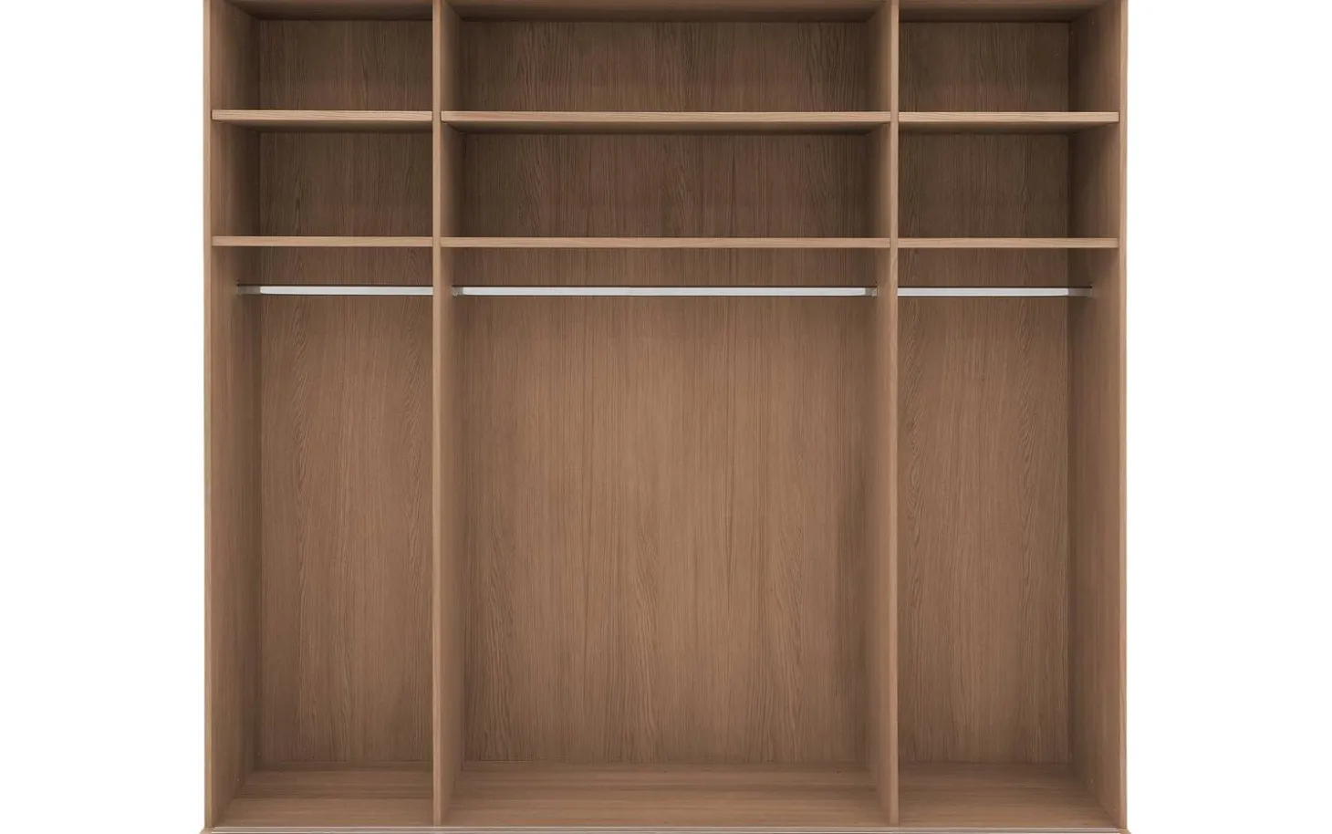 Dankzij de schuifdeuren is kledingkast Wood praktisch in gebruik. De deuren nemen minder ruimte in beslag, omdat de kastdeur de ruimte niet indraait. Bovendien zorgt het voor een strak design van de kledingkast. Vraag je je af of de kast voldoende opbergruimte heeft? Daar hoef je je geen zorgen om te maken! Ieder kastgedeelte (compartiment) heeft een roede en twee legplanken, zo beschik je over meer dan genoeg opbergruimte voor al je kleding. Wil je toch nog meer opbergruimte creëren in je kast? Je kunt speciaal voor kledingkast Wood extra legplanken of een inzetladeblok bijbestellen.