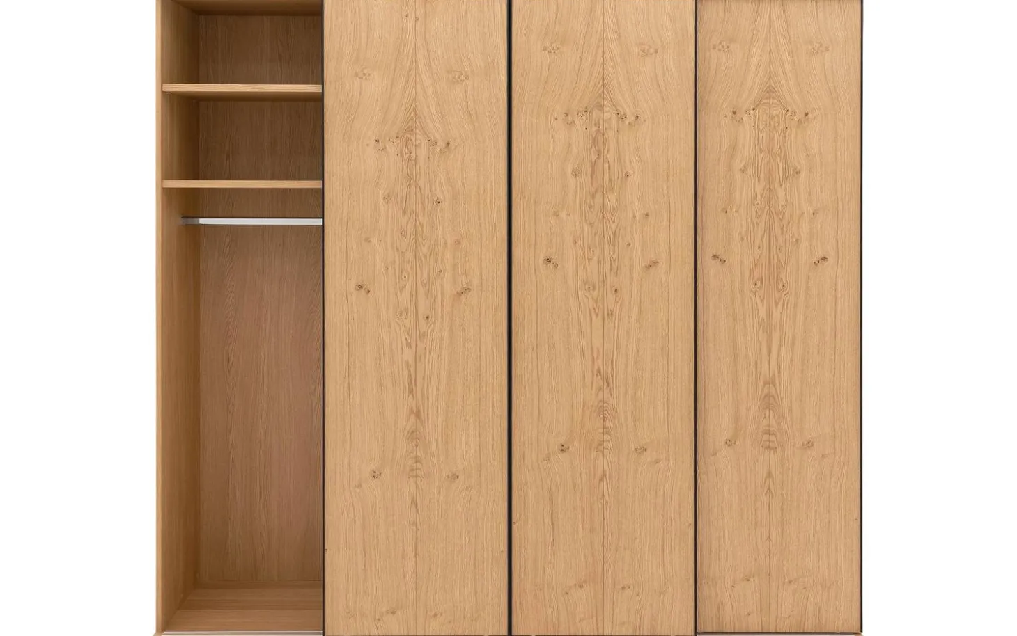 De ombouw van kledingkast Wood is van massief eiken panelen. De deuren zijn voorzien van eiken fineer.