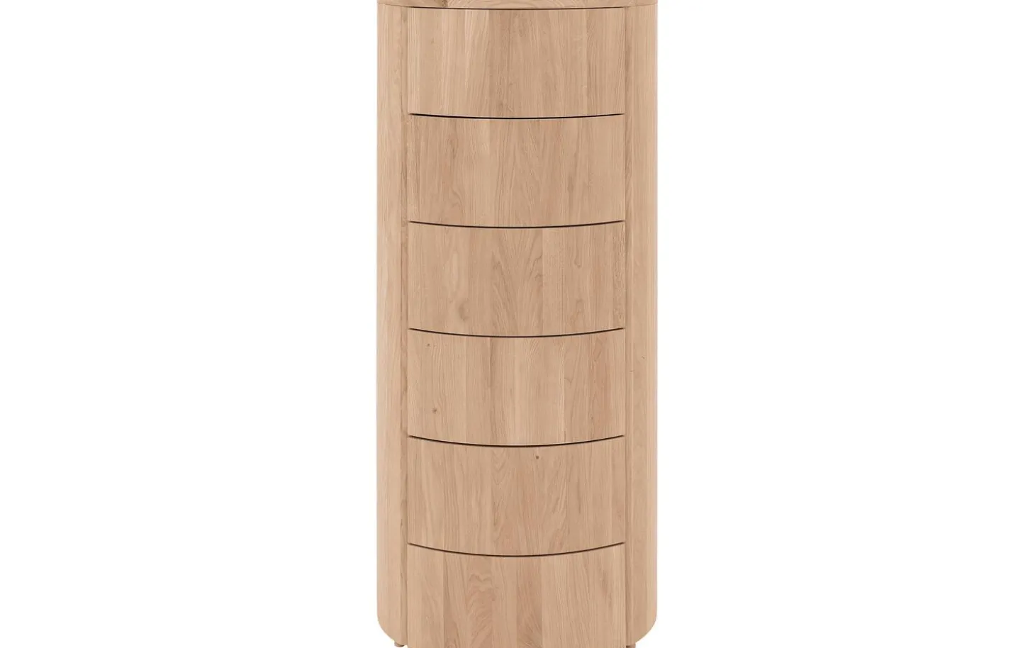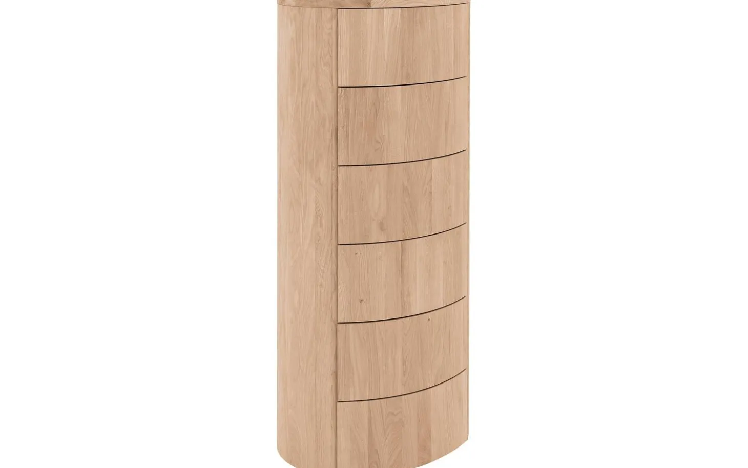 Der Schubladenschrank Denzo verleiht Ihrem Schlafzimmer das gewisse Extra. Denzo besticht durch sein ungewöhnliches Design: Die Kombination aus geradlinigen und runden Formen schafft ein wahres Unikat. Das moderne Modell ist aus massivem Eichenholz gefertigt und besticht durch sein warmes, natürliches Flair, das sich in jedes Schlafzimmer integrieren lässt. Dank des Eichenholzes hat diese Kommode zudem eine lange Lebensdauer. Gleich sechs Schubladen bieten reichlich Stauraum für Ihre persönlichen Gegenstände. Die Kommode ist mit einem passenden Nachtschränkchen und Bett aus der Denzo-Kollektion kombinierbar.