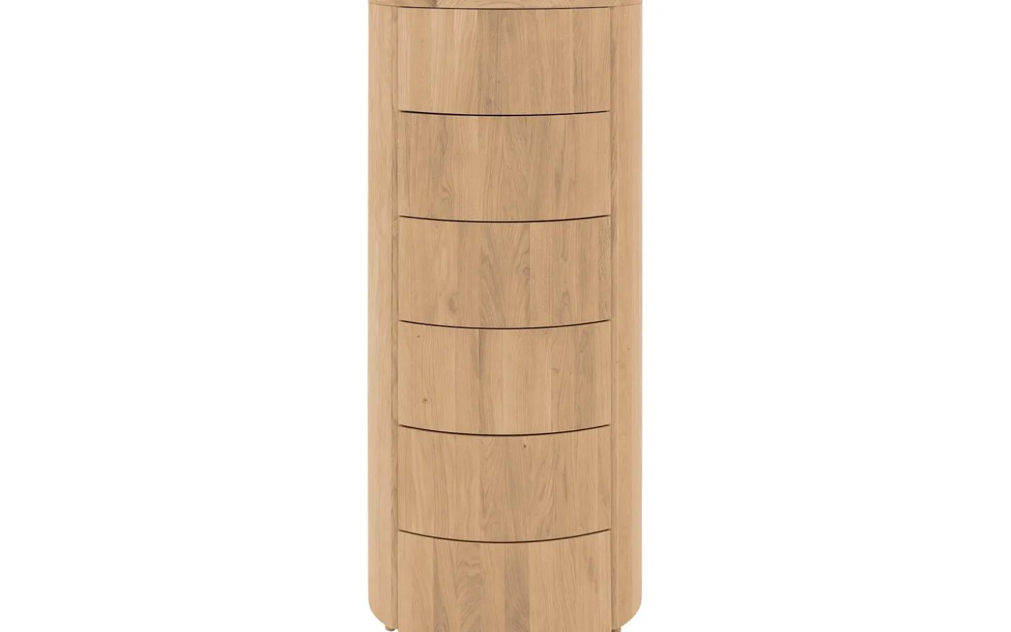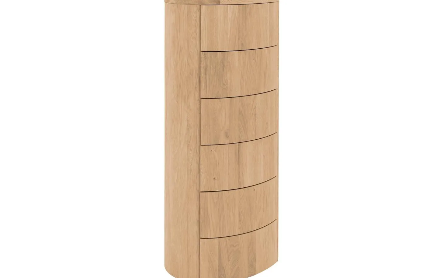 Der Schubladenschrank Denzo verleiht Ihrem Schlafzimmer das gewisse Extra. Denzo besticht durch sein ungewöhnliches Design: Die Kombination aus geradlinigen und runden Formen schafft ein wahres Unikat. Das moderne Modell ist aus massivem Eichenholz gefertigt und besticht durch sein warmes, natürliches Flair, das sich in jedes Schlafzimmer integrieren lässt. Dank des Eichenholzes hat diese Kommode zudem eine lange Lebensdauer. Gleich sechs Schubladen bieten reichlich Stauraum für Ihre persönlichen Gegenstände. Die Kommode ist mit einem passenden Nachtschränkchen und Bett aus der Denzo-Kollektion kombinierbar.