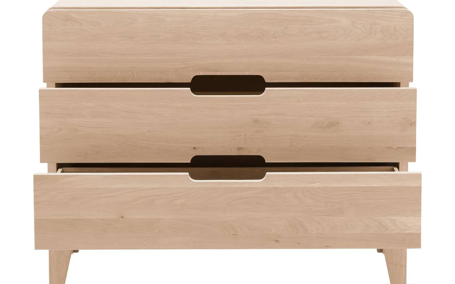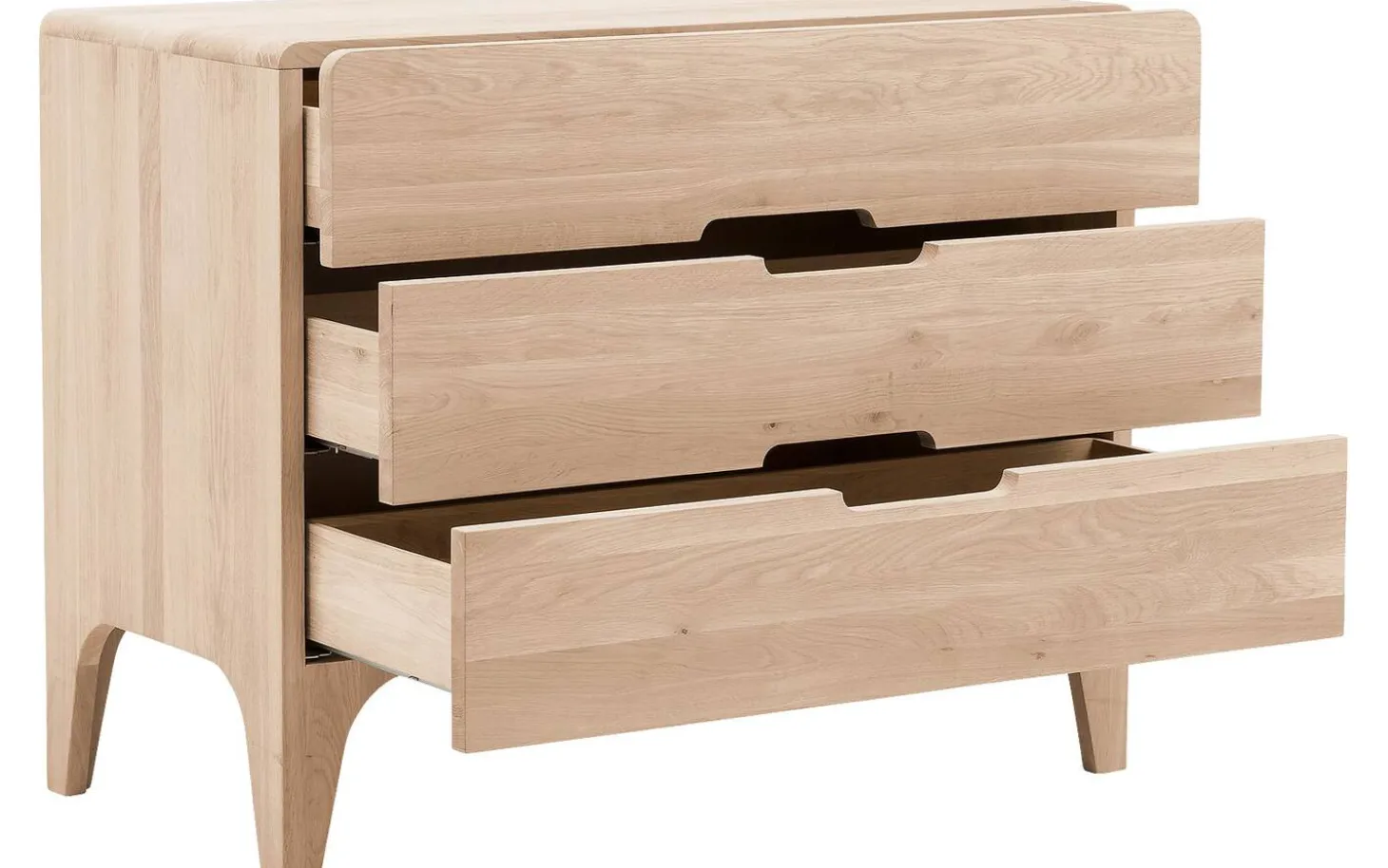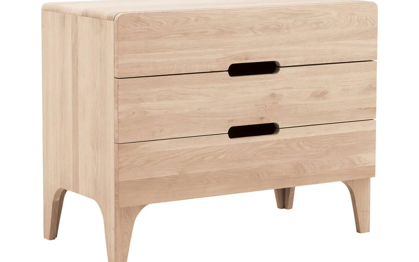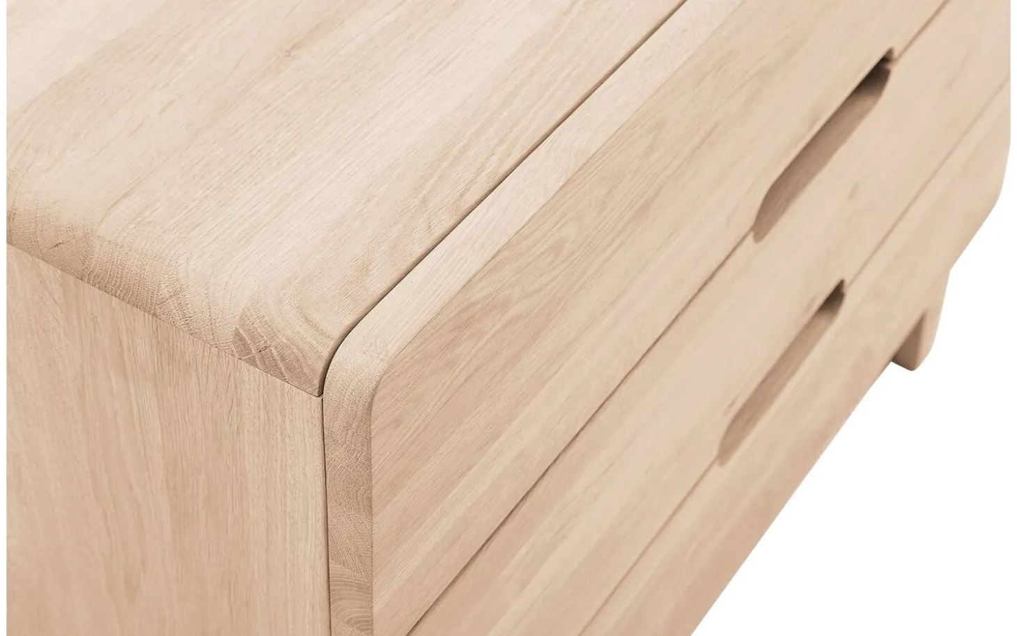 Curve ist eine Kommode mit unverwechselbarem Charakter. Die Kommode mit 3 Schubladen wird mit größter Sorgfalt aus langlebigem Eichenholz gefertigt. Die einzigartigen runden Formen sind ein Beweis großartigen fachmännischen Könnens. Die Schubladen des Schränkchens sind außerdem mit einem Soft-Closing-System ausgestattet. Dieses System gewährleistet ein leichtes und geräuschloses Schließen der Schubladen. Schaffen Sie jetzt die perfekte gemütliche Atmosphäre in Ihrem Schlafzimmer und kombinieren Sie die Kommode Curve mit anderen Möbelstücken aus der Serie Curve.