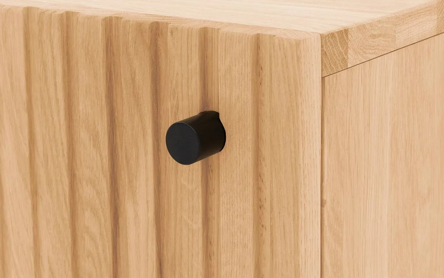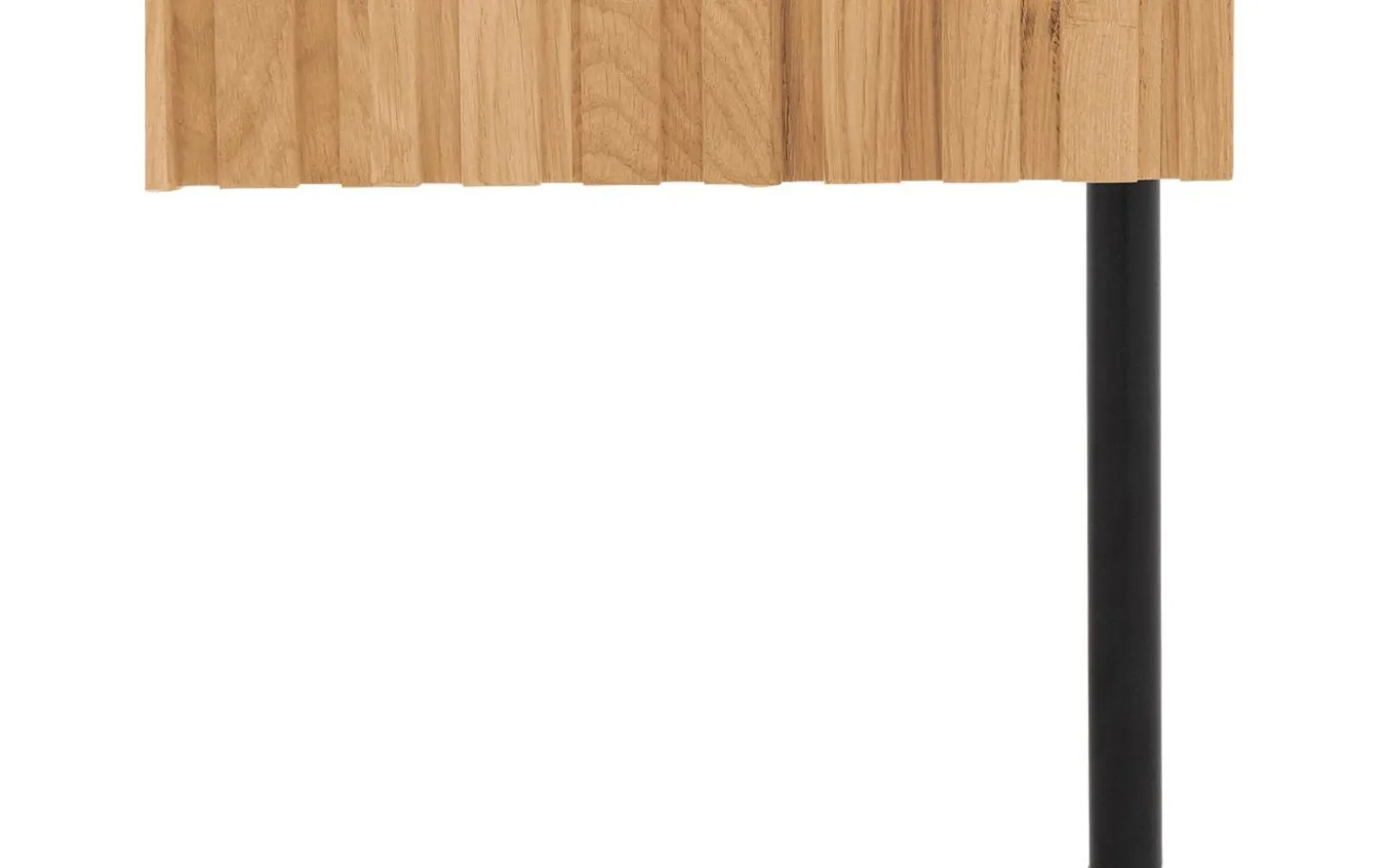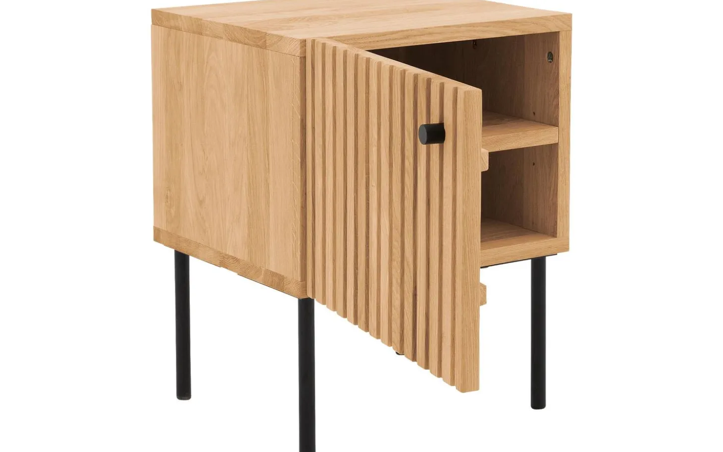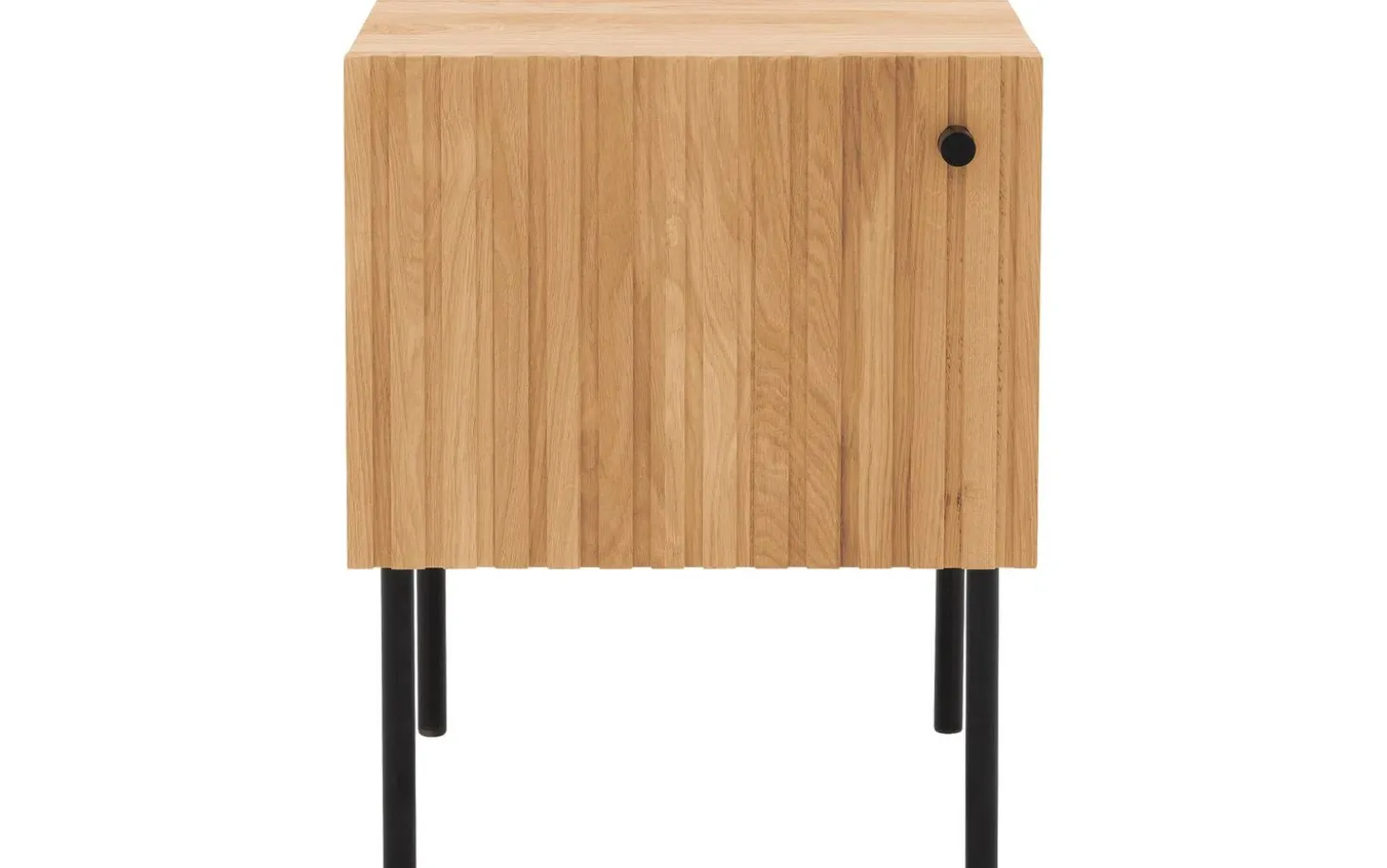 Nachtkastje Capelli heeft een modern design. Bijzonder aan het ontwerp zijn de verticale lijnen in het eikenhout. Dit geeft het nachtkastje in combinatie met de zwarte metalen ronde poten en het bijpassende handgreepje een moderne uitstraling. De hoge poten geven een ruimtelijke look en maken het schoonmaken onder het nachtkastje gemakkelijk.